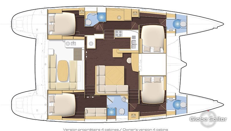 Owner’s version 4 cabins 4 heads (2 electric, 2 manual). This version includes three VIP cabins with a companionway at the forward end of the salon to starboard. The advantage of this layout is an additional cabin identical to the forward port cabin but a slightly shortened owner’s suite. Maximum comfort has been designed into this boat that features a forward cockpit with face-to-face seating, numerous lockers and a full view forward. Facilitating the passage towards the transoms and the foredeck, the aft passerelle is totally independent from the cockpit, the helm station on the flybridge or the main saloon entrance on the same level. The cockpit table can be stowed in the cockpit roof. The Lagoon 500’s helm station is a superb living space with access from each side, lockers, and a long six-seat bench. Six dual AC/Heat systems (3 new CT-10 10BTU units, 1 older unit inop). Six 12V cabin fans. Midea washer/dryer. Sony 6-speaker stereo system (salon and topside). 40″ salon TV, three 24″ cabin TVs, TV antenna.