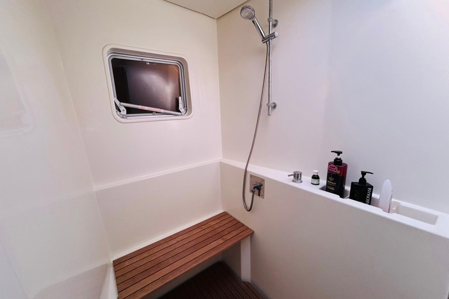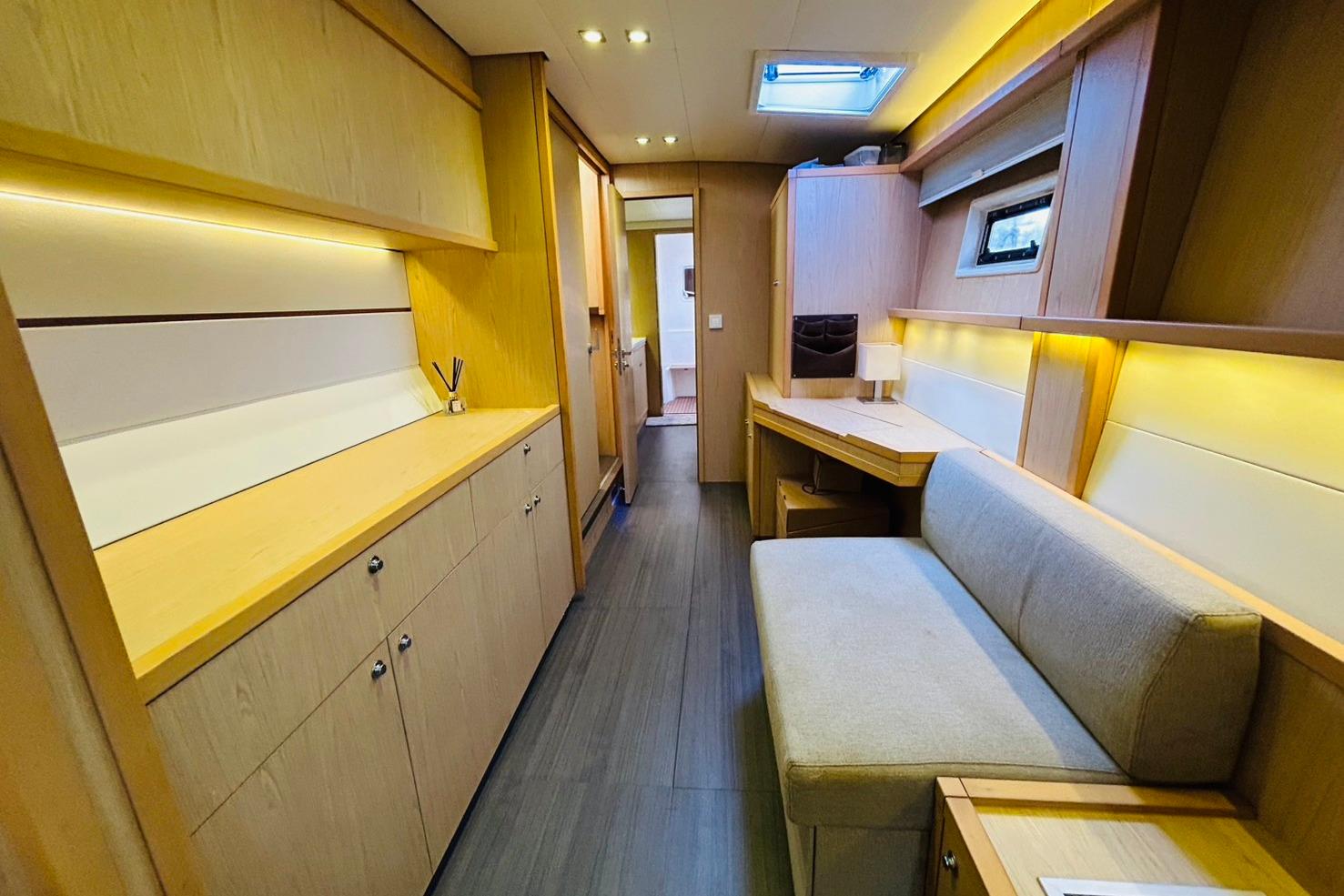 This 3-cabin owner’s version offers a beautifully appointed master suite and two spacious guest cabins — each with private en-suite bathrooms — providing an intimate and luxurious onboard experience. The expansive saloon and open galley are bathed in natural light, creating a seamless connection between the interior and the sea.