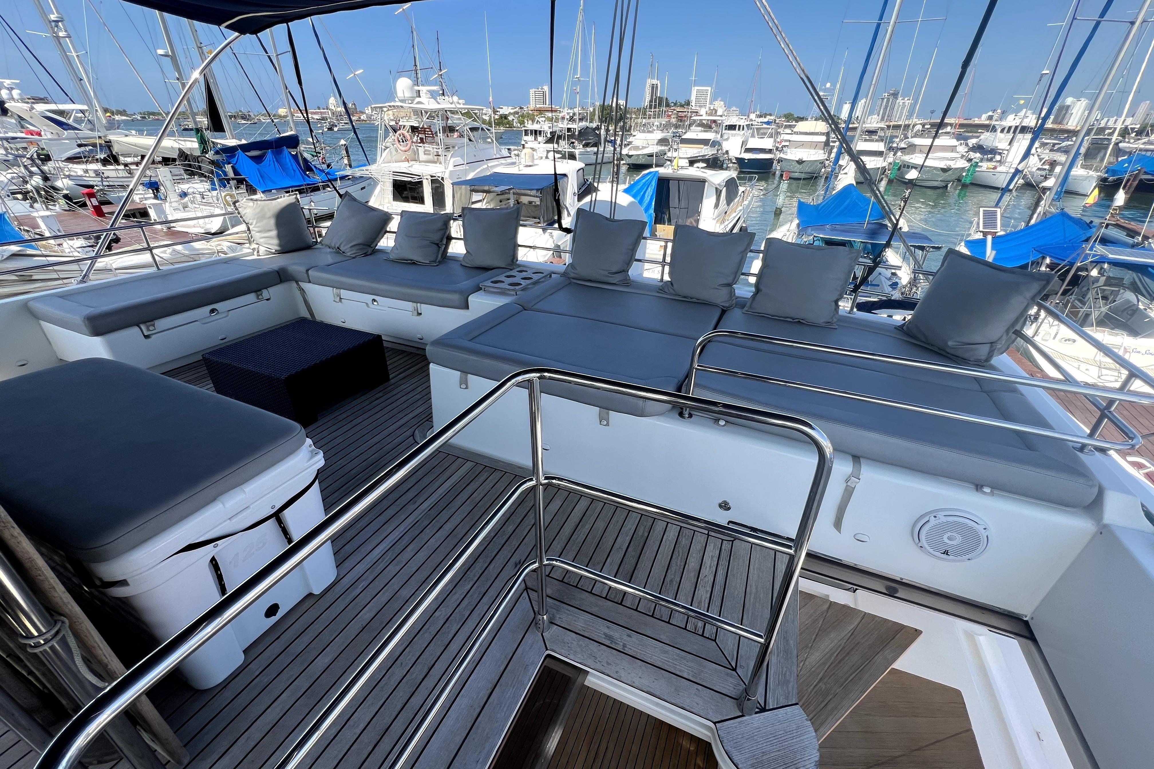 Flybridge completo con puesto de mando elevado y zonas de relax generosas.
