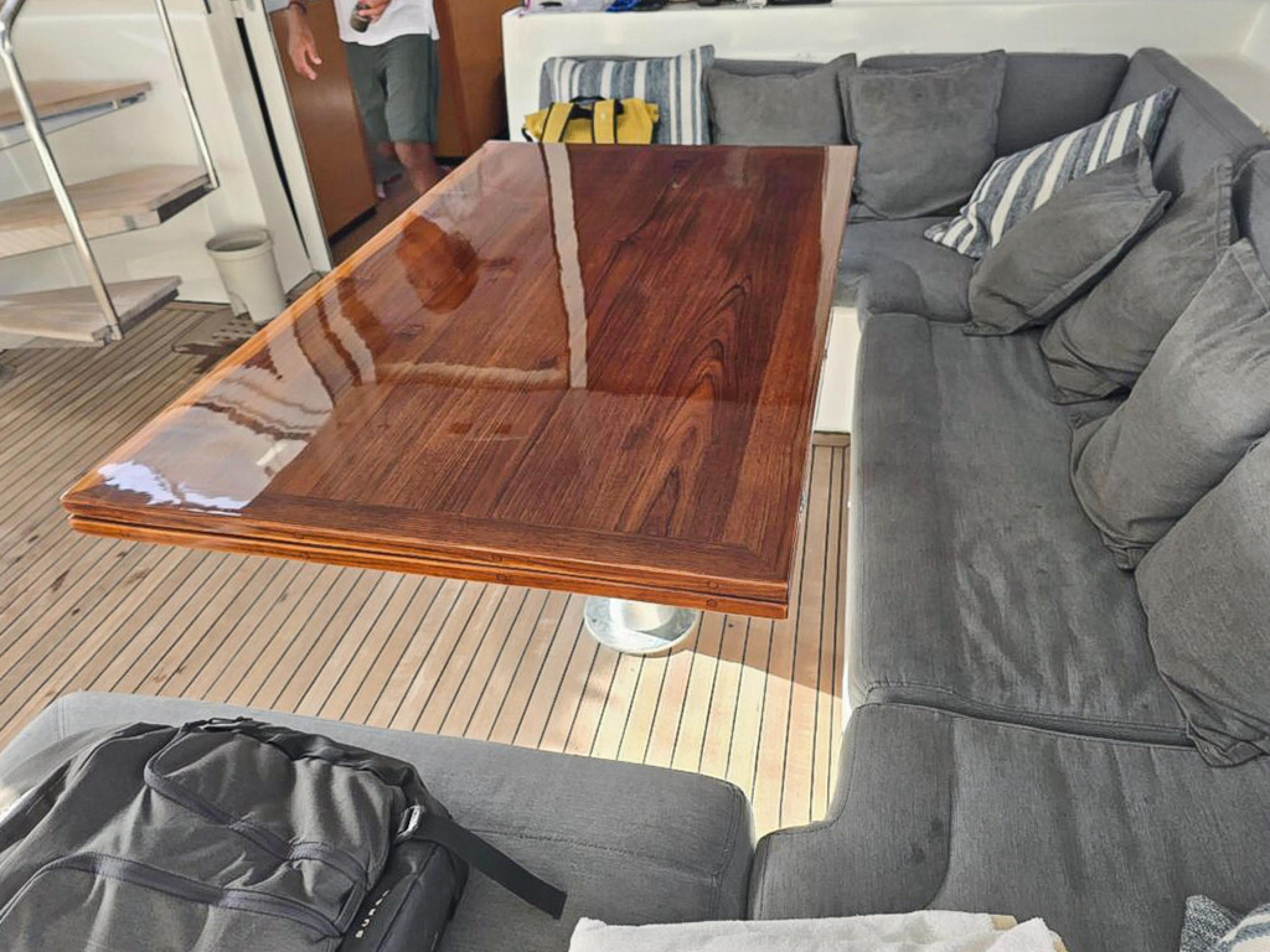 U-shaped cushioned seating in forward cockpit, surrounding teak deck