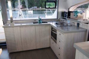 Her unique forward-facing galley stands in front of a large window with an adjacent access door to the forward platform. Aft, a forward-facing settee and dining table are separated from the aft cockpit seating area by sliding glass doors. These doors and windows enhance the open concept feel, allow for exceptional ventilation, and facilitate easy navigation in and around the yacht.