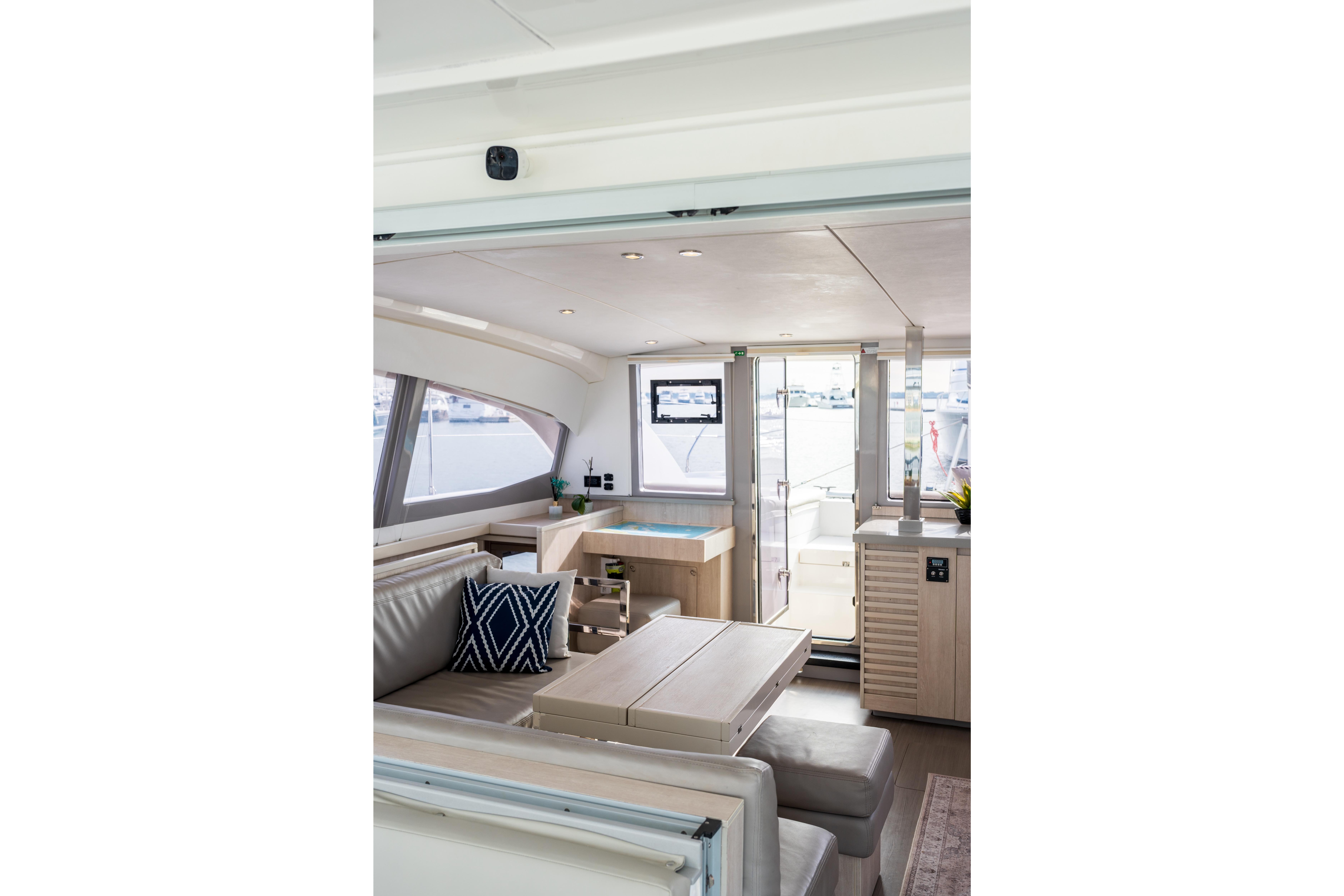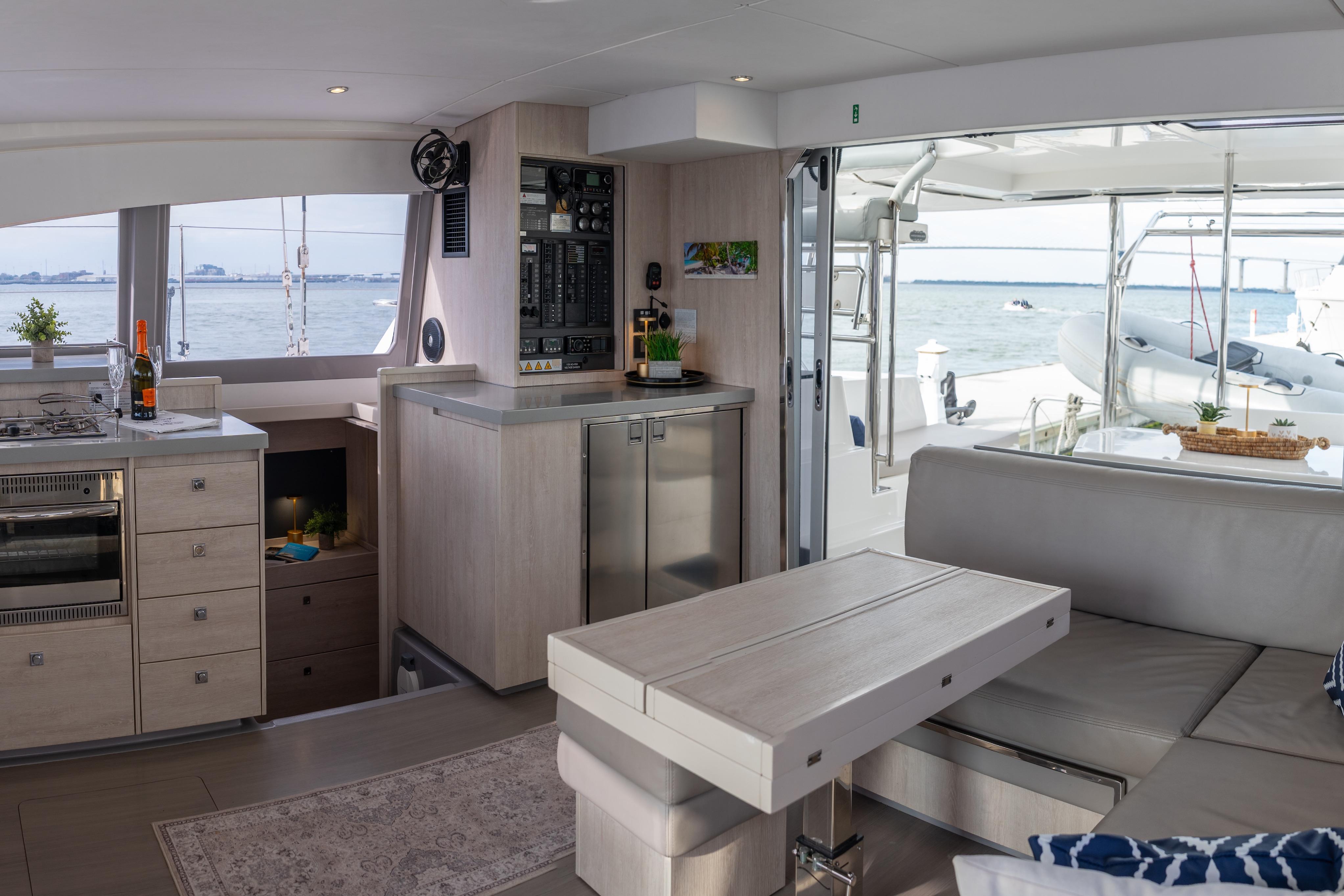 The Leopard 40’s interior design is unlike any Leopard before her. Her galley is located forward and the forward-facing settee and table are now located aft. This allows for a panoramic view with large sliding glass doors between the saloon and the aft cockpit. This arrangement promotes easy communication for guests and an open flow between the saloon and the aft cockpit, and a fusion of indoor and outdoor living space. In addition, the galley area includes a large forward-facing window and an access door to the forward platform of the boat. The access door enhances the open concept feel and easy navigation in and around the yacht. It also promotes ventilation throughout the interior.
