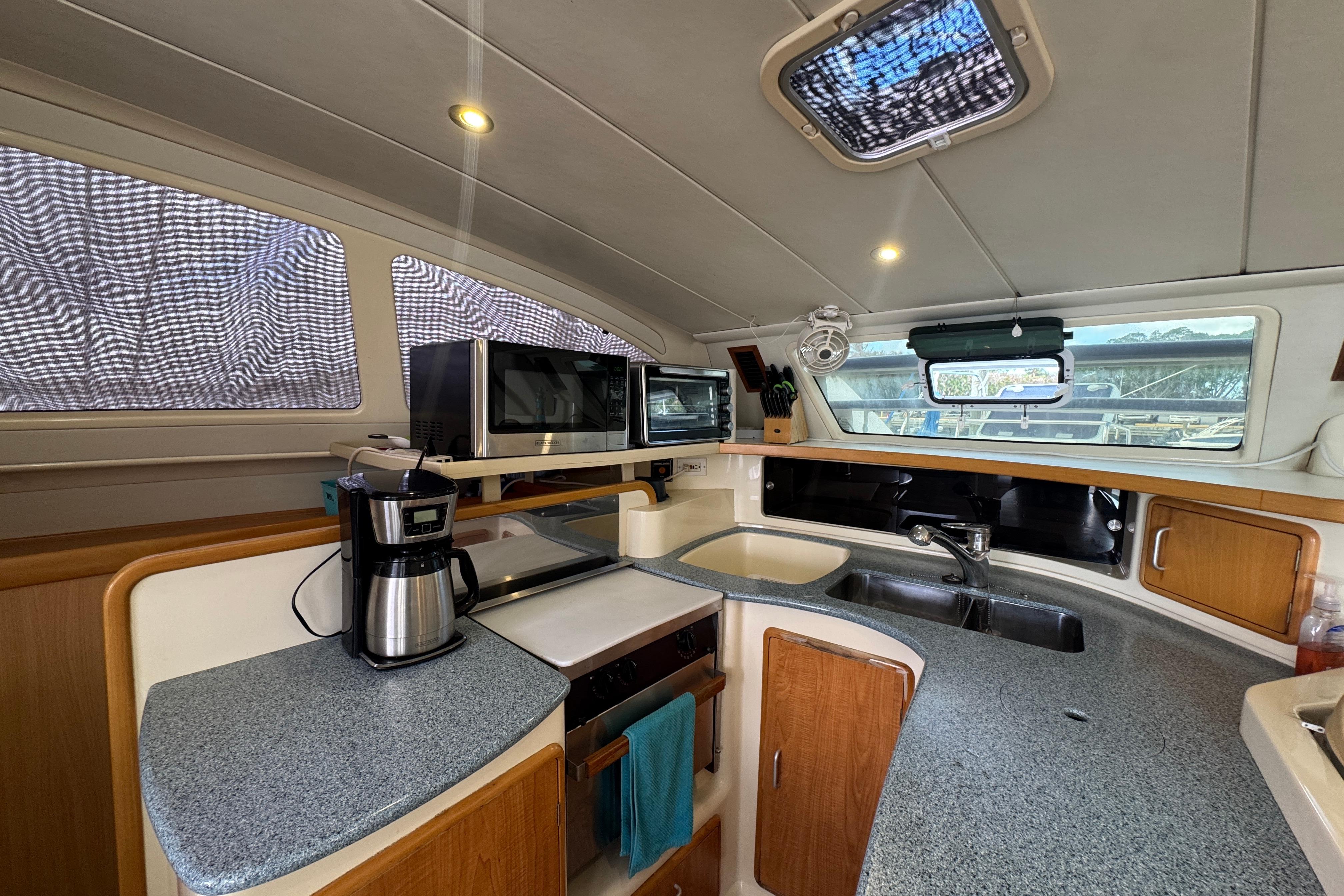 Her custom bluewater mainsail and 130% genoa were installed in 2022, and have seen very light use, giving the next owner nearly new performance from a professionally designed sail plan. Living aboard or cruising in warm climates is made easy with two Dometic reverse-cycle air conditioning units, while the Village Marine SeaQuencher watermaker ensures independence from marina docks. New Leopard factory spec trampolines installed February 2026.