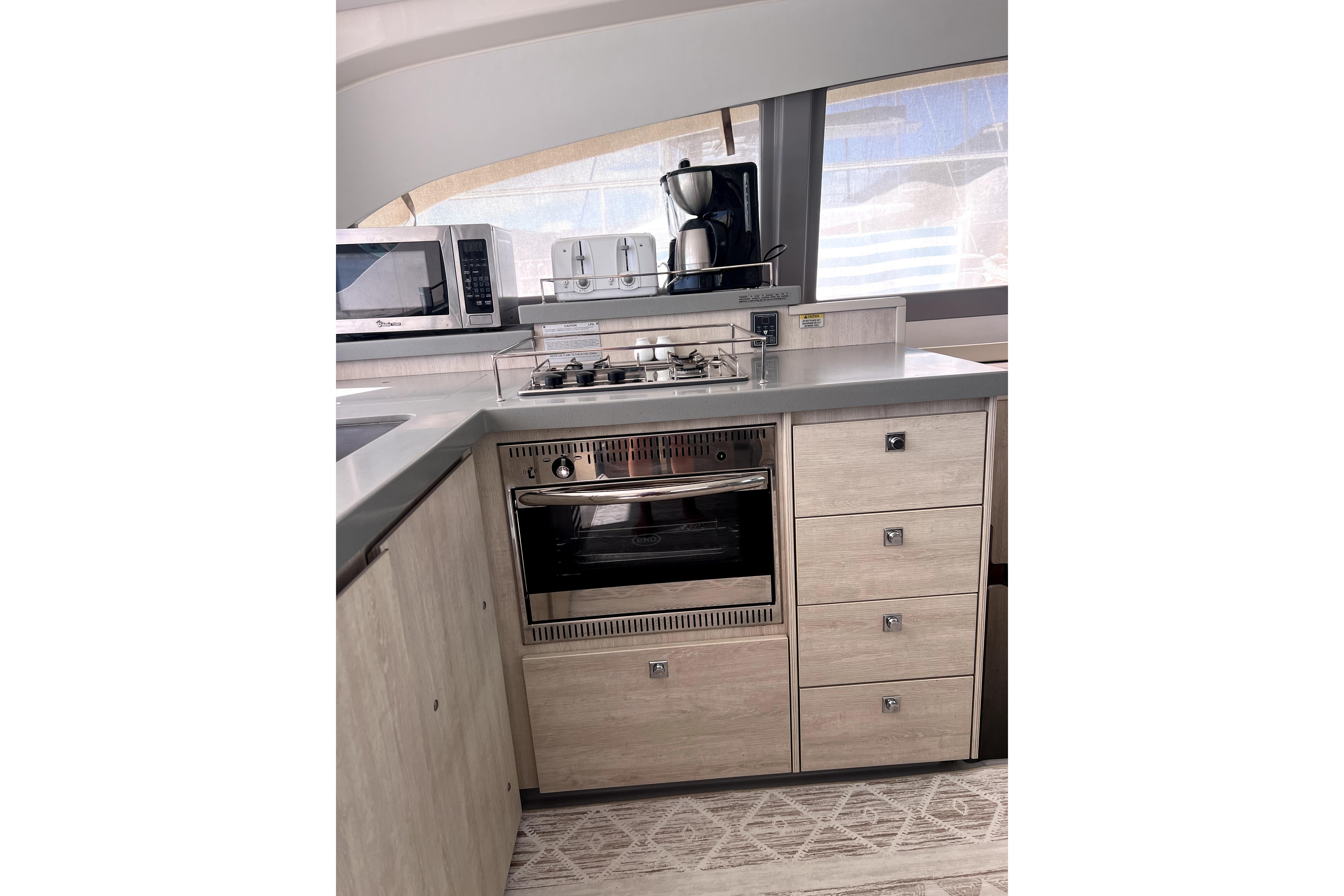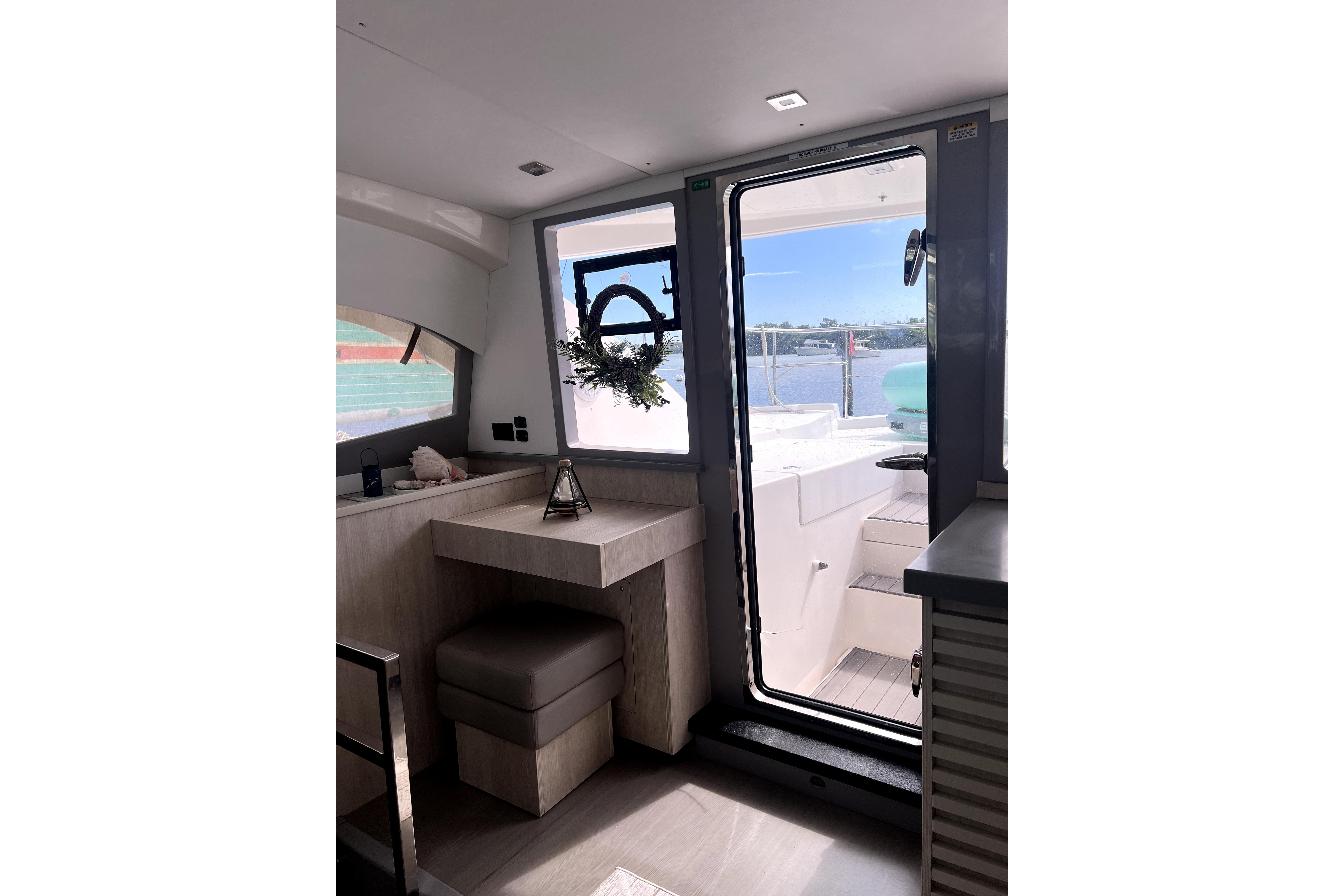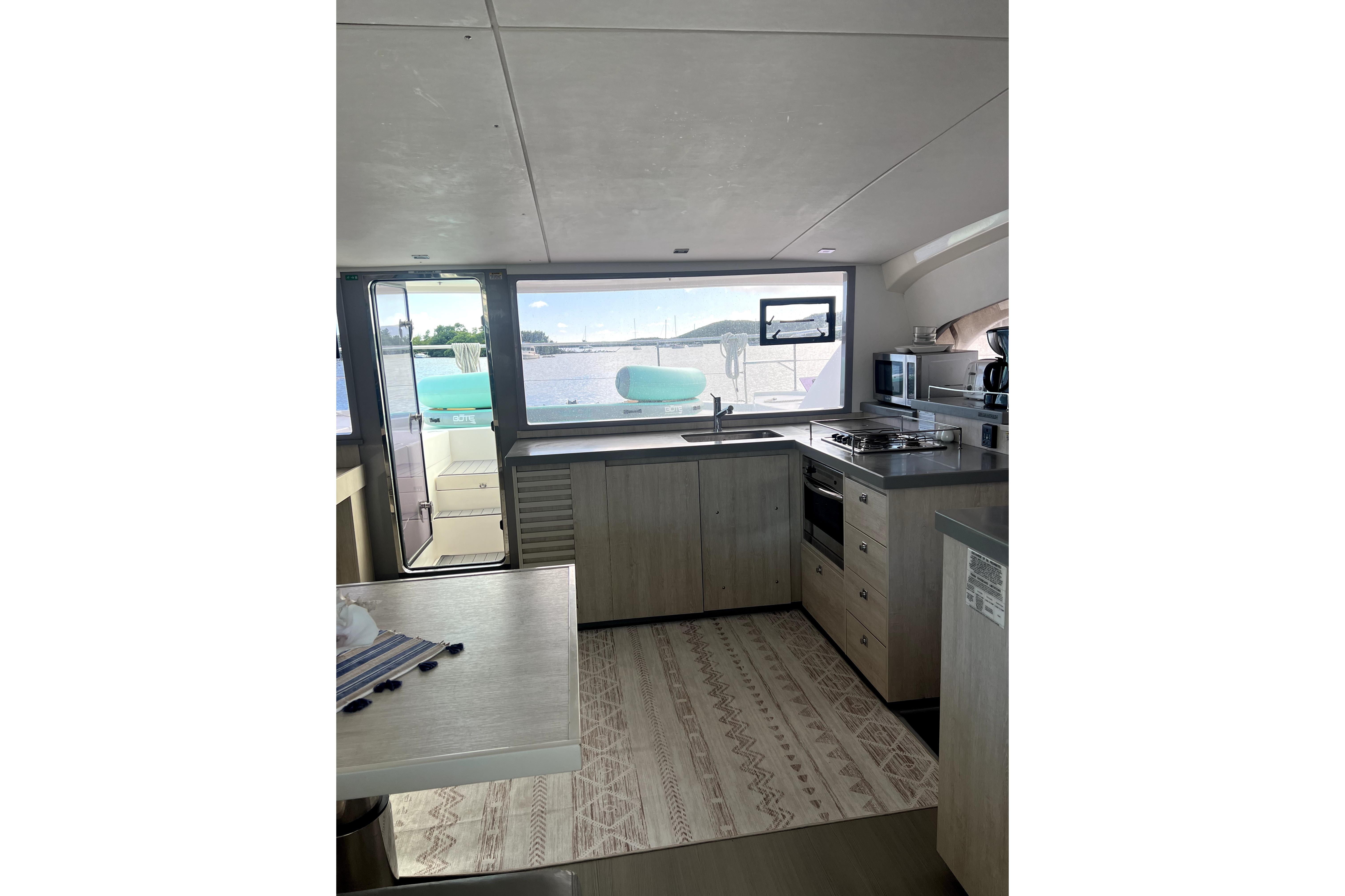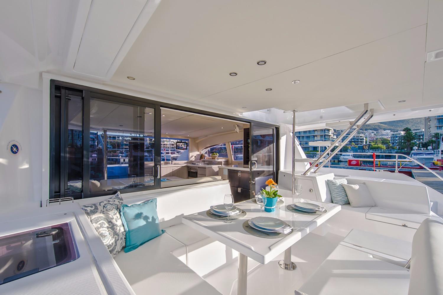 The Leopard 43 PC features a large flybridge which includes a grill, wet bar and direct access to the sunbathing platform found forward. Inside, the galley of this powercat is located forward and the forward-facing settee and table are now located aft. This layout, with sliding glass doors between the settee and aft cockpit seating area, plus a large window forward and access door to the bow, allow for nearly 360-degree panoramic views and create a feeling of continuous indoor-outdoor living space.