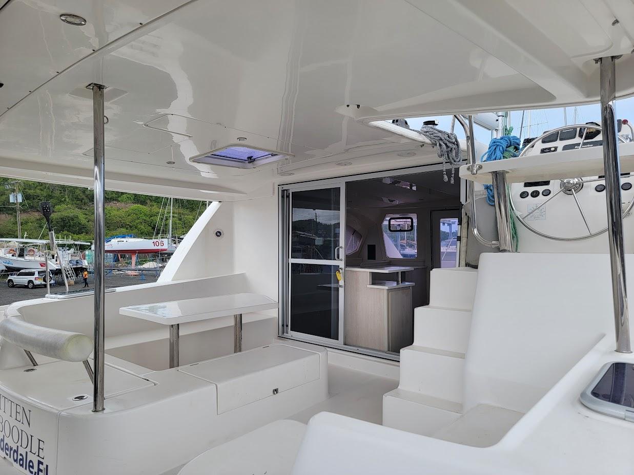 When first introduced, this innovative design with two cockpits - forward and aft - won "Boat of the year". The four cabin version was sold exclusively into the Sunsail / Mooring fleet and quickly becoming a charter favorite. The current owners bought her fresh out of the BVI fleet. Named "Kitten Caboodle" after the famous Jellycat brand by the previous owners daughter. Cute!