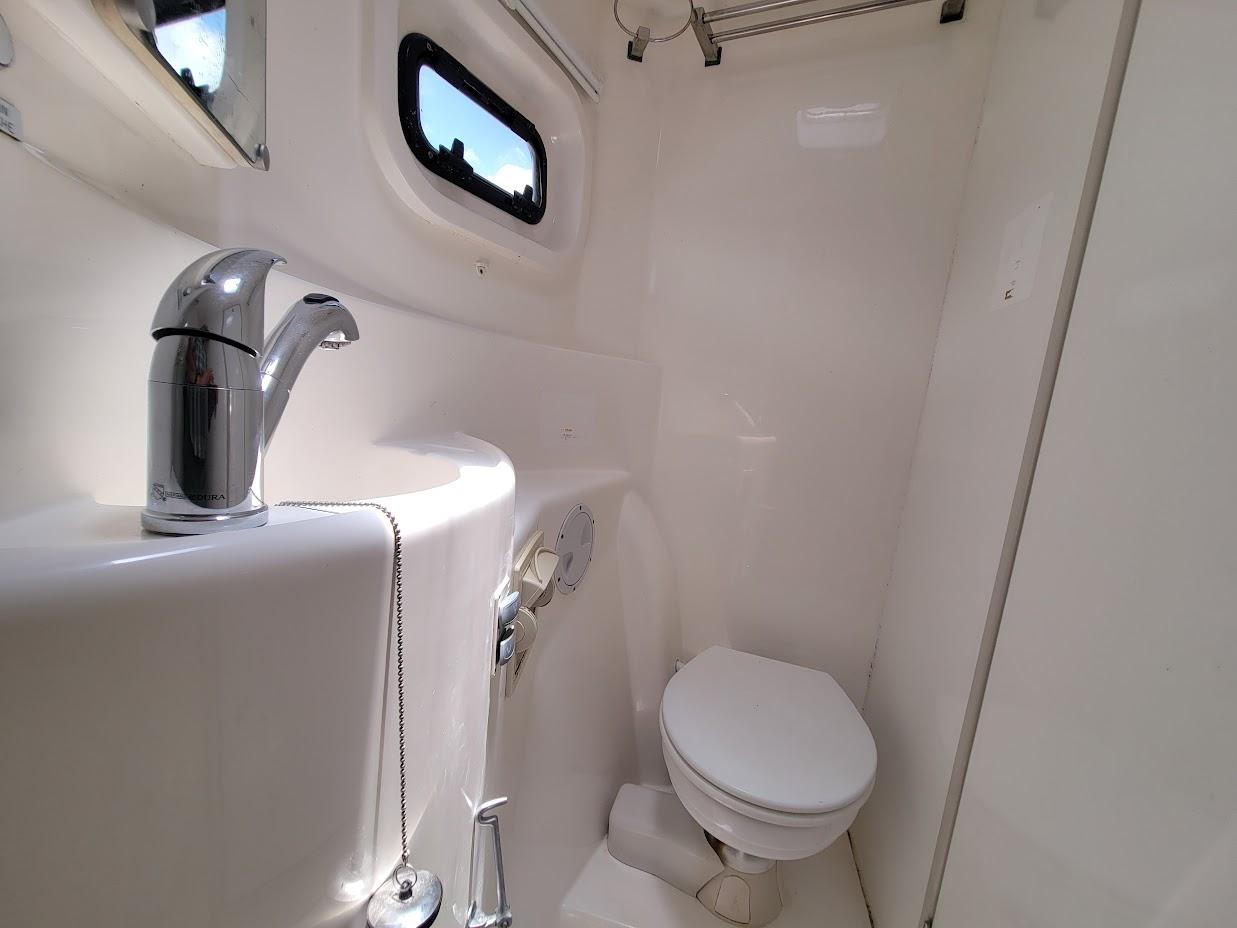 There is plenty of lounging space for everyone - in or out of the sun. The raised helm, located starboard, makes an excellent workspace for the captain without feeling too left out. This also allows for a view of all corners. The bench style seat is more than enough room for two.