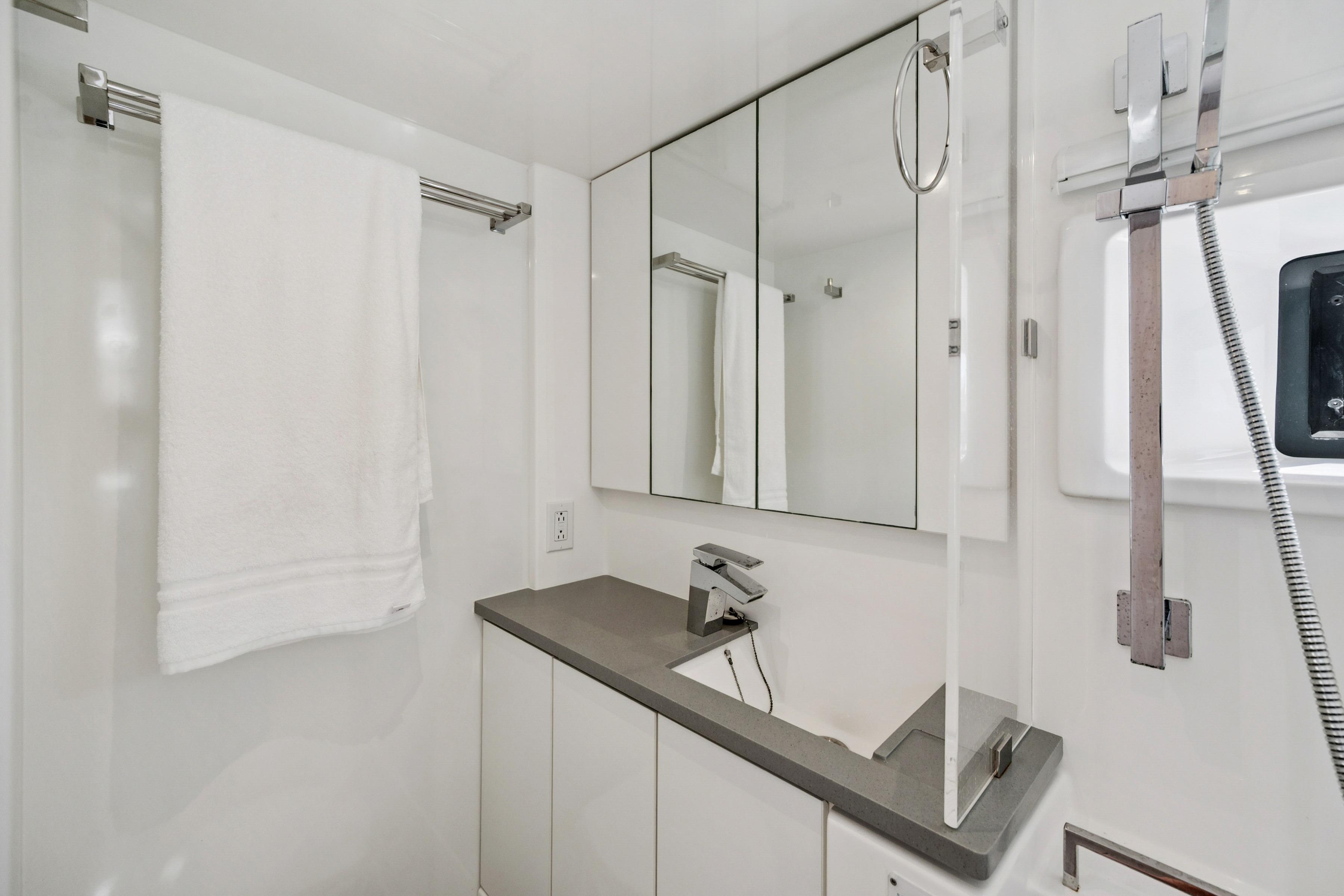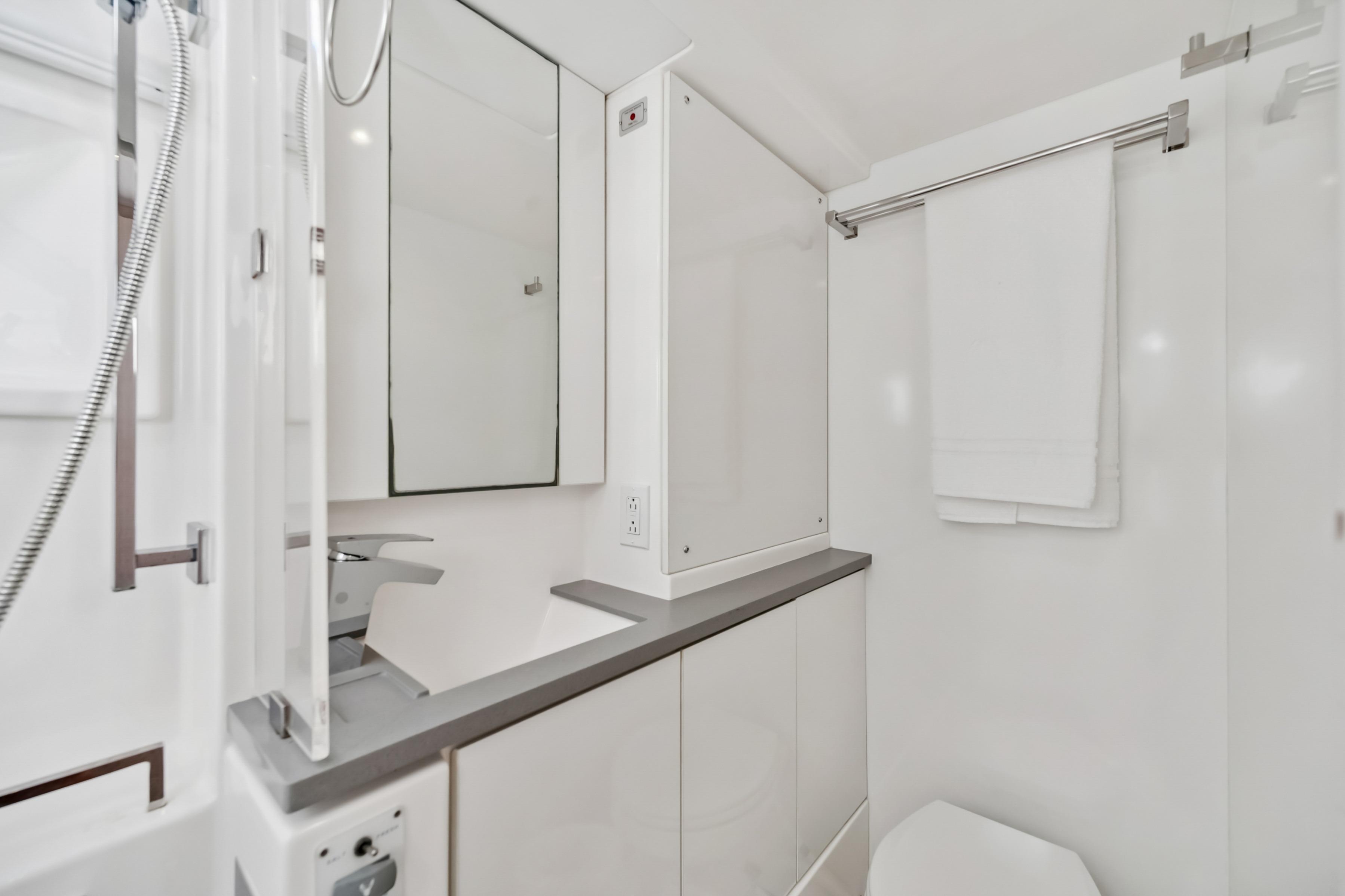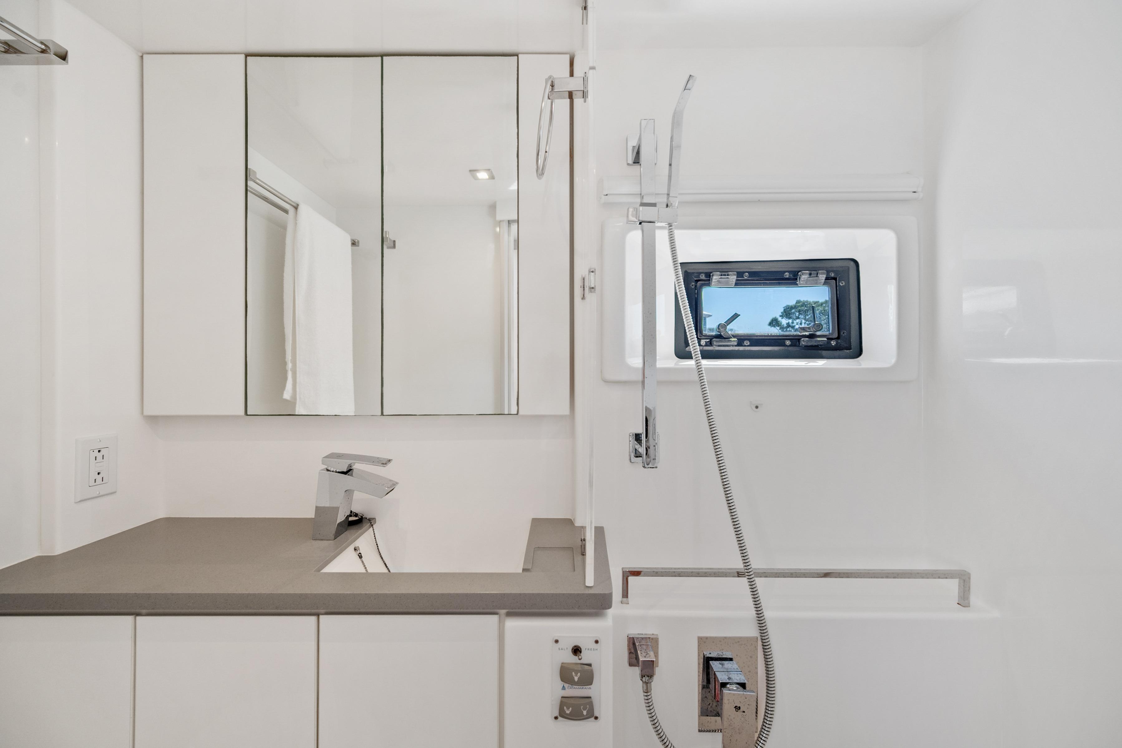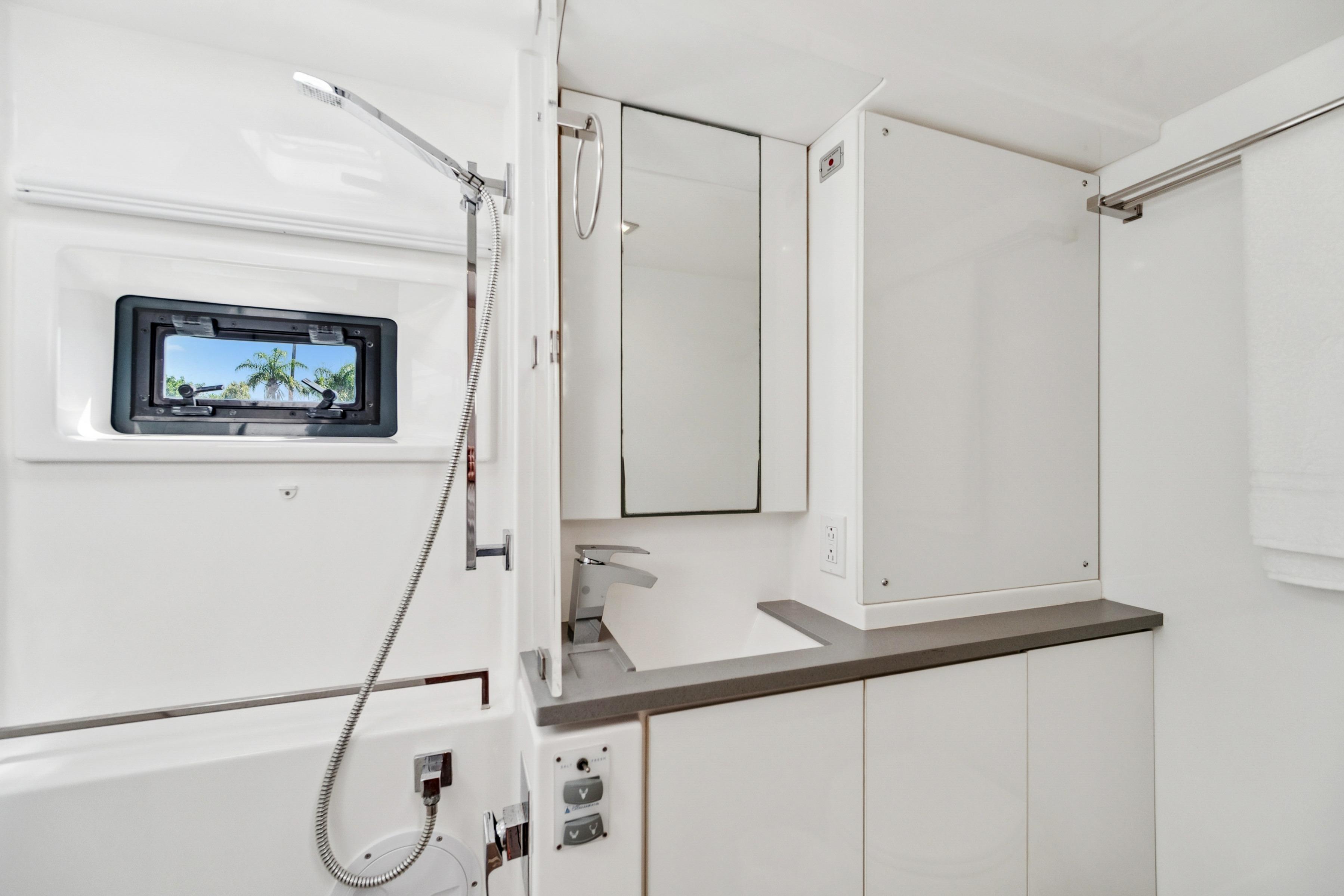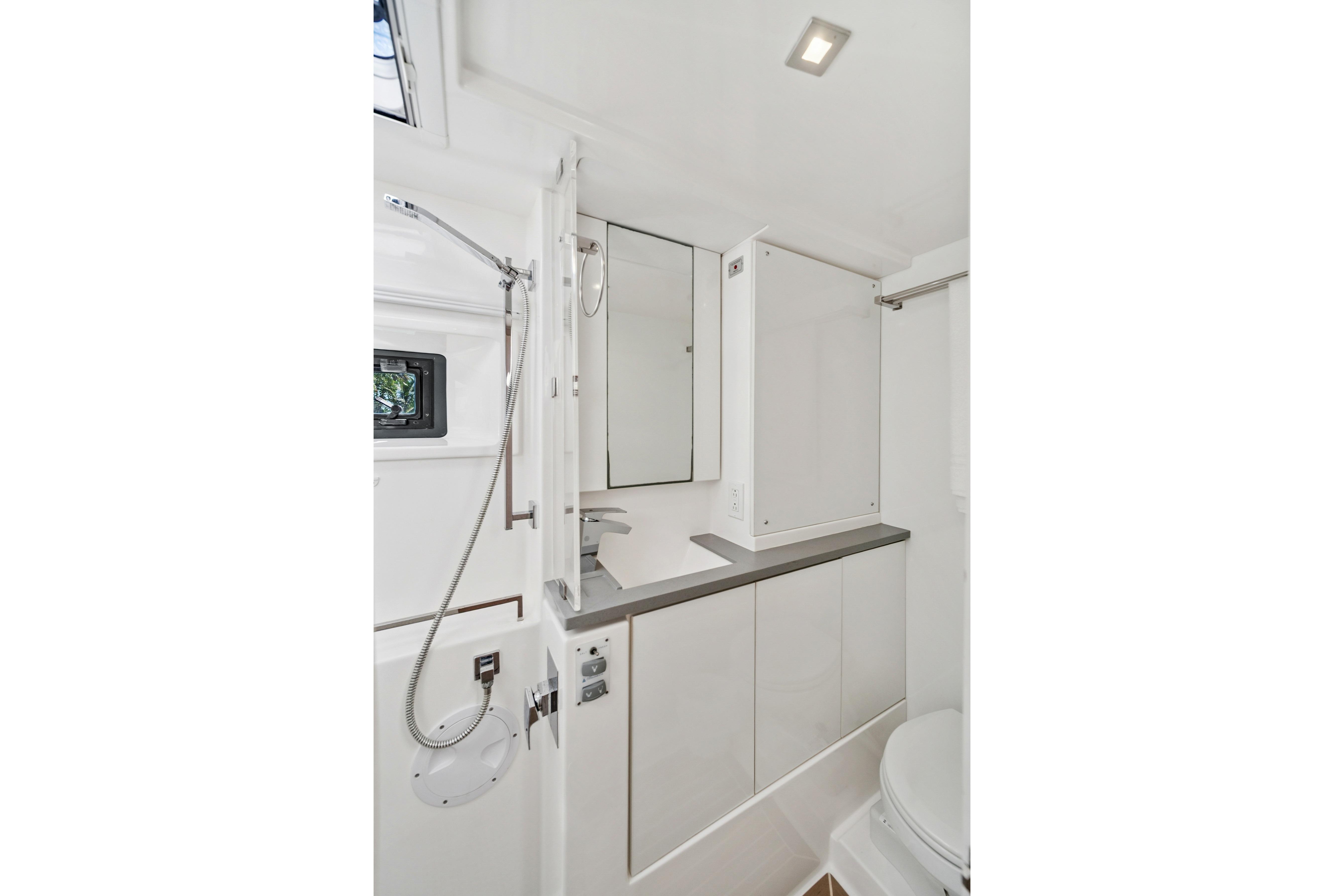 Master Head – forward with fiberglass vanity, storage, toilet, and shower