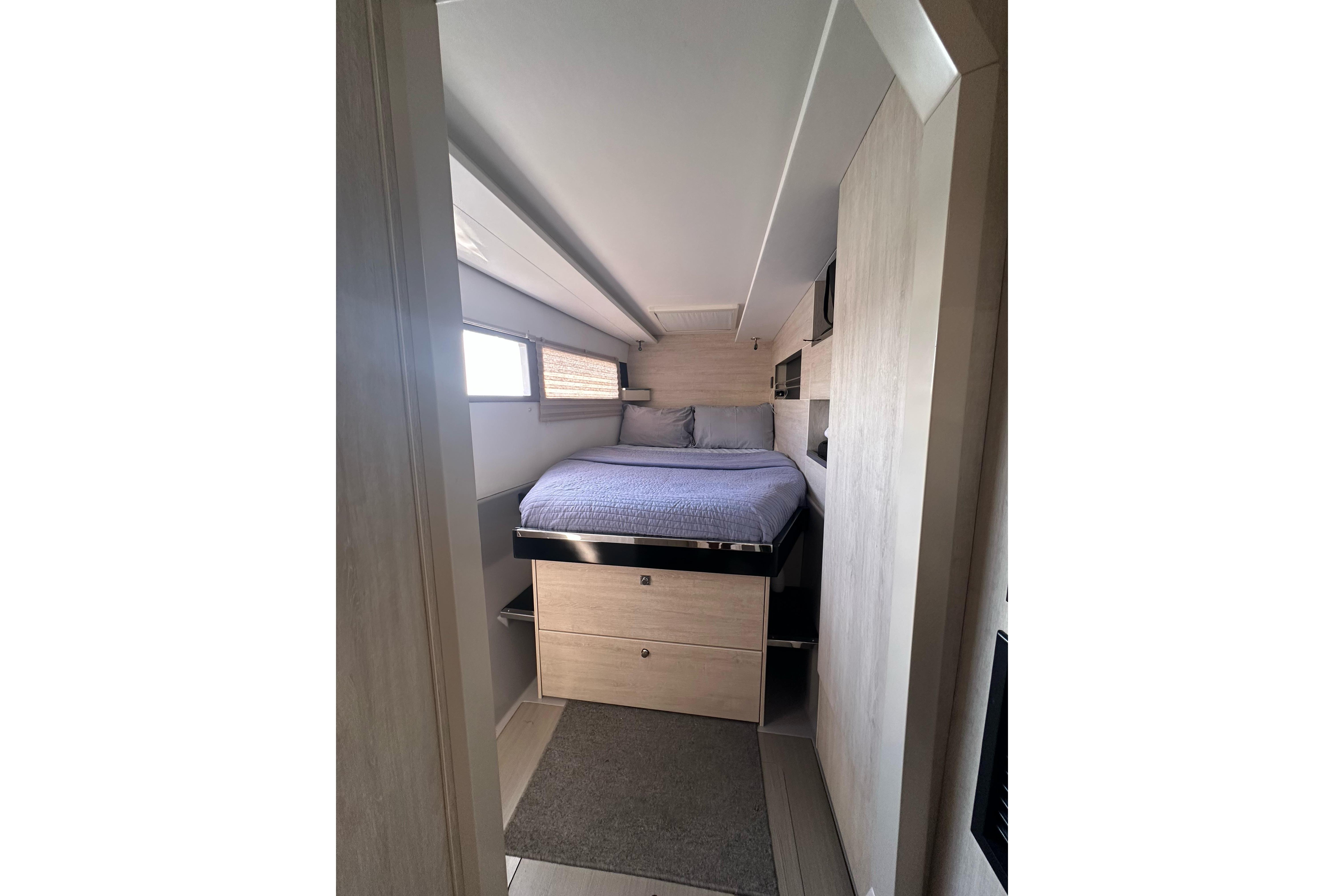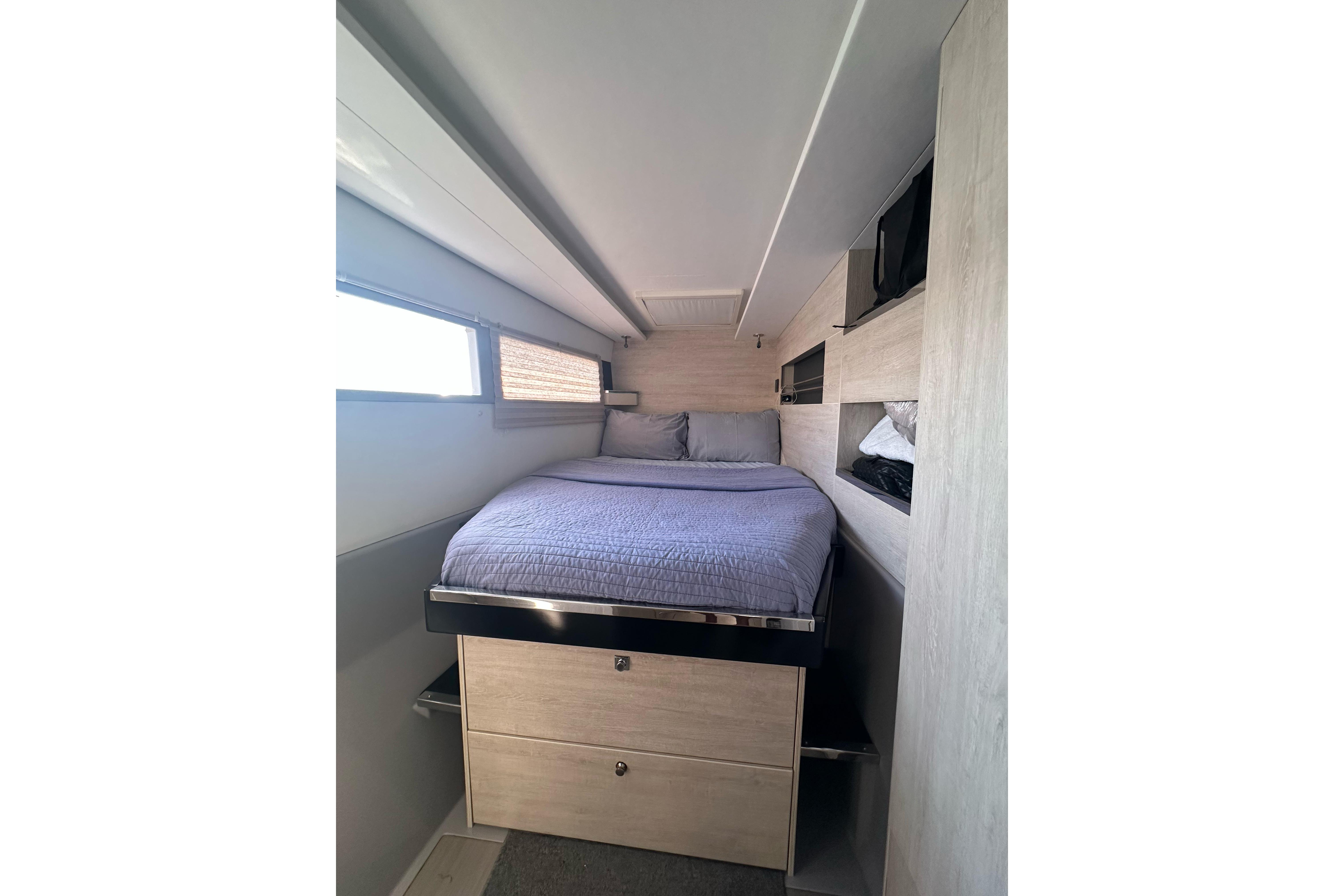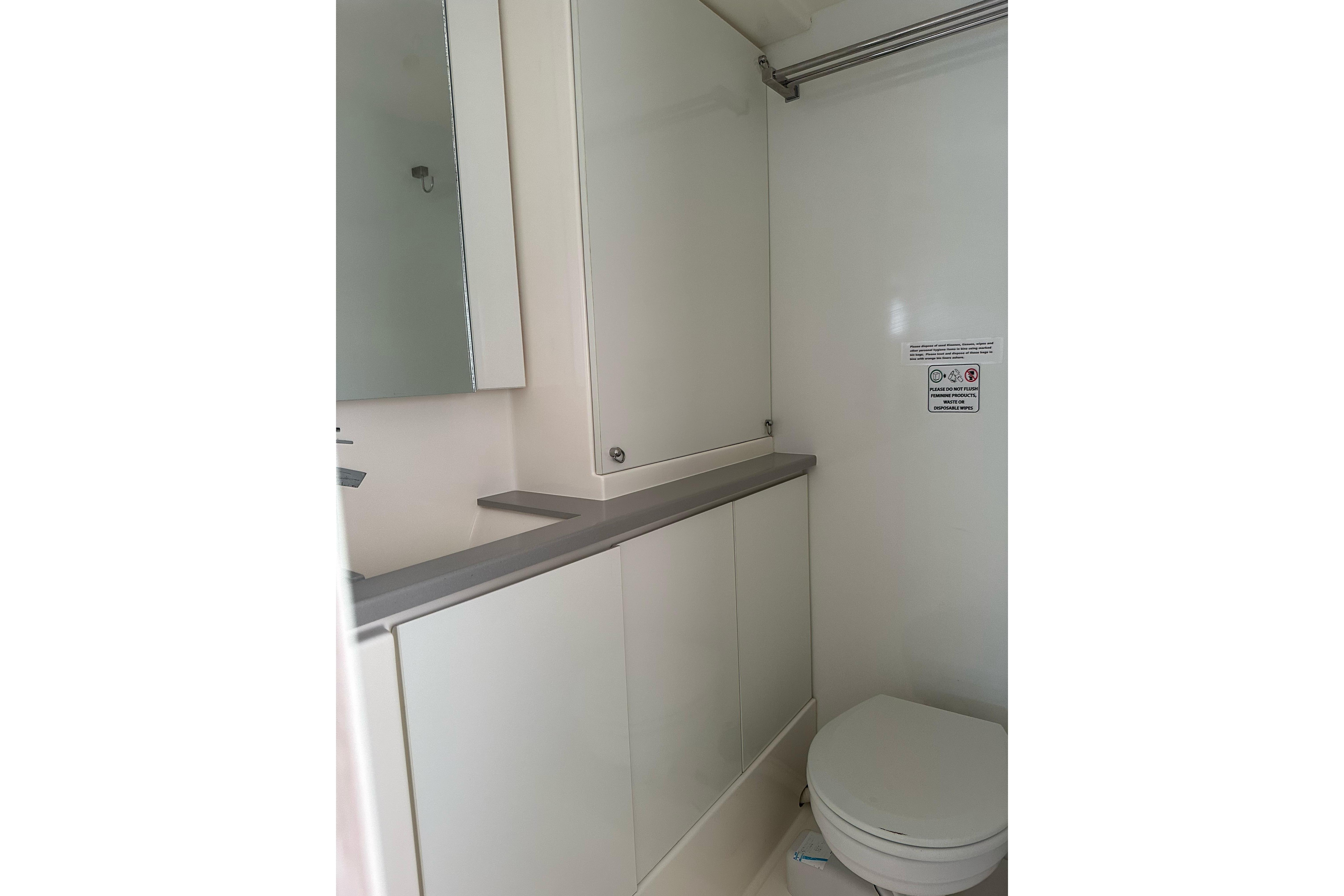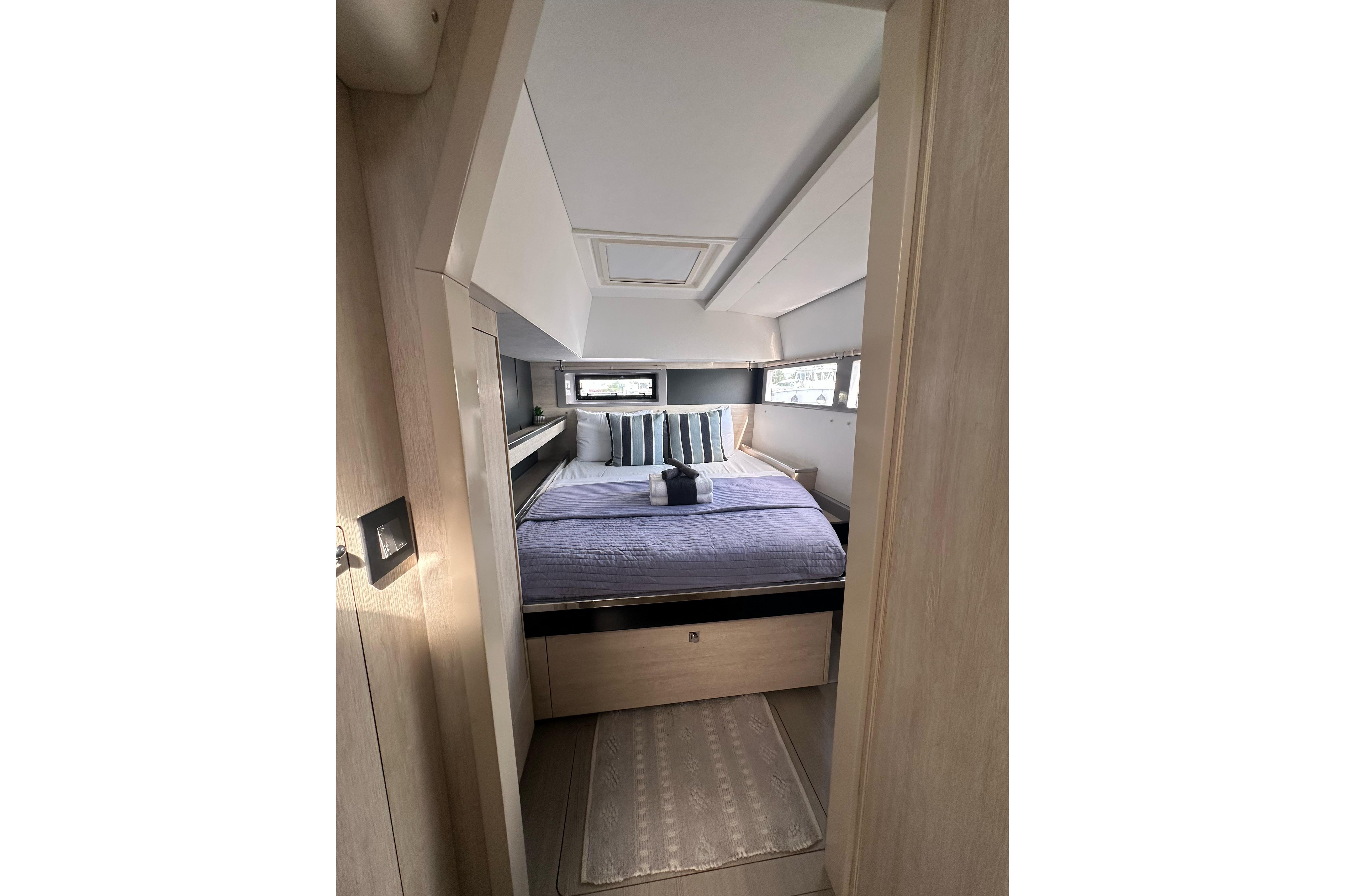 Onboard entertaining is accentuated with ample dining space, and forward facing L shaped seating communicating directly with the galley, situated forward. Wide sliding saloon doors afford panoramic views towards the stern, allowing the interior saloon to flow naturally towards the outside aft and forward cockpit.