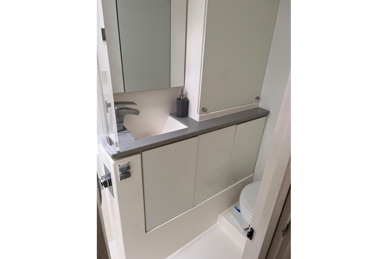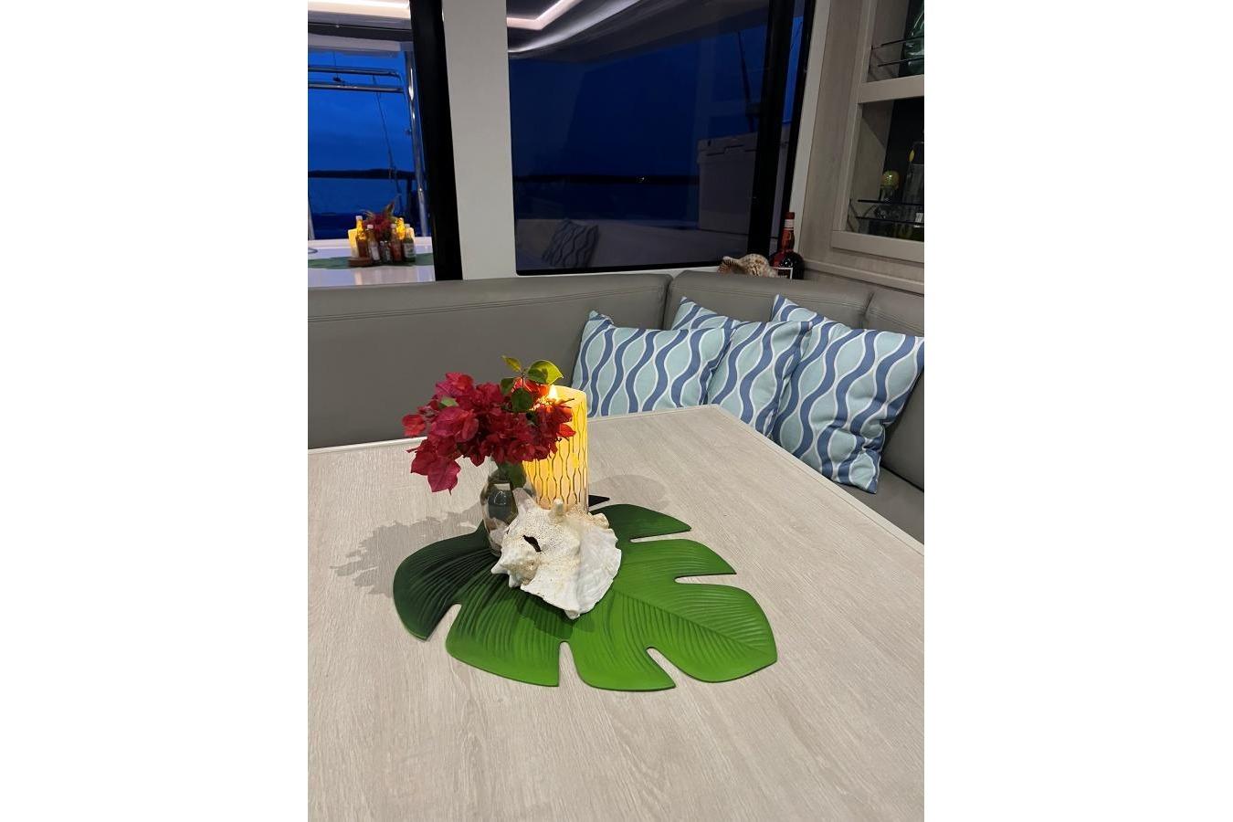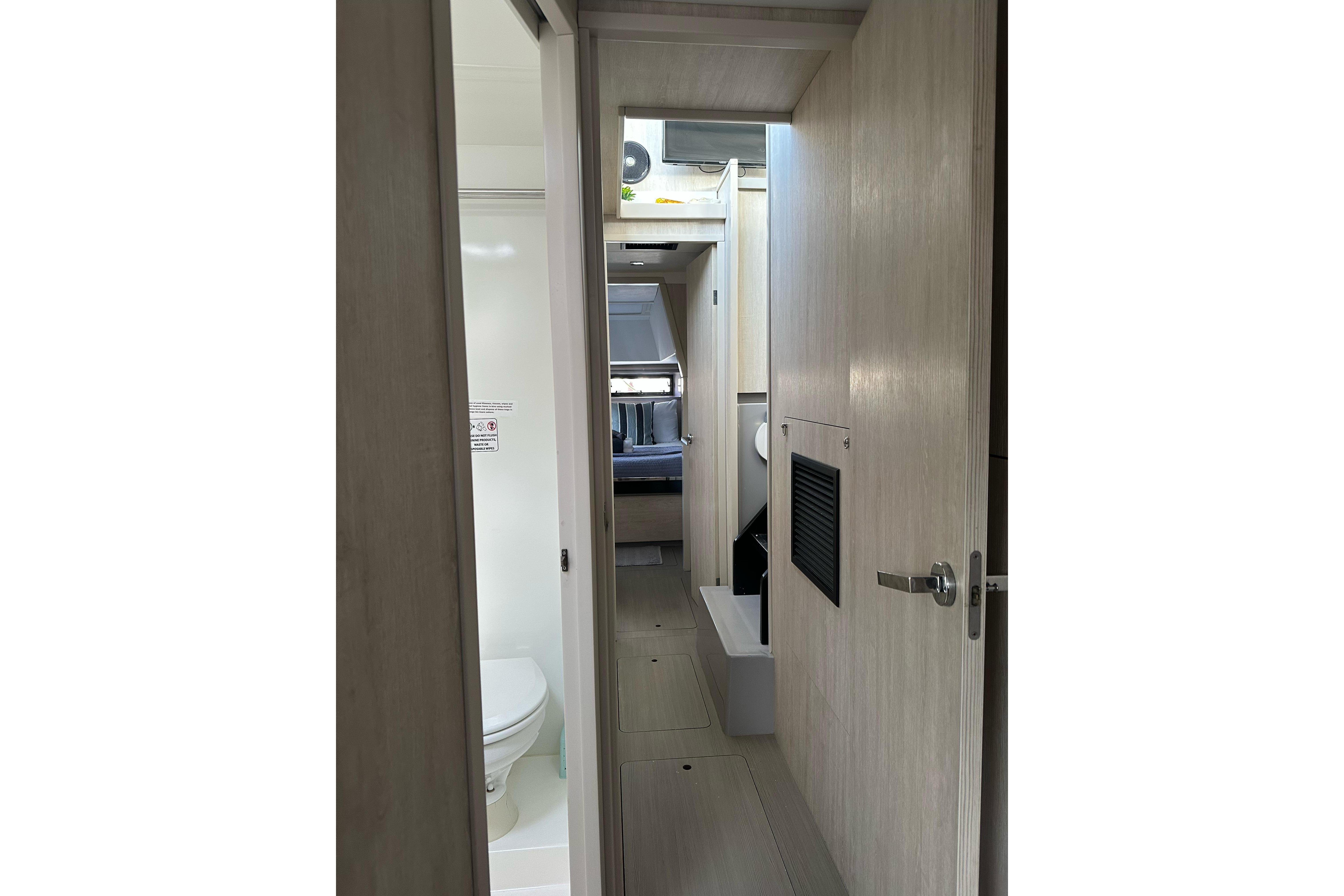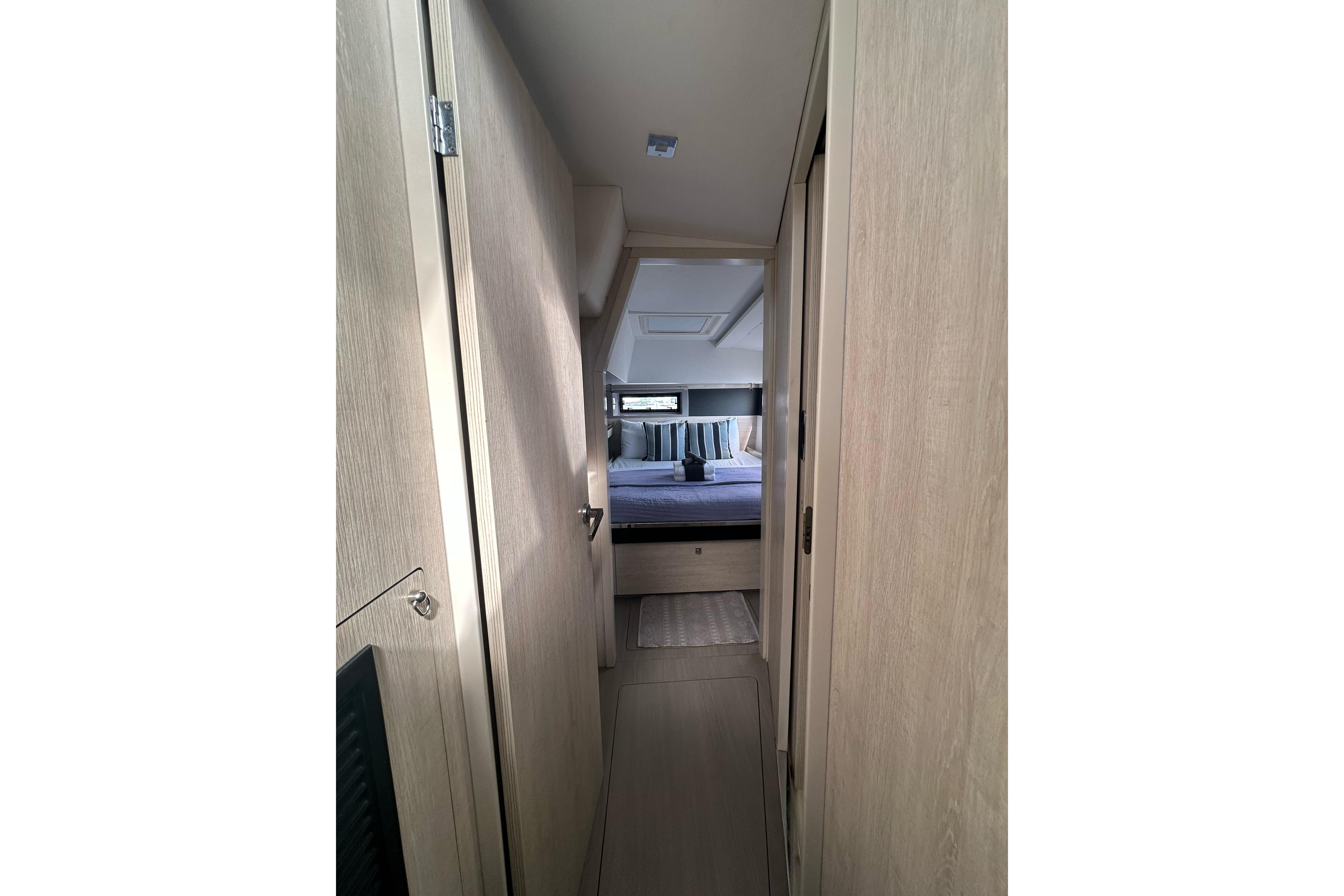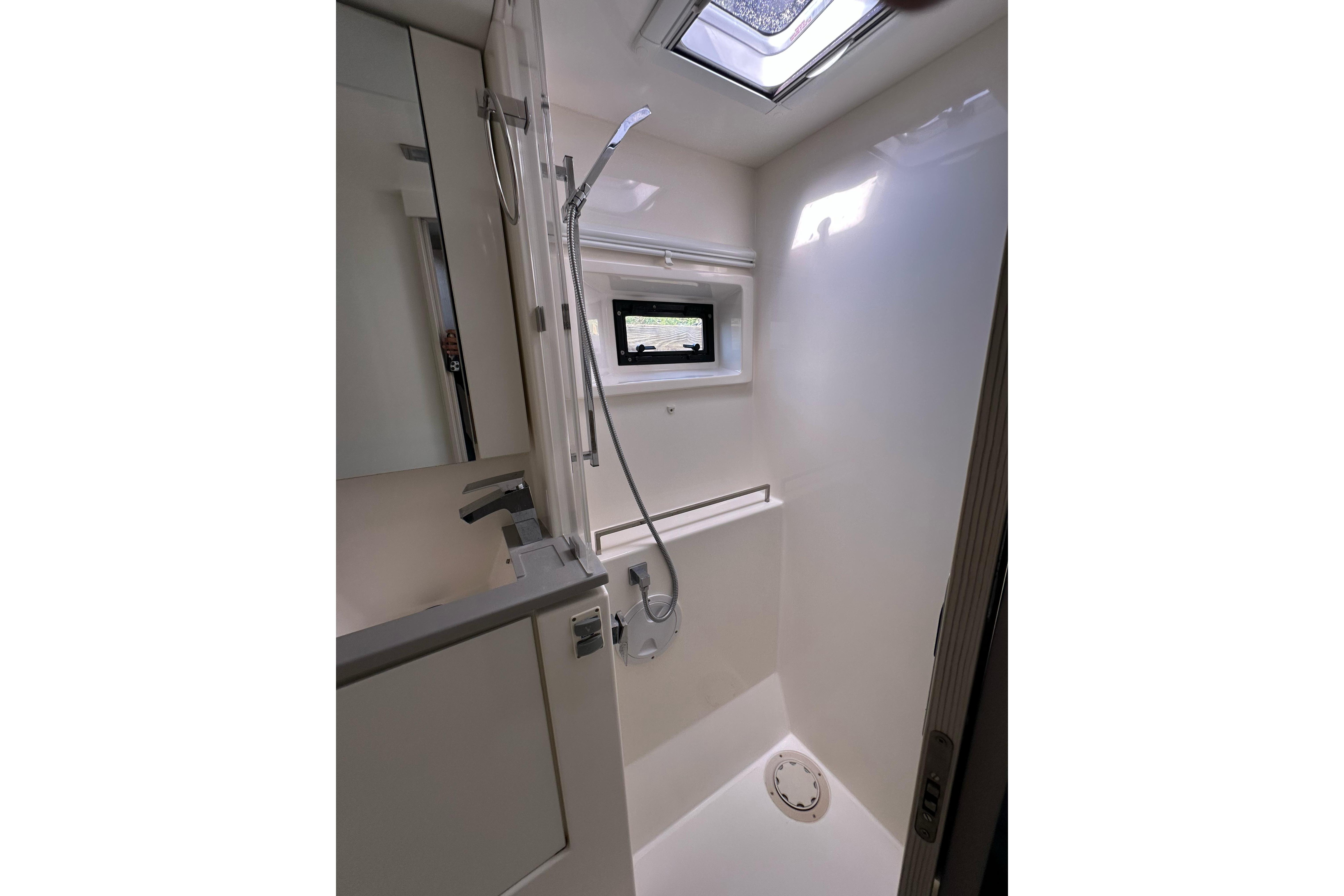 Onboard entertaining is accentuated with ample dining space, and forward facing L shaped seating communicating directly with the galley, situated forward. Wide sliding saloon doors afford panoramic views towards the stern, allowing the interior saloon to flow naturally towards the outside aft and forward cockpit.