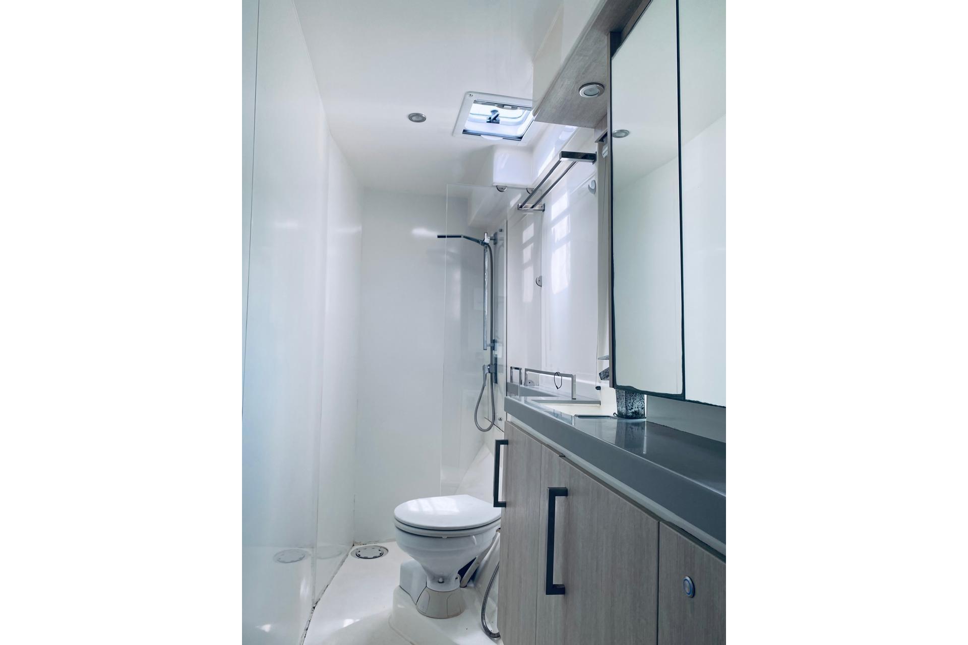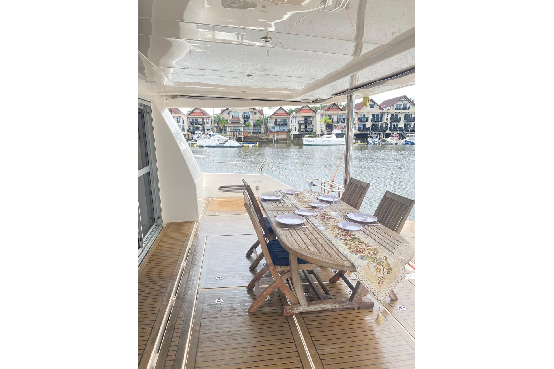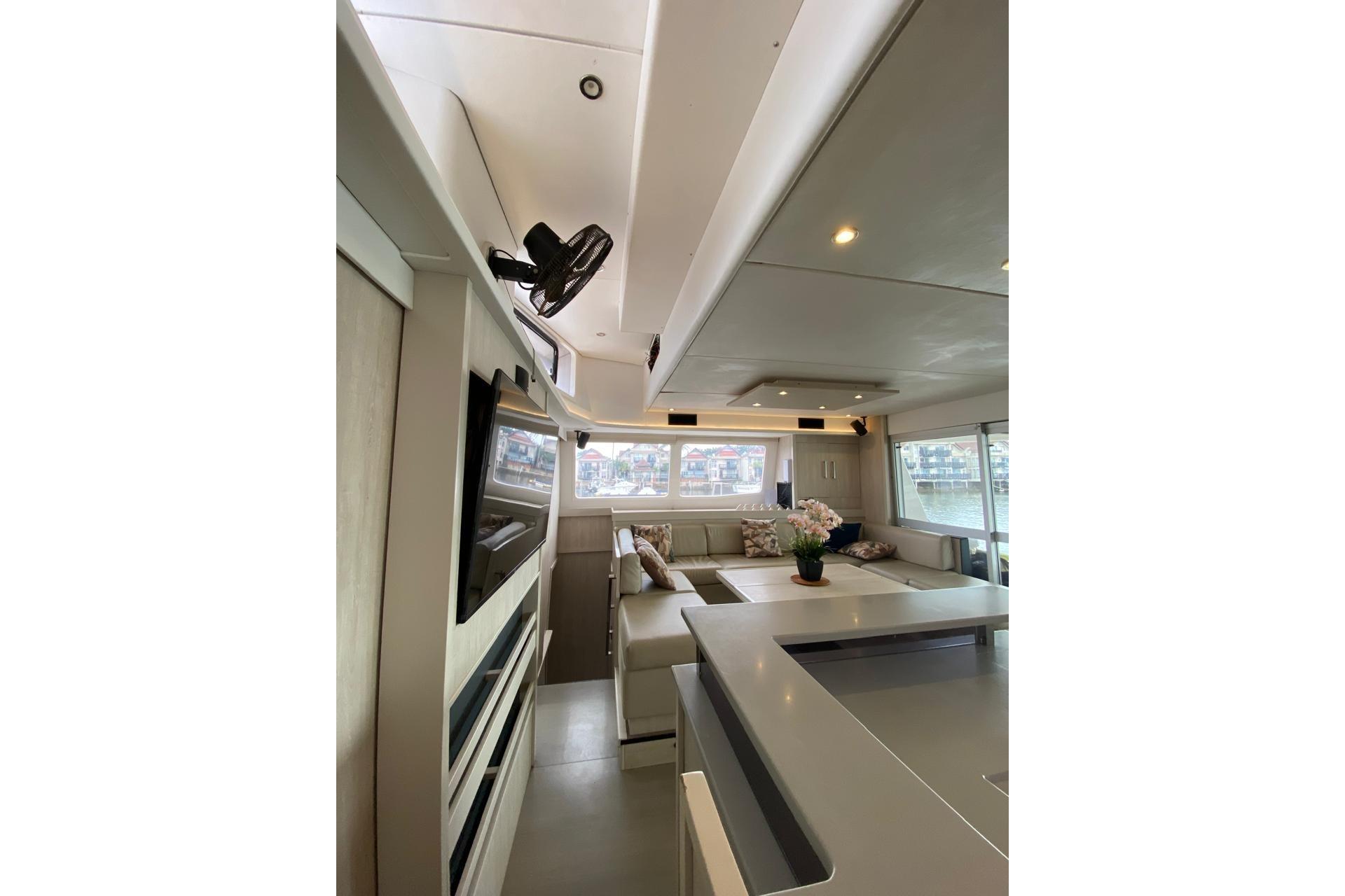 Currently located in Richards Bay, South Africa, this vessel presents as a clean example overall and appears to have been lightly used. The interior accommodations remain in sound condition with upholstery, headliners, blinds, and soft goods showing minimal wear. The yacht features six guest cabins, each with its own ensuite head, plus an additional crew cabin forward in the port hull. The owner’s suite occupies the starboard hull and offers generous space and privacy.