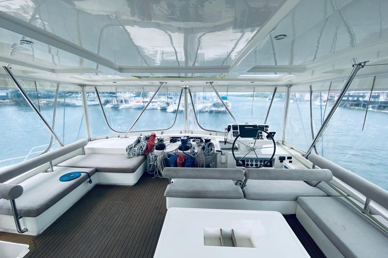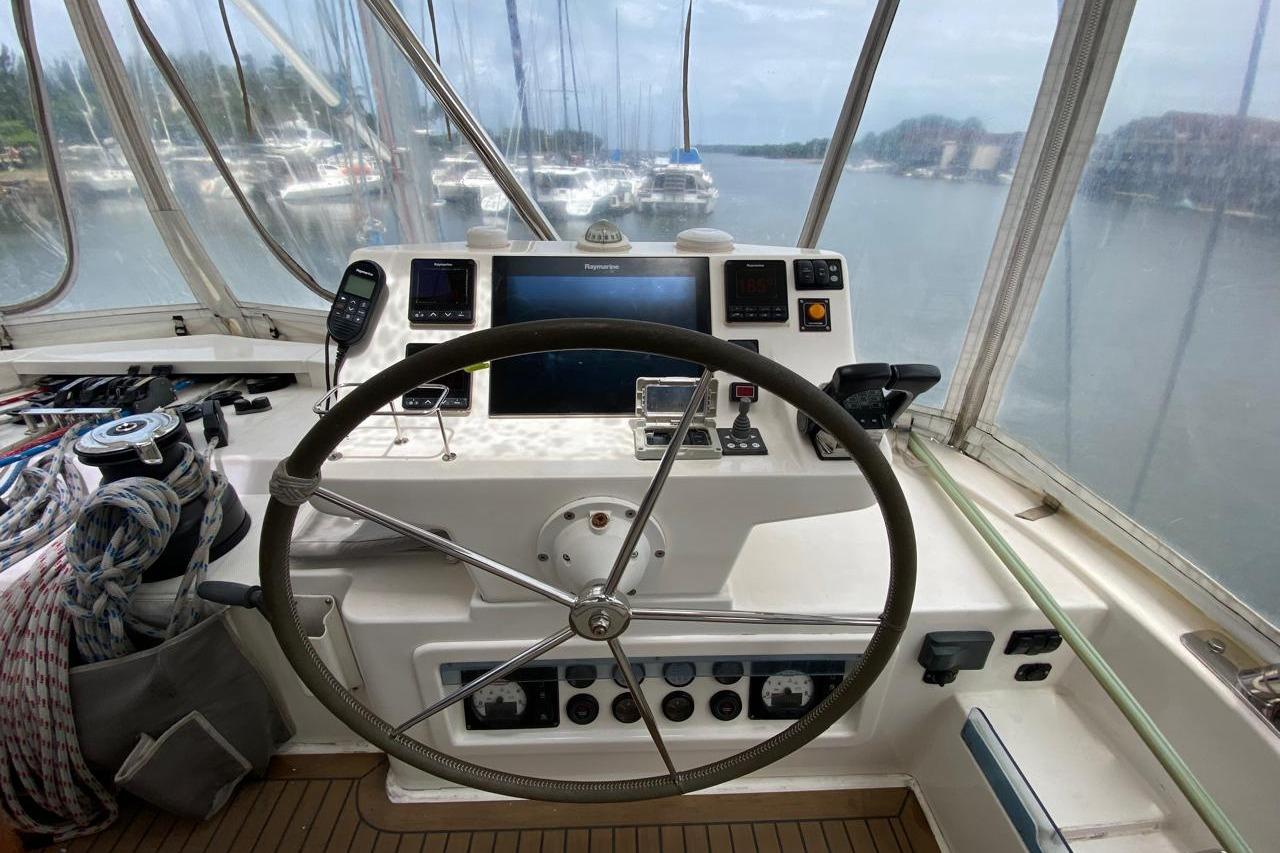 The main salon is bright and functional, with a well-appointed portside galley equipped with a five-burner gas stove and oven, microwave, ample counter space, and a large Vitfrigo refrigeration unit. The cockpit and flybridge layouts are ideal for entertaining and passagemaking alike, featuring outdoor refrigeration, a stainless barbecue, full canvas enclosures, and an upper helm with Raymarine electronics and engine controls.