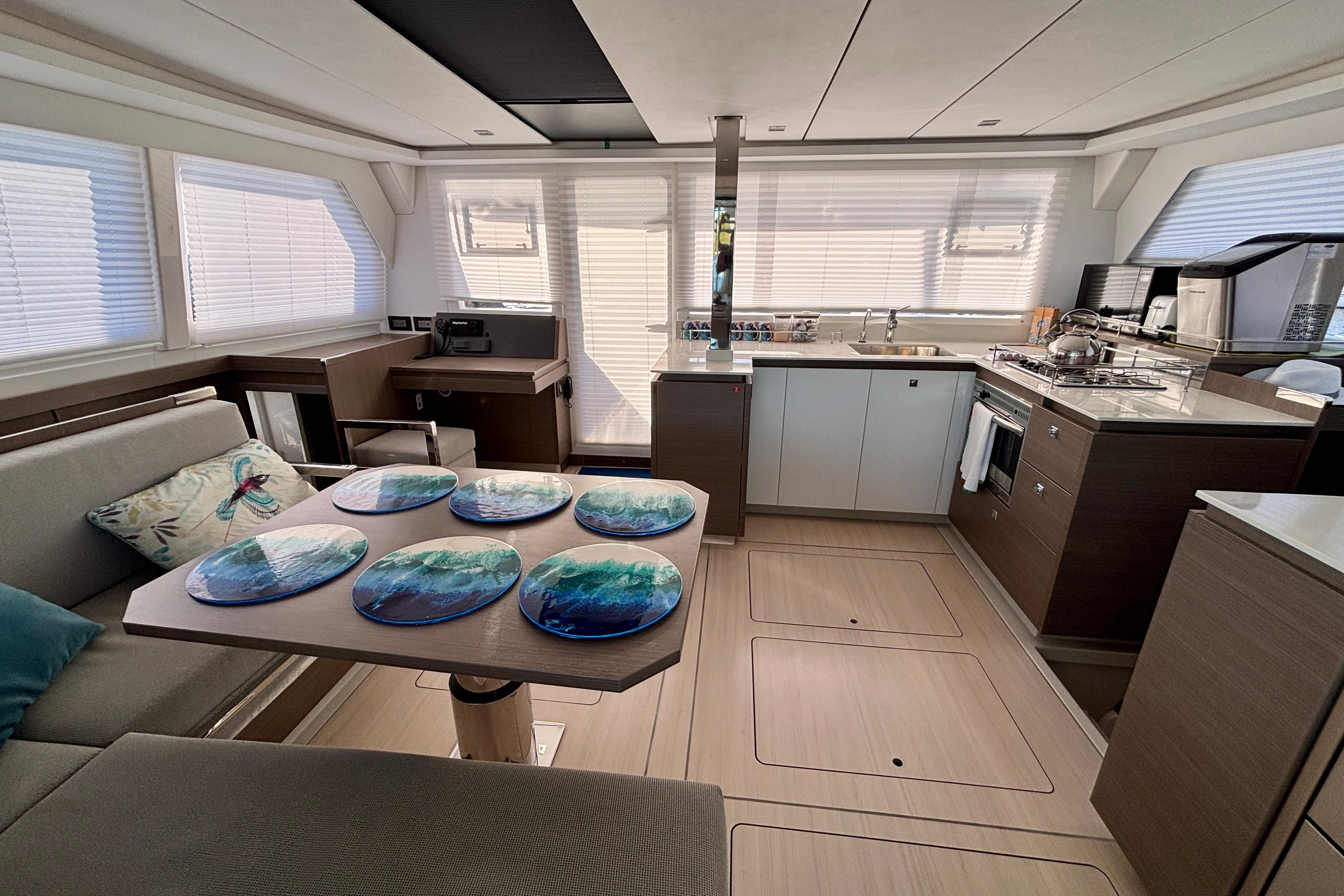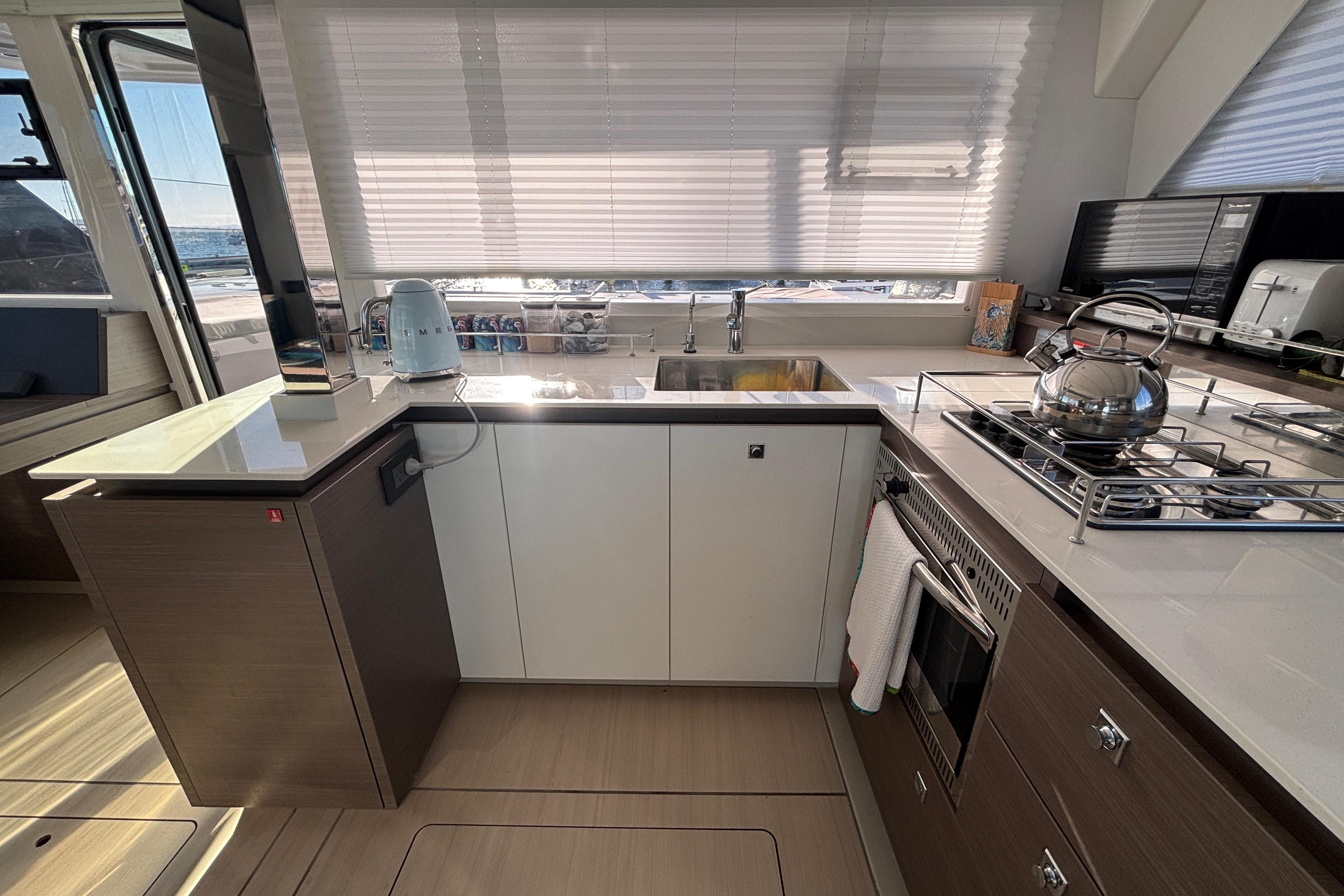 Entering the salon, you are met with panoramic windows that flood the interior with natural light. The vessel also comes equipped with interior saloon blinds for privacy. The U-shaped settee and convertible dining area offer a comfortable place to dine, work, or relax. The galley, positioned forward and to port, benefits from excellent ventilation and visibility. It features generous countertop space, modern appliances, and abundant storage–perfect for extended cruising or liveaboard life.