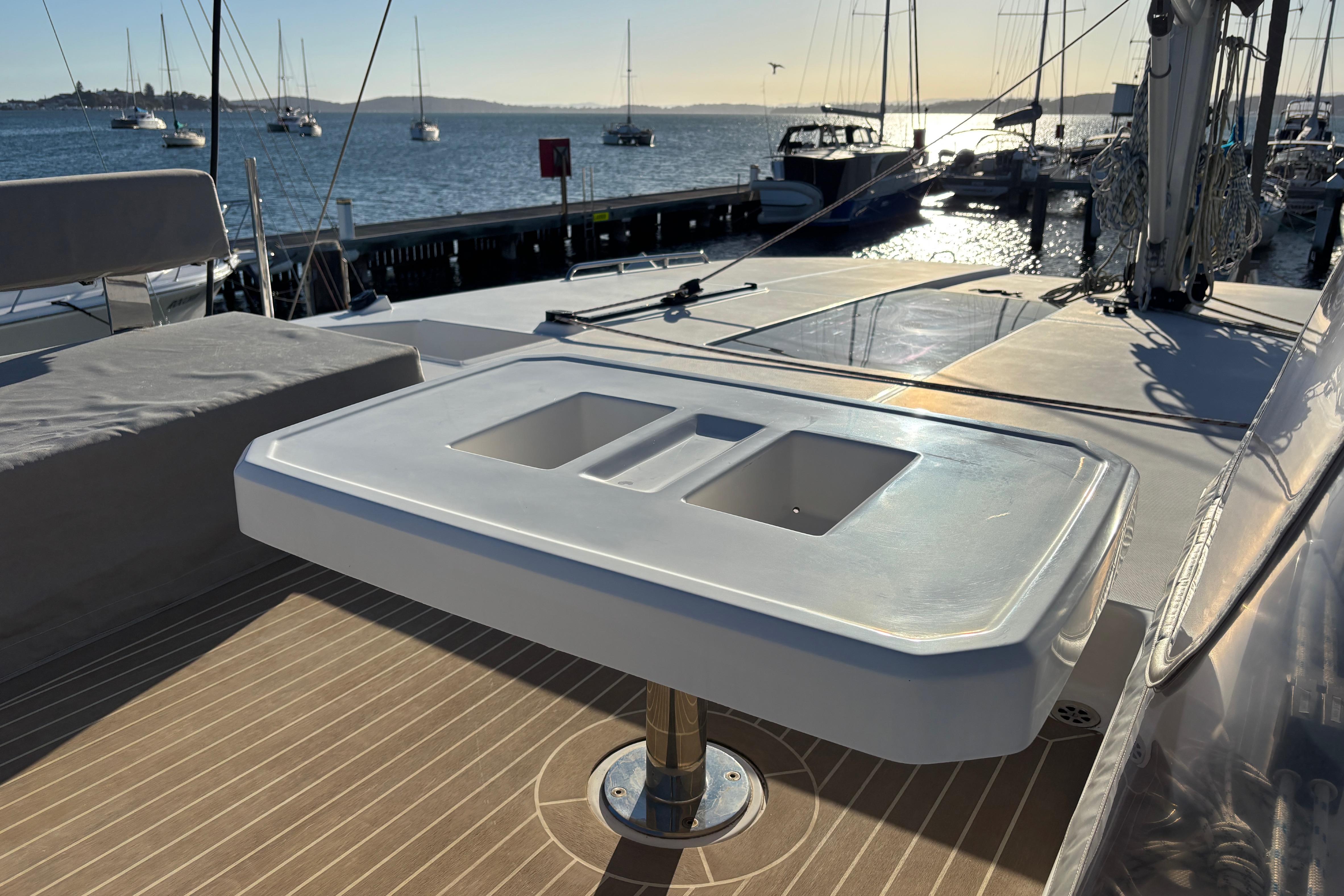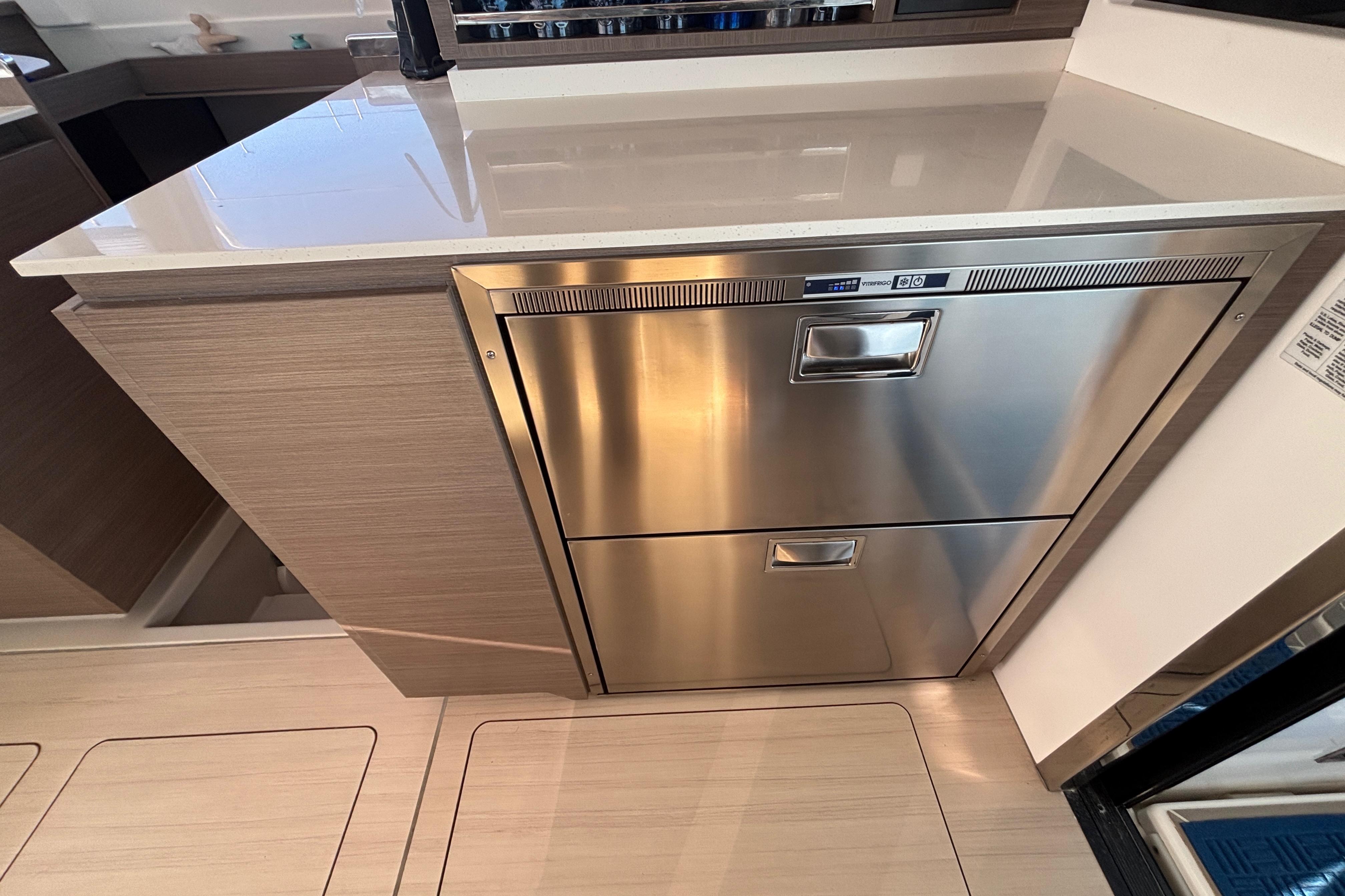 At the forward end of the hull, the owner’s bathroom spans the full beam, featuring a large walk-in shower, generous vanity, washer dryer and clean, modern styling. This private suite delivers comfort comparable to much larger catamarans.
