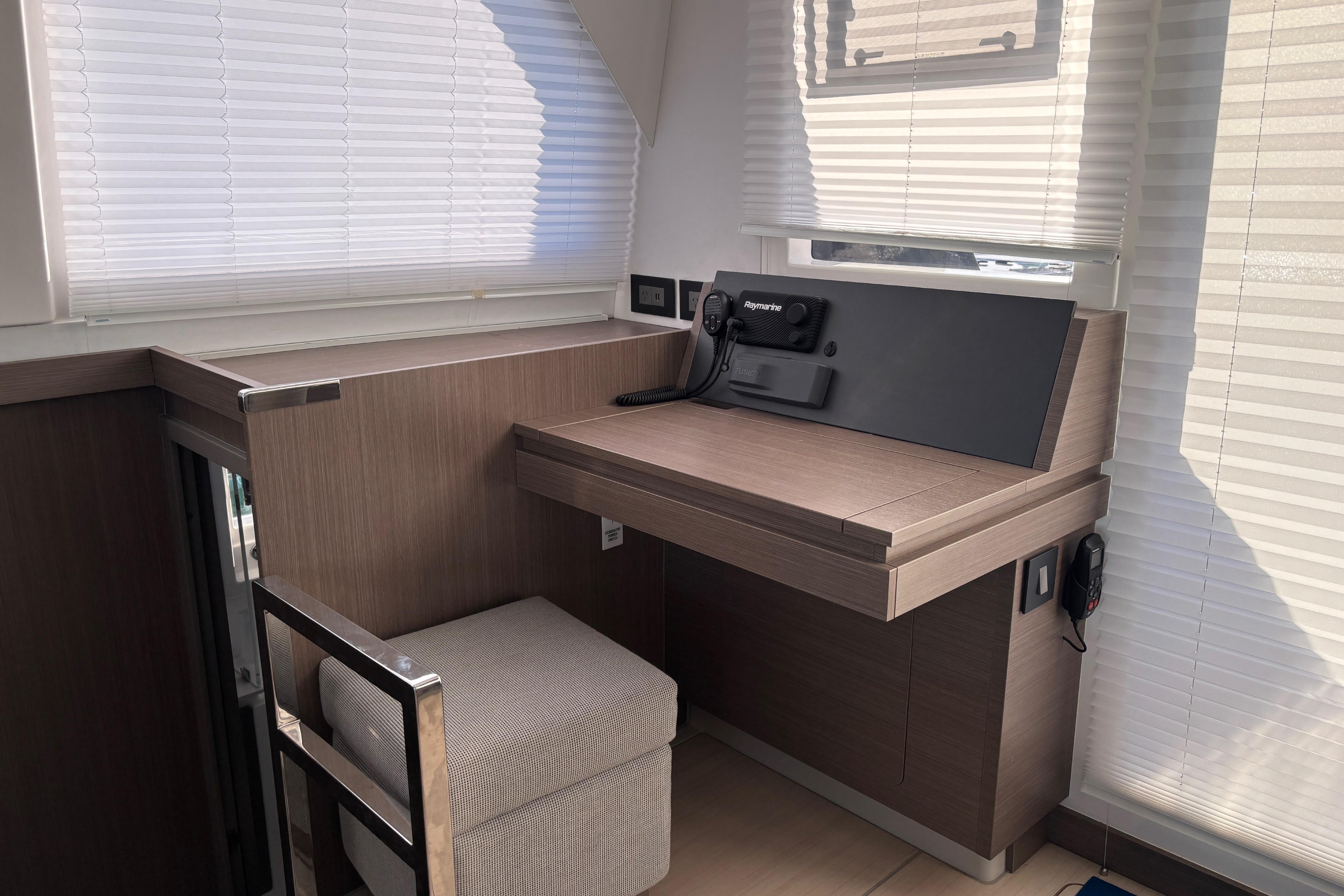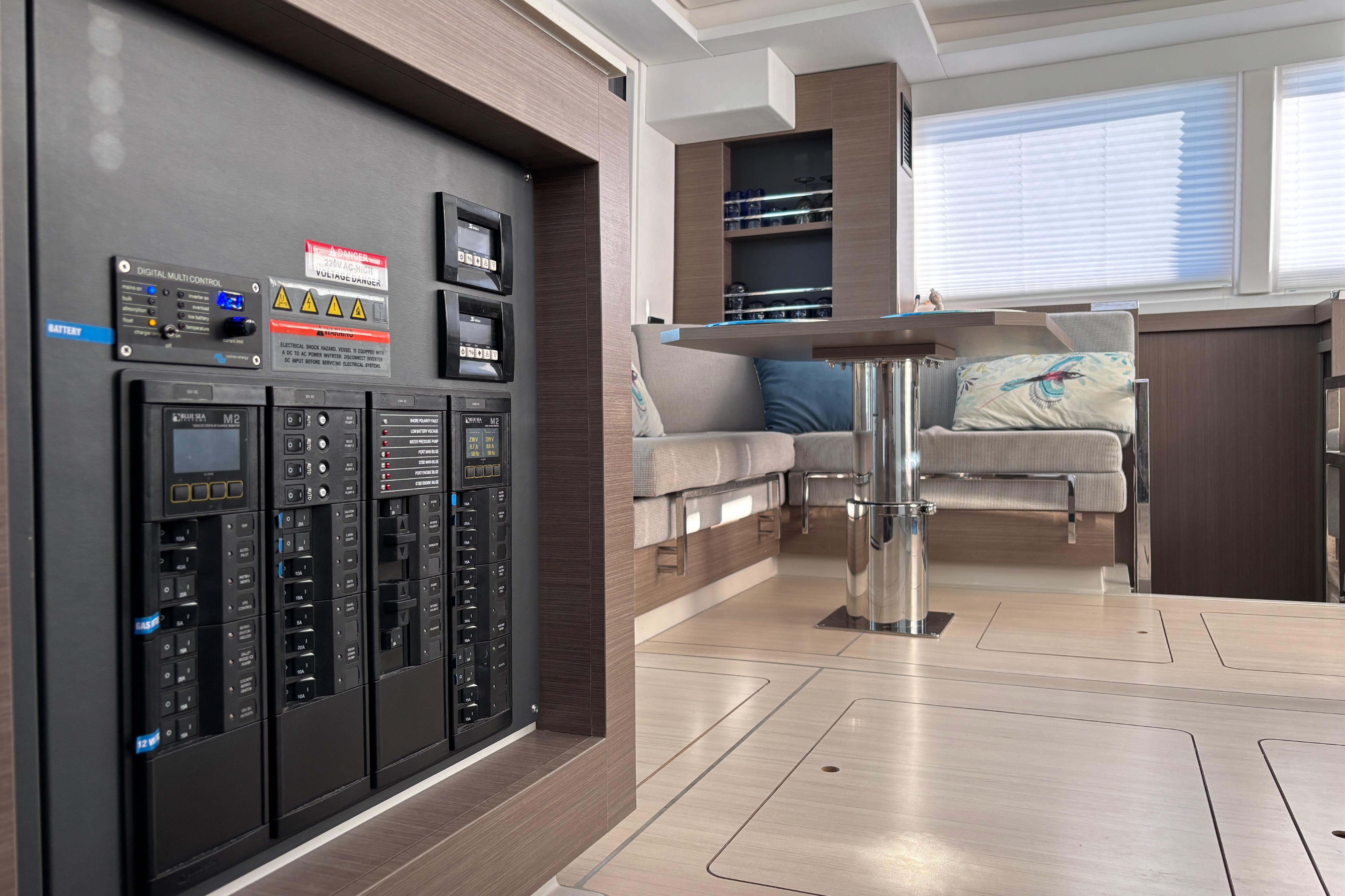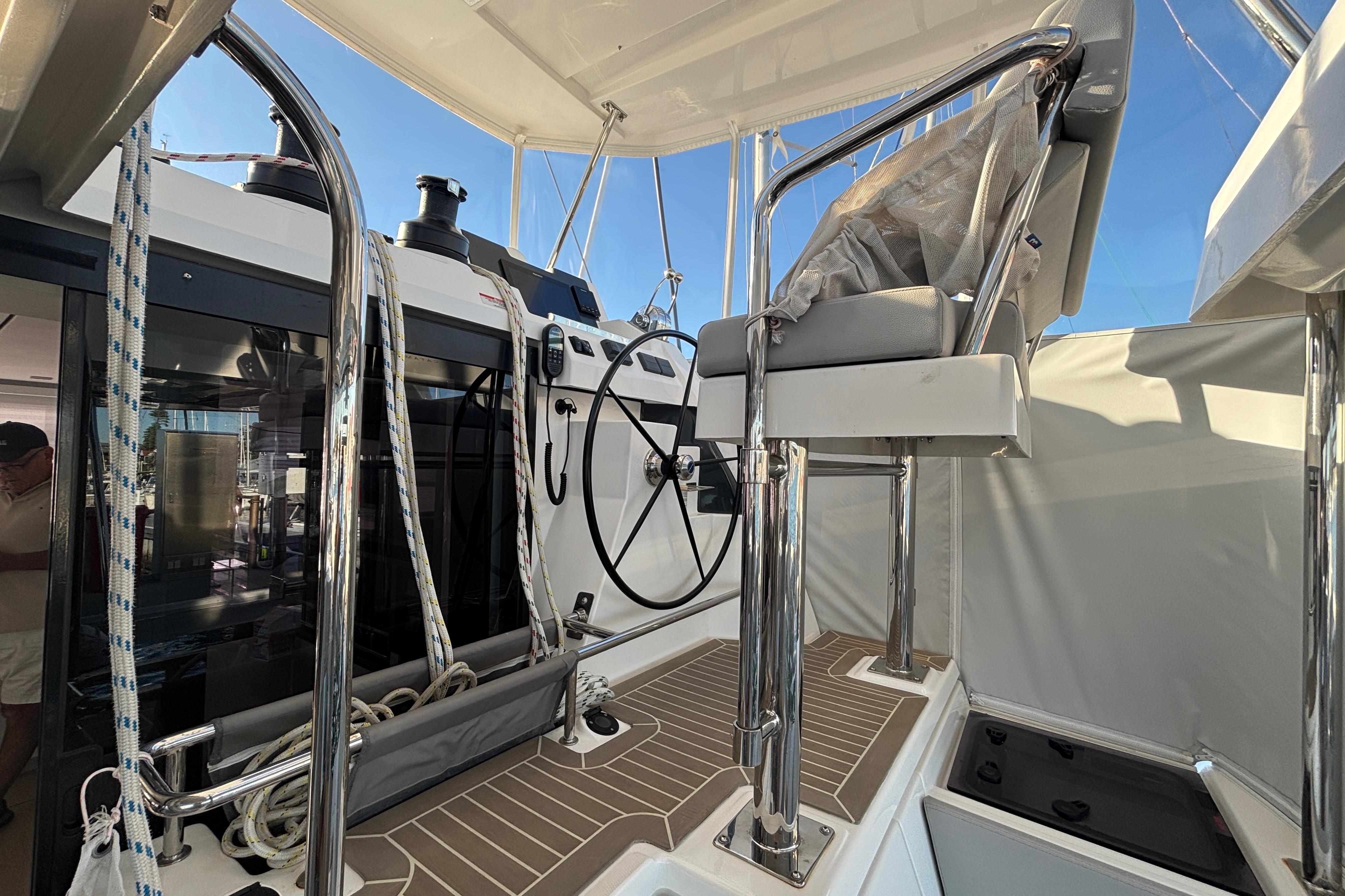 To starboard, a well-protected helm station offers great visibility and enclosed clears All halyards, sheets, and reefing line are led neatly to the helm, allowing confident single- or short-handed sailing. The ergonomic design, comfortable seating, and adjacency to both cockpit and forward lounge ensure the helmsman remains connected to the social spaces while underway.