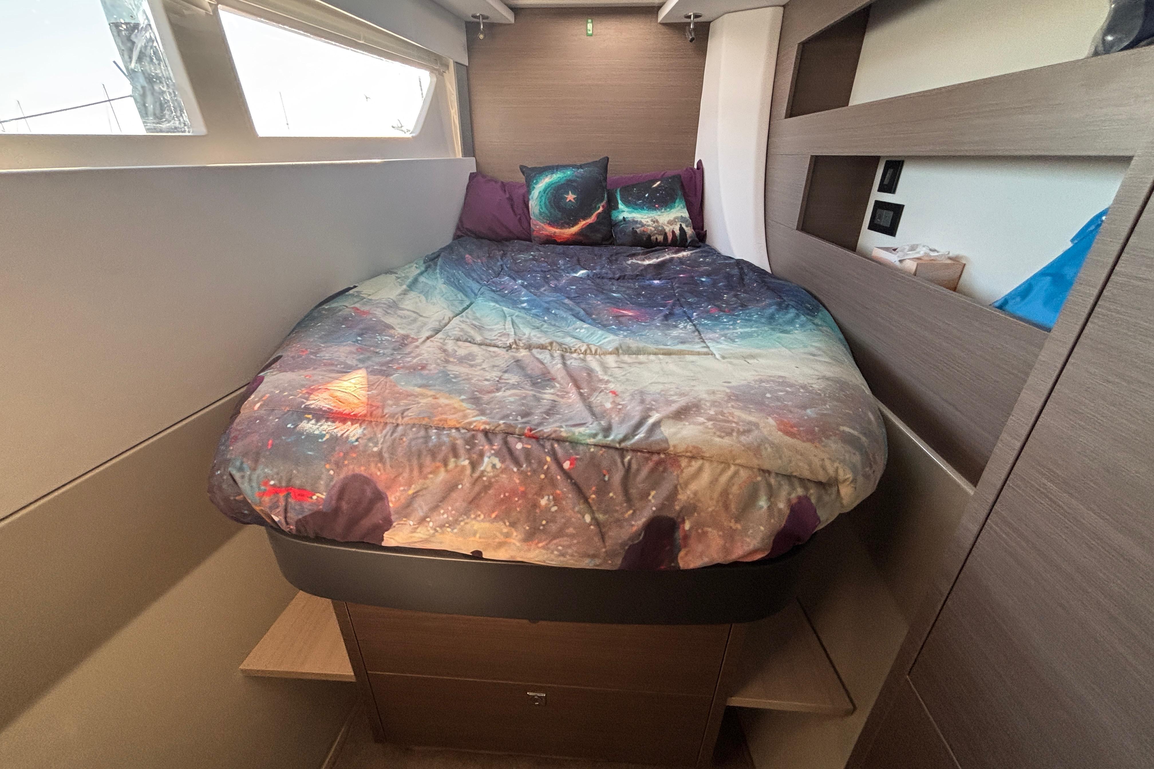 The starboard hull is dedicated entirely to the owner and exemplifies the comfort of the 3-cabin configuration. A wide companionway leads to a spacious aft cabin with an island queen berth, ample natural light, carpeted cabin sole and refined finishes. Moving forward, you find an impressive area with storage and vanity seating area