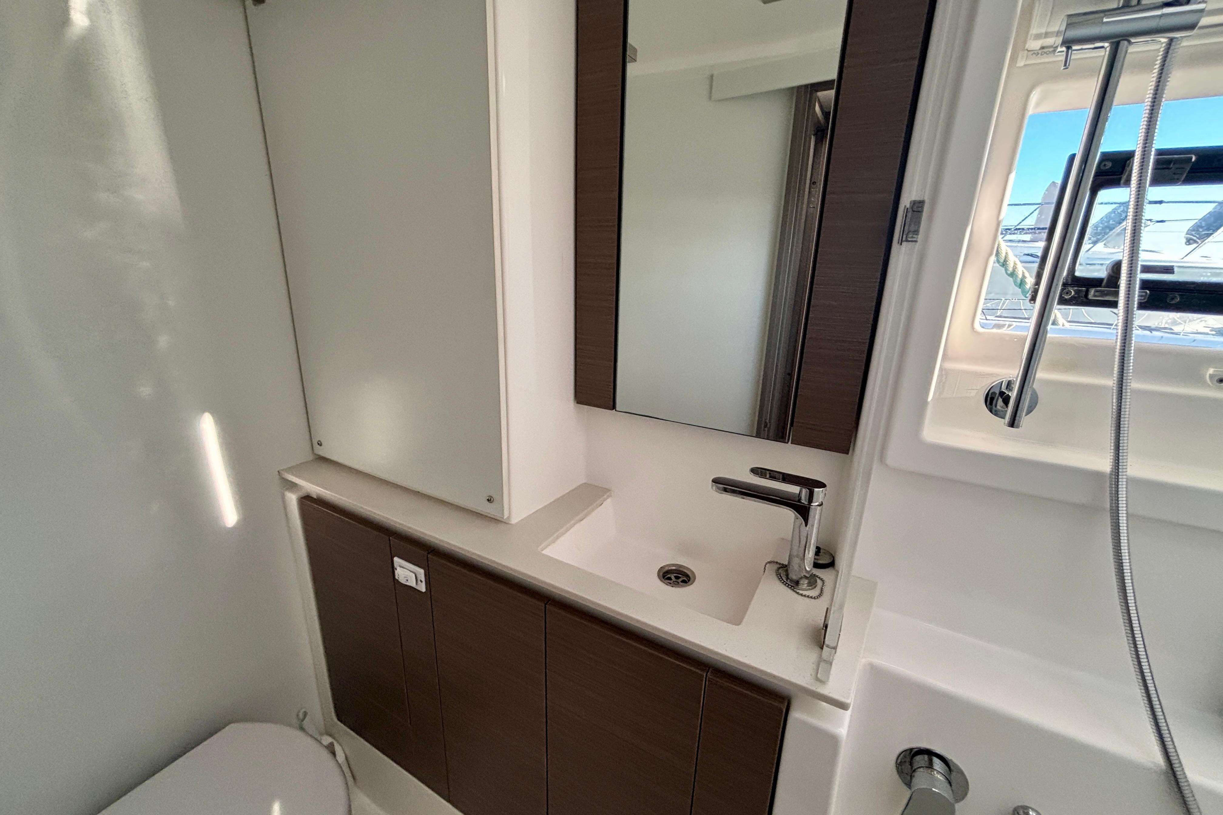 The port hull hosts two well-proportioned guest cabins. Aft, a cabin with a double berth and excellent ventilation provides cozy yet comfortable accommodations. Forward, another double cabin mirrors the quality of the rest of the vessel, complete with its own storage and natural light. Between them 2 guest bathrooms with separate shower ensures comfort and privacy for visiting friends or family.