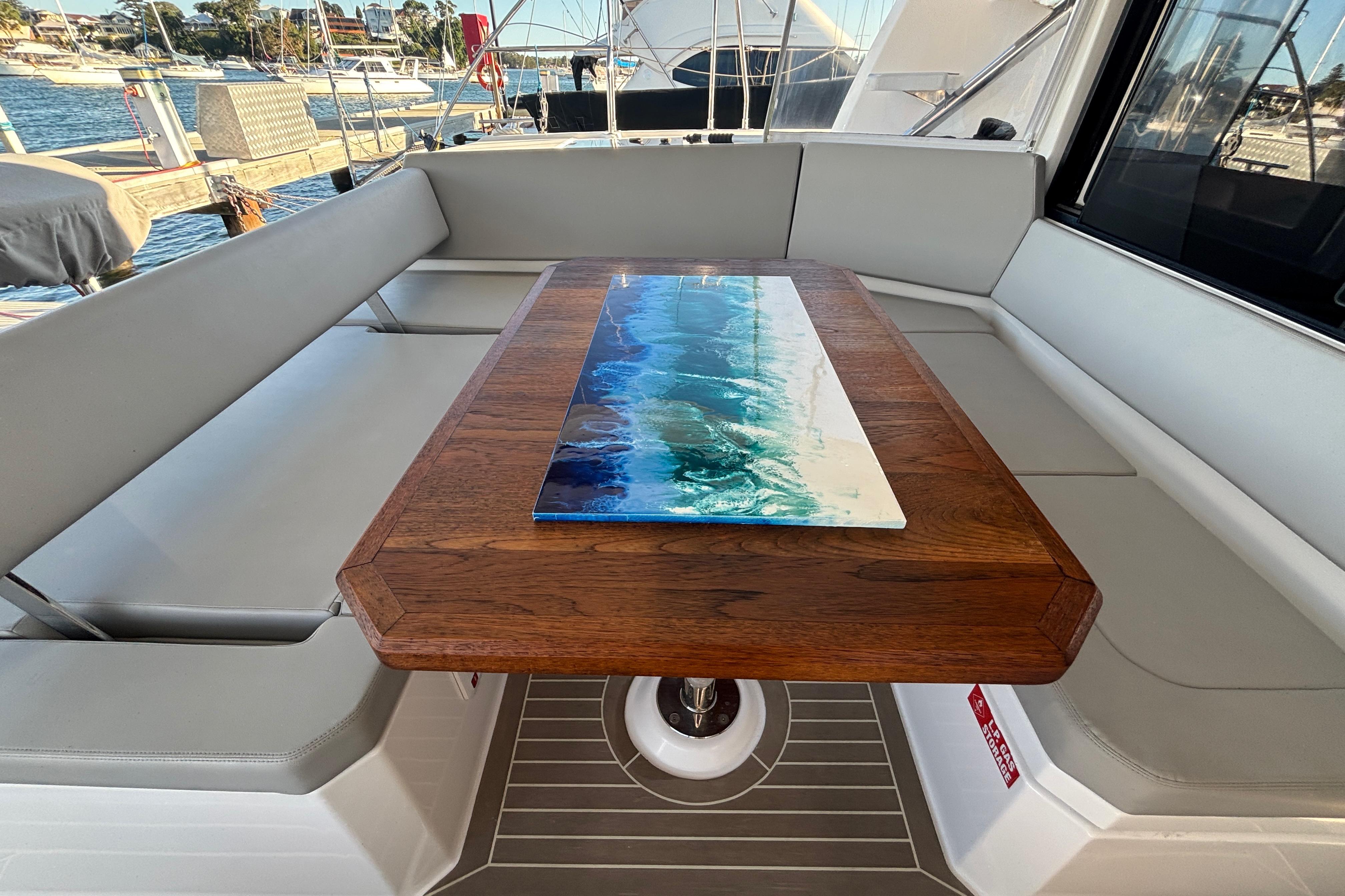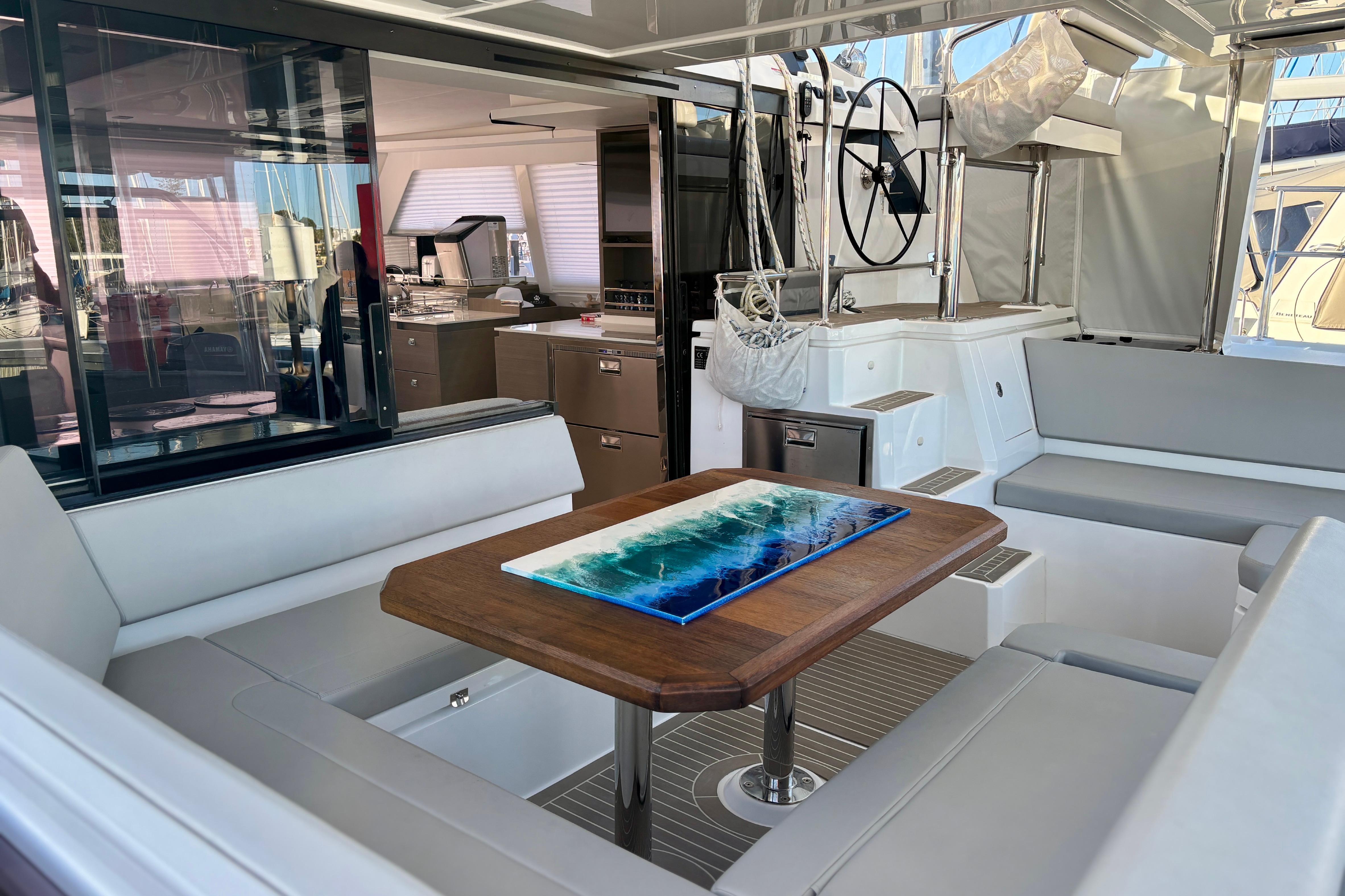 Boarding from either port or starboard transoms, you enter a generous aft cockpit designed for effortless outdoor living. A large teal dining table accommodates family and guests comfortably, and the surrounding seating provides an inviting space for relaxation under the hardtop. Access to the salon is seamless through the sliding glass doors, creating a true indoor-outdoor flow ideal for both entertaining and passagemaking.