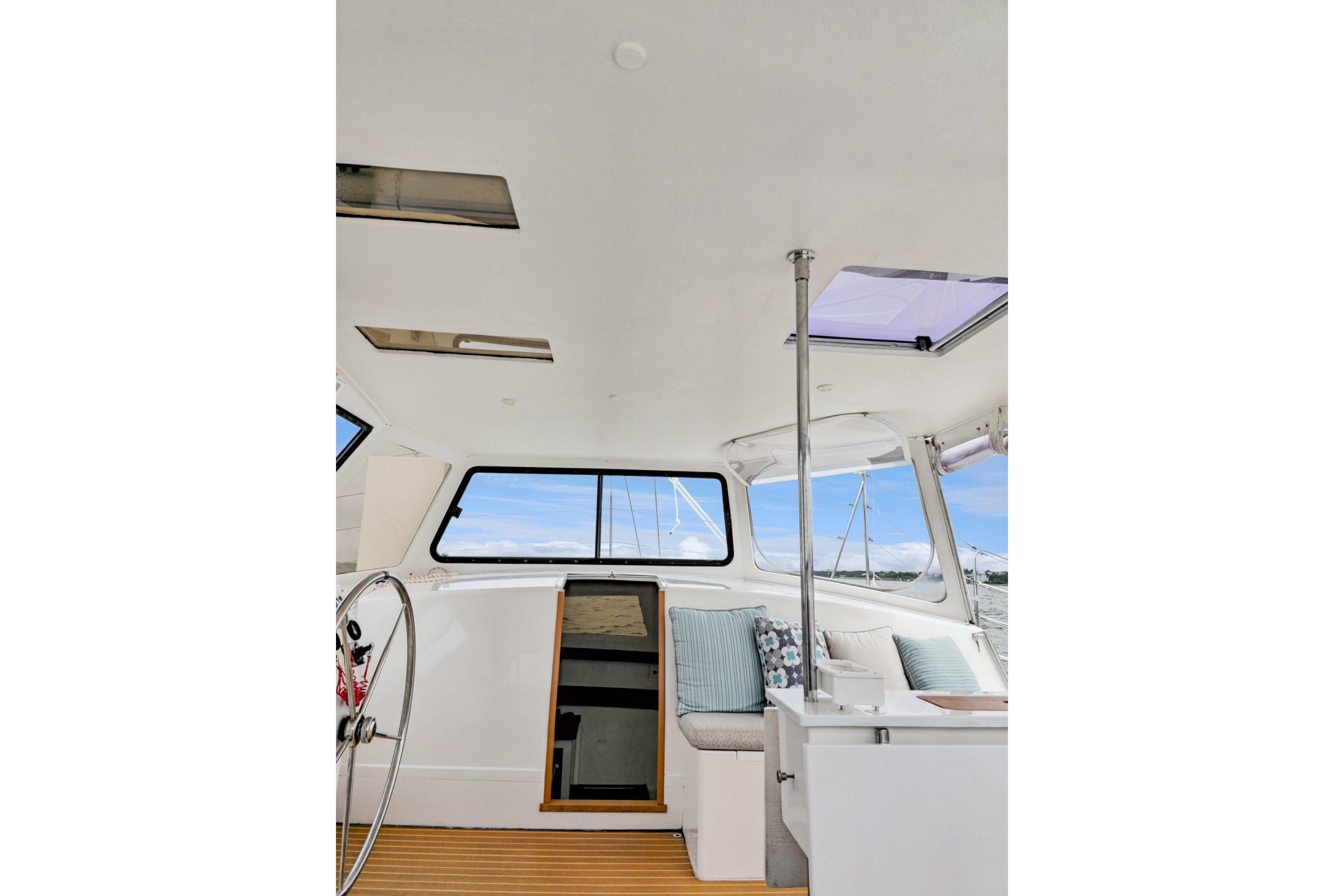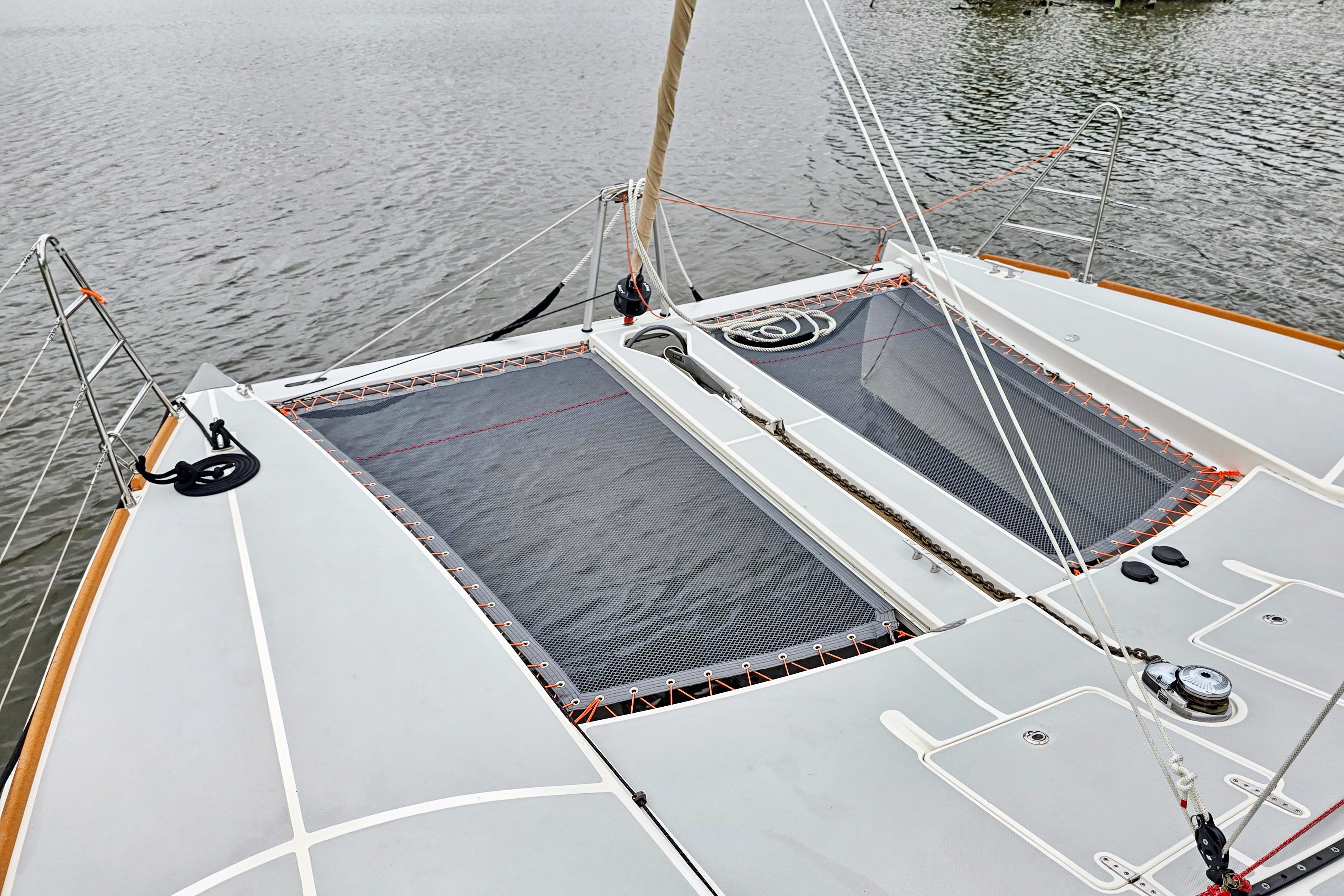Large (16 long) tinted acrylic fixed portlights outboard each hull in cabin topsides