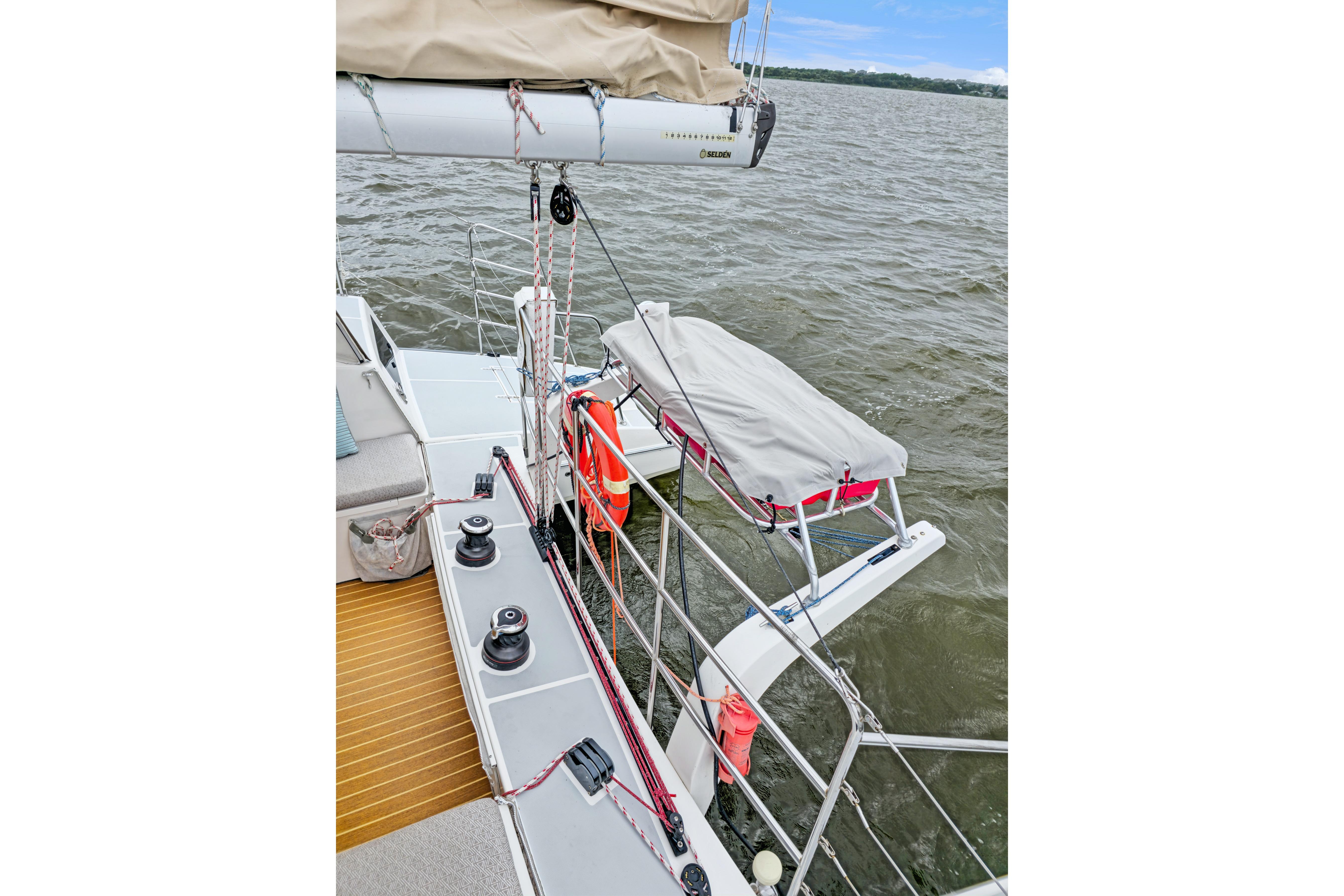 49 Selden anodized aluminum mast fractionally rigged with double spreaders. Includes spinnaker and screecher halyards and single line reefs at three points.