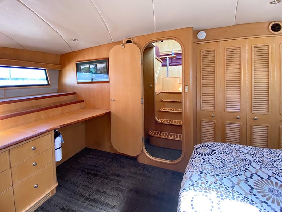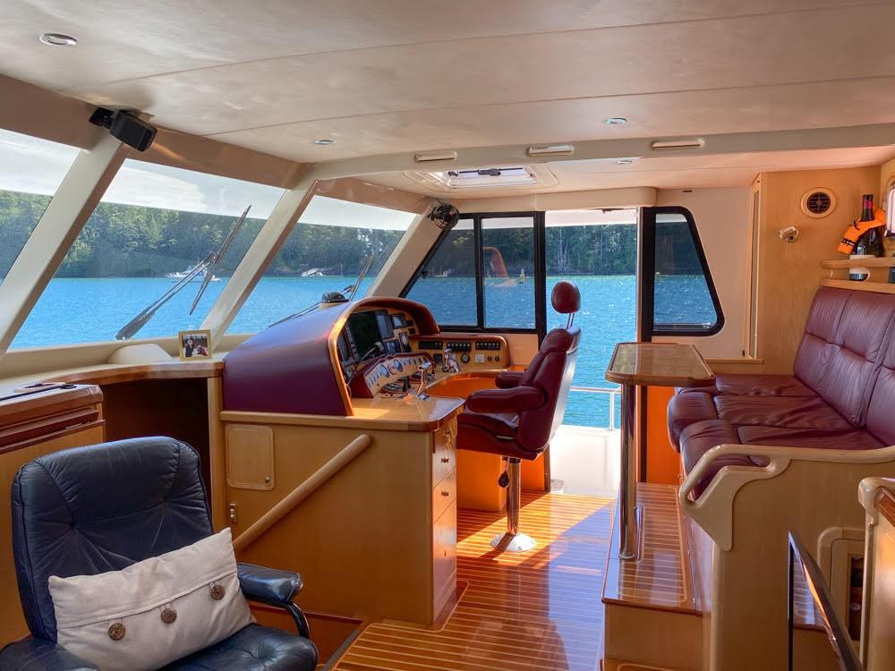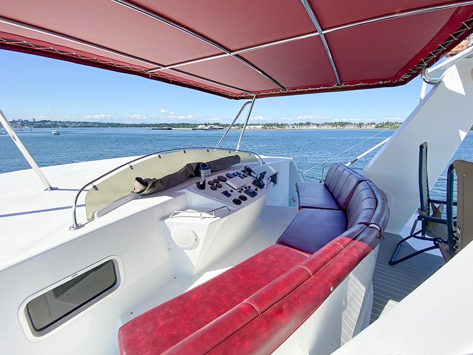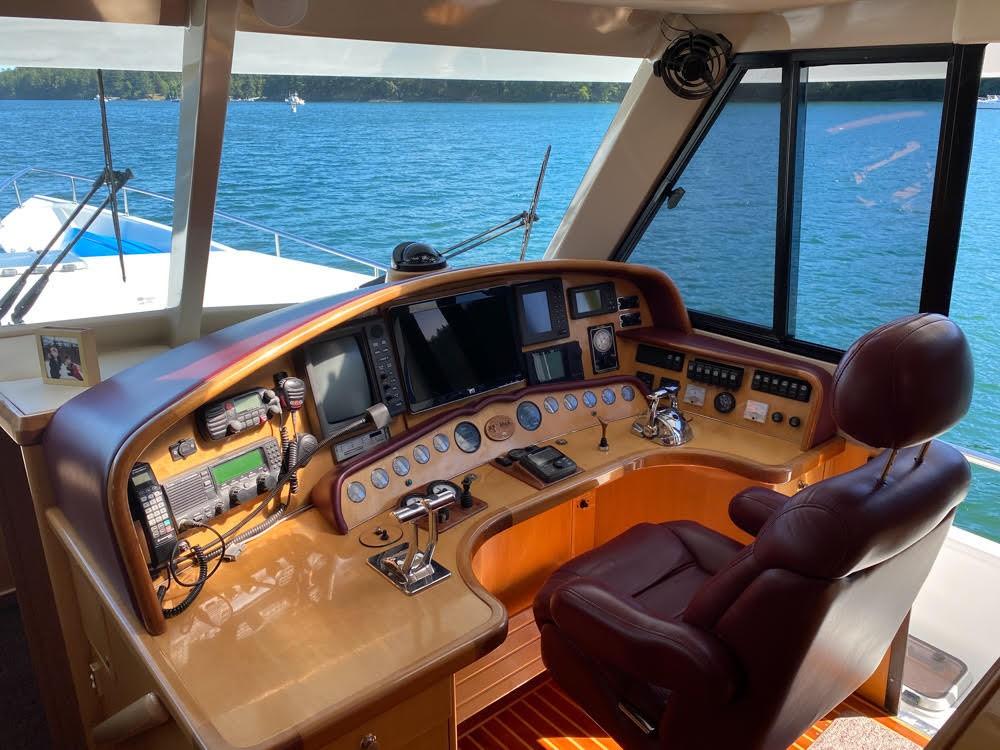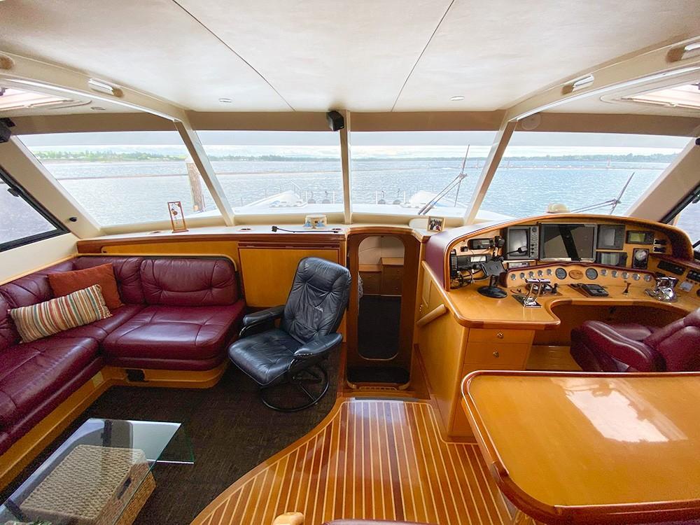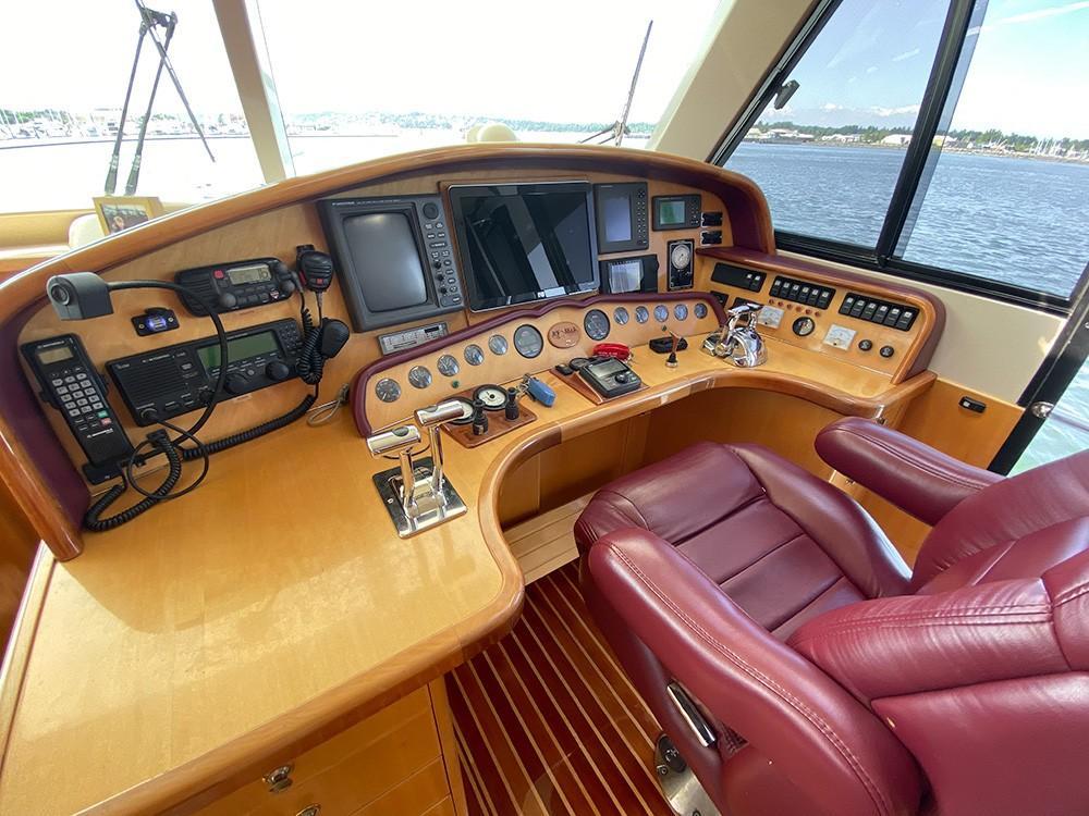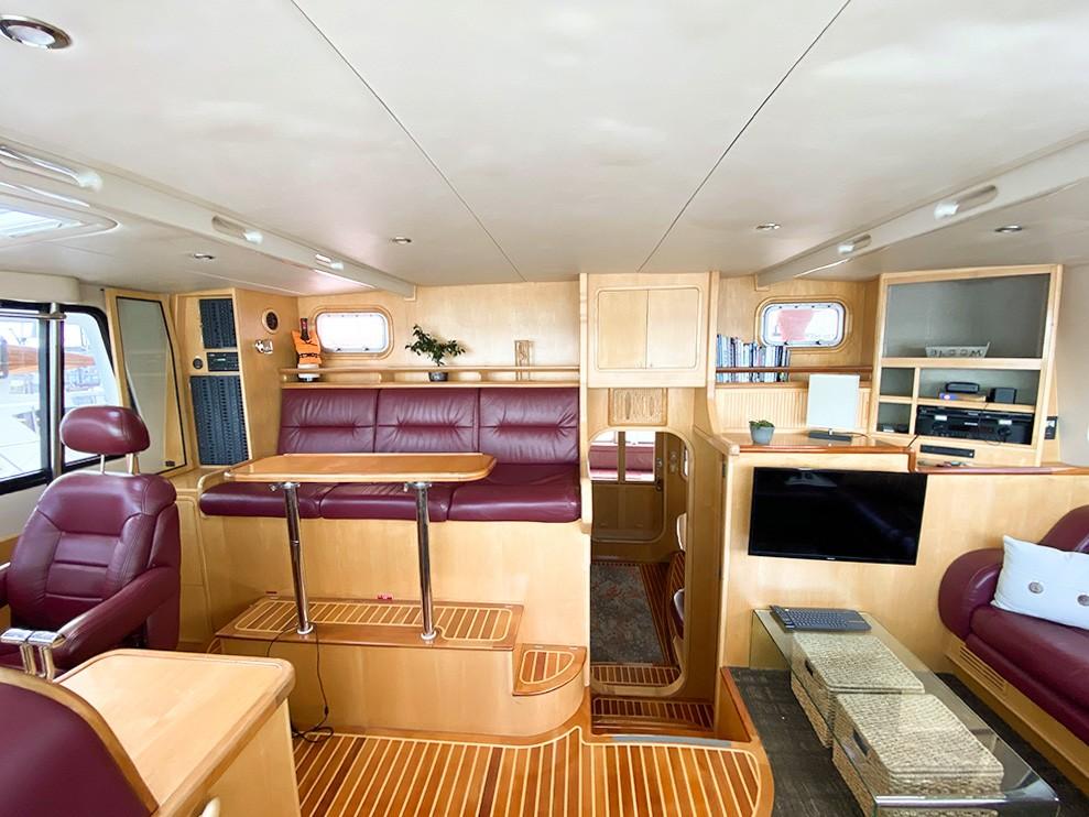 Her dual helm stations (pilothouse, flybridge) and twin Cummins 6BT 270 HP diesels with Hundestat variable-pitch propellers deliver outstanding maneuverability and redundancy.