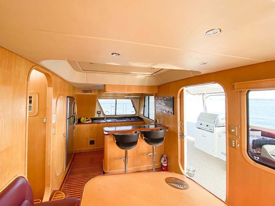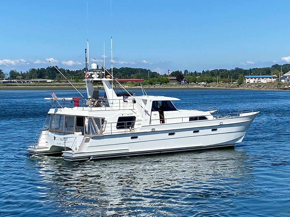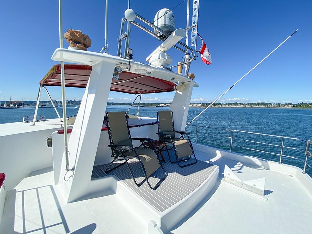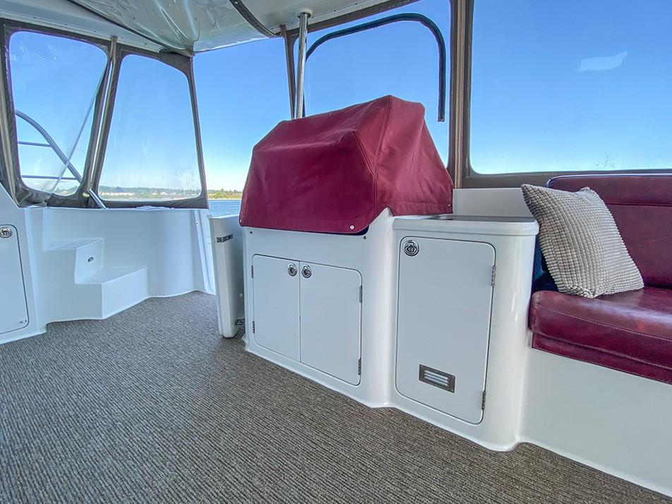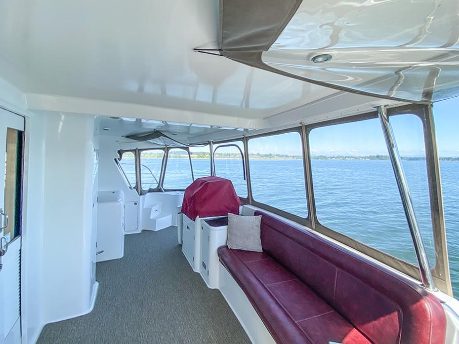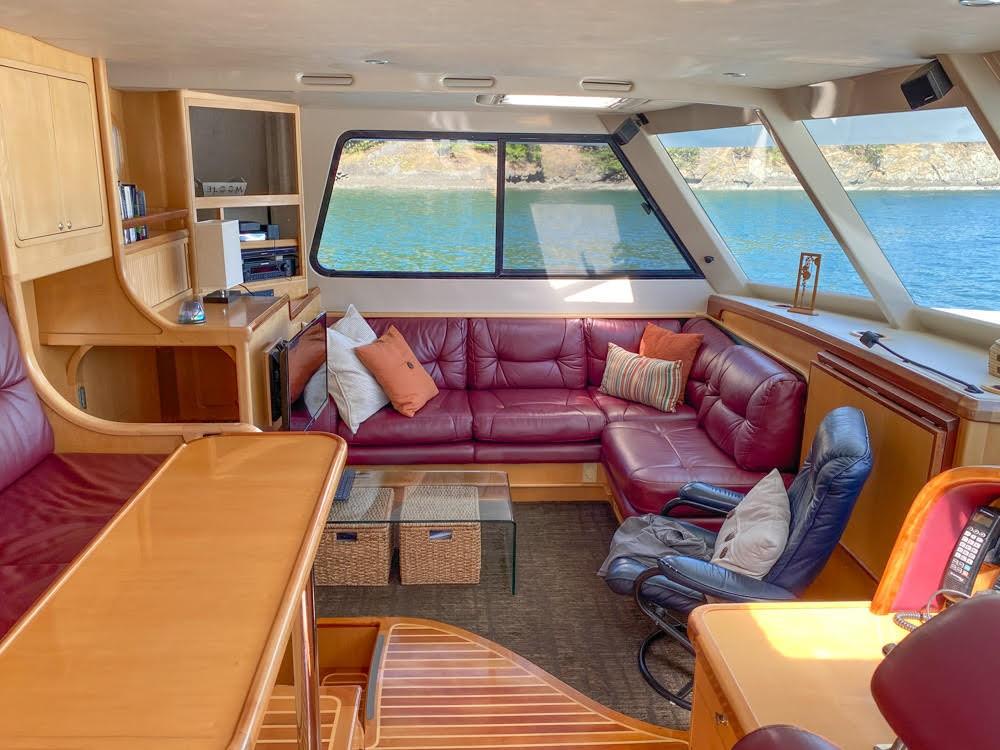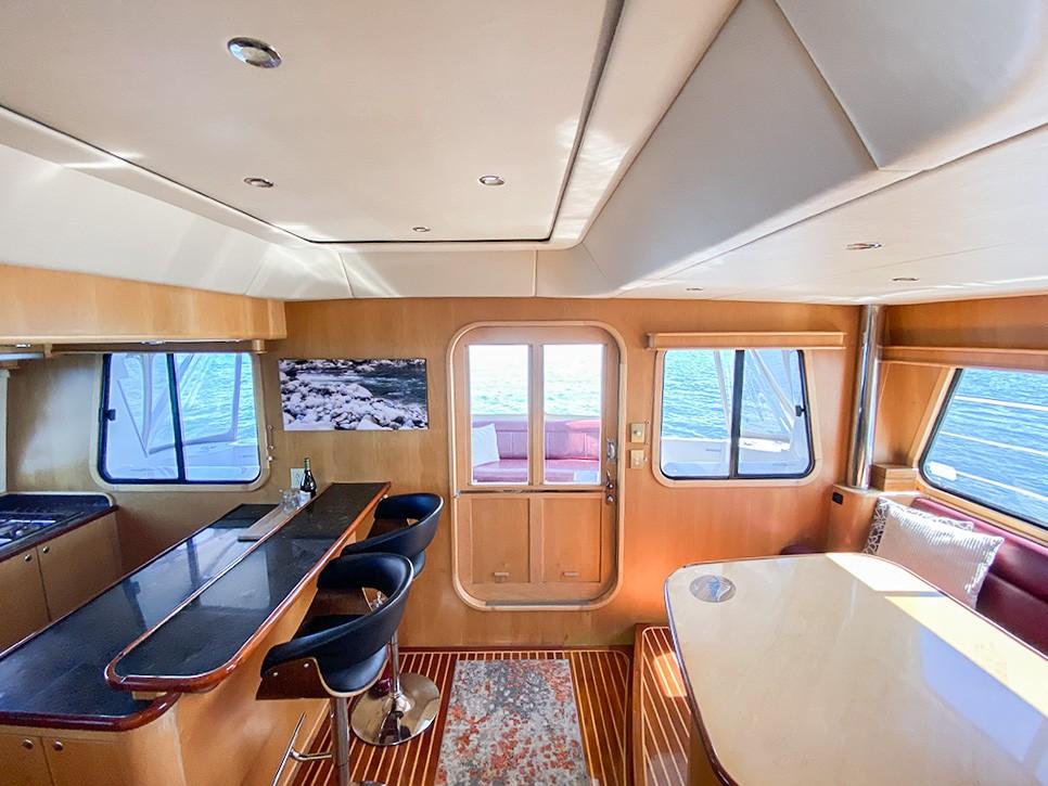 Her dual helm stations (pilothouse, flybridge) and twin Cummins 6BT 270 HP diesels with Hundestat variable-pitch propellers deliver outstanding maneuverability and redundancy.
