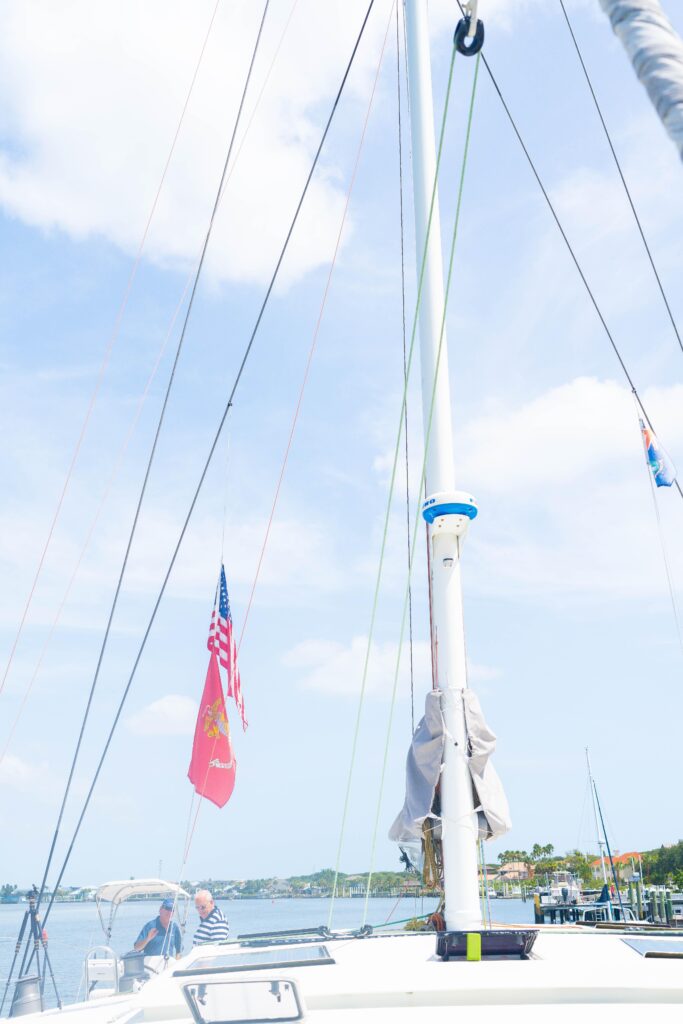 FUTURE FIBRES standing rigging lashed to the spar and linked to the boat using custom turnbuckles secure the mast.