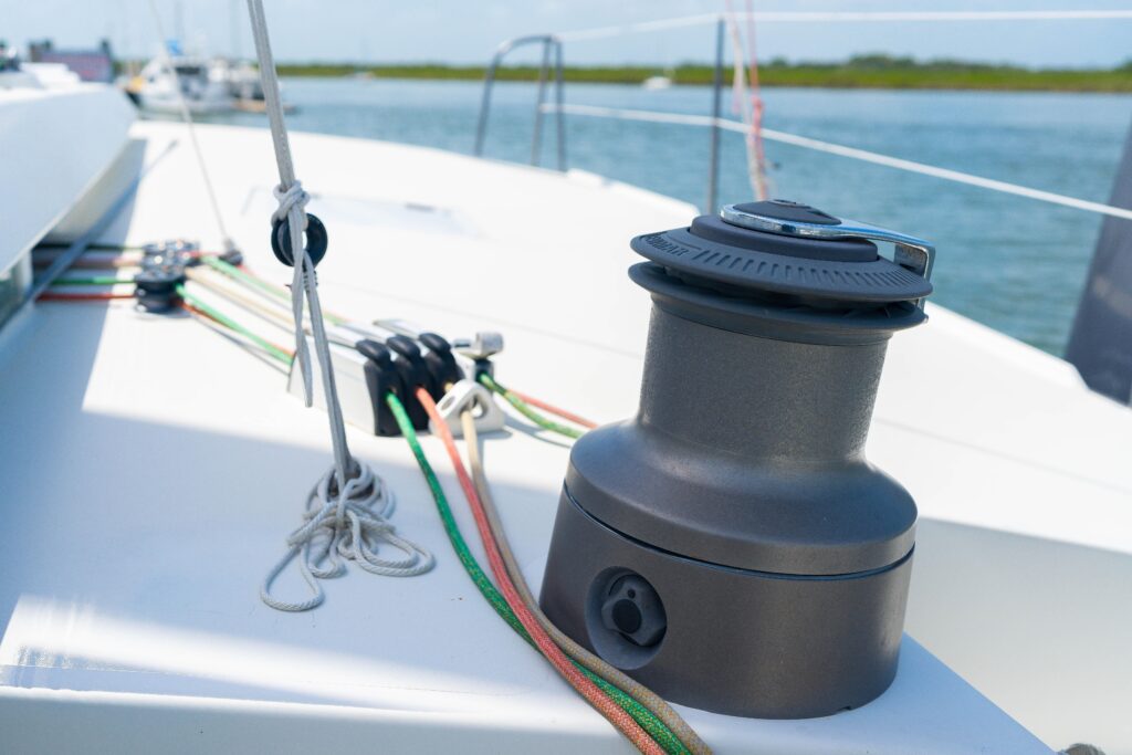 All sails, except for the main sail, are hoisted onto KARVER locks to reduce the loading on the rig and add increased safety to the boat.