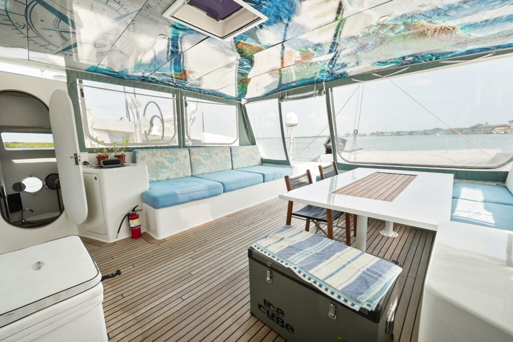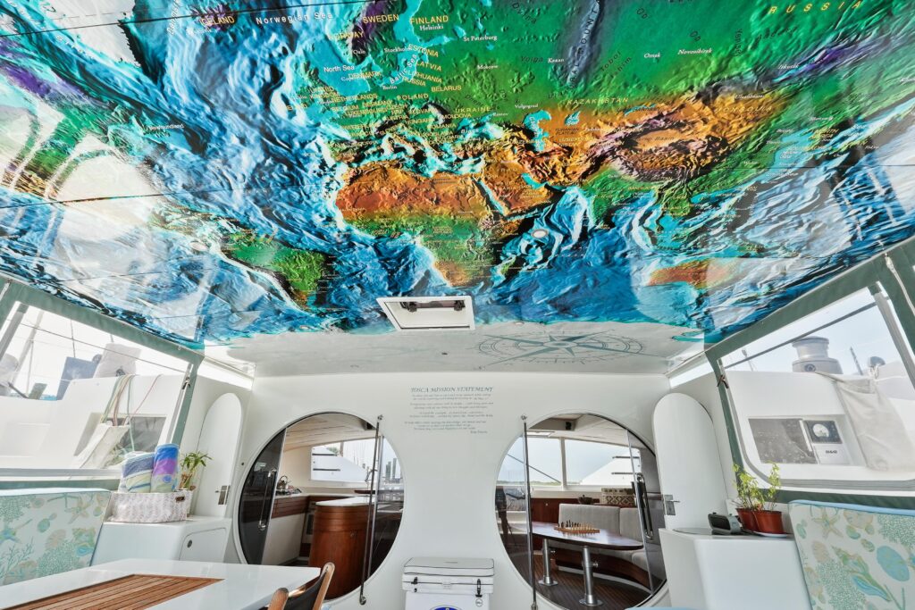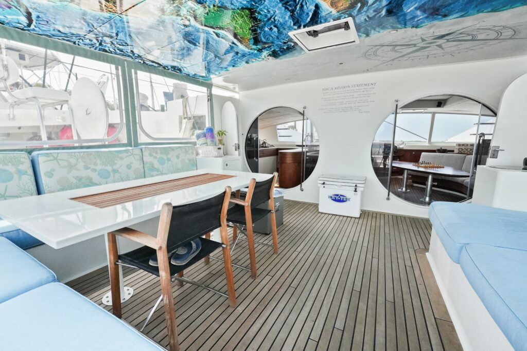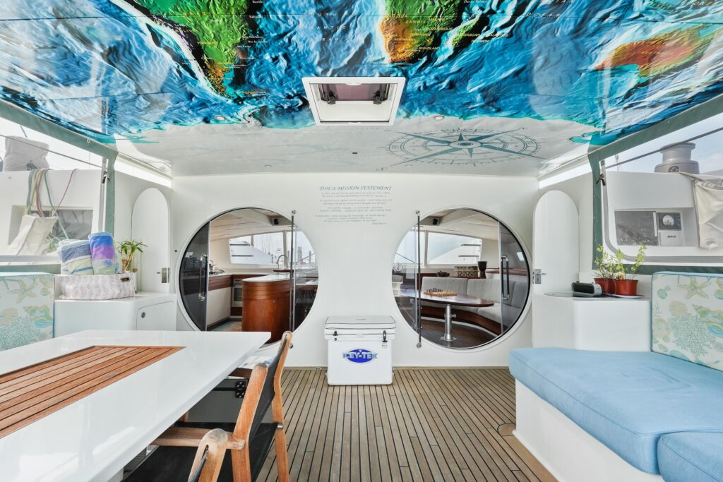 The distinctive, beam to beam (TEUG) coach-roof design expands the interior space and headroom. TOSCA has salon, cabin, bathroom volumes and headroom that rival cruising cats from France and Poland in this size range. Huge, tempered glass windows at the front of the salon provide unobstructed views forward.