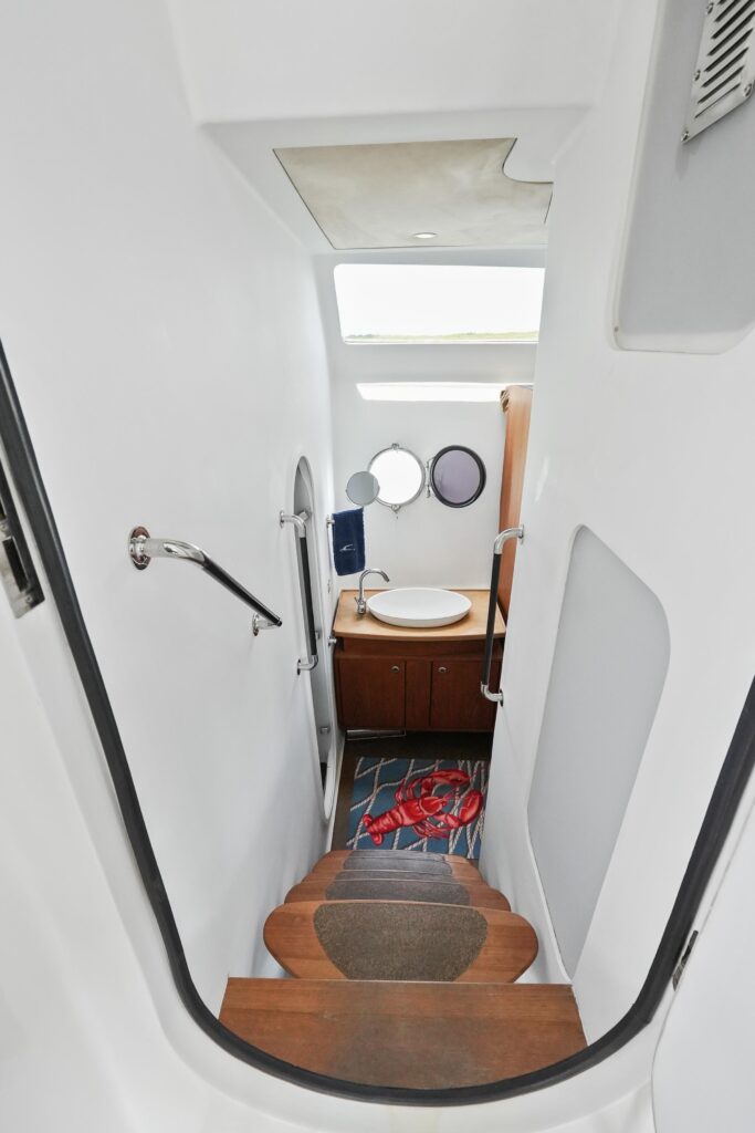 The engine rooms and forward sail lockers are fitted with an automatic bilge pump system, whilst the rest of the hulls are plumbed to accept a quick coupler linked to the engine driven pump system. This remote hose has sufficient length to get to the hard to reach places. If the automatic bilge pumps are in operation, a light illuminates on the switch panel located at the nav station.