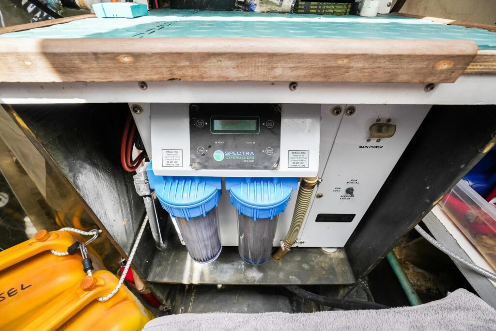 A SPECTRA water-maker makes water and delivers it to a day tank mounted in the galley. From there it is diverted to either the port or starboard tanks. The fresh water from the tanks is pumped via two SHURFLO pumps which deliver water to either the port or starboard hulls. If needed both systems can be connected for redundancy and service.