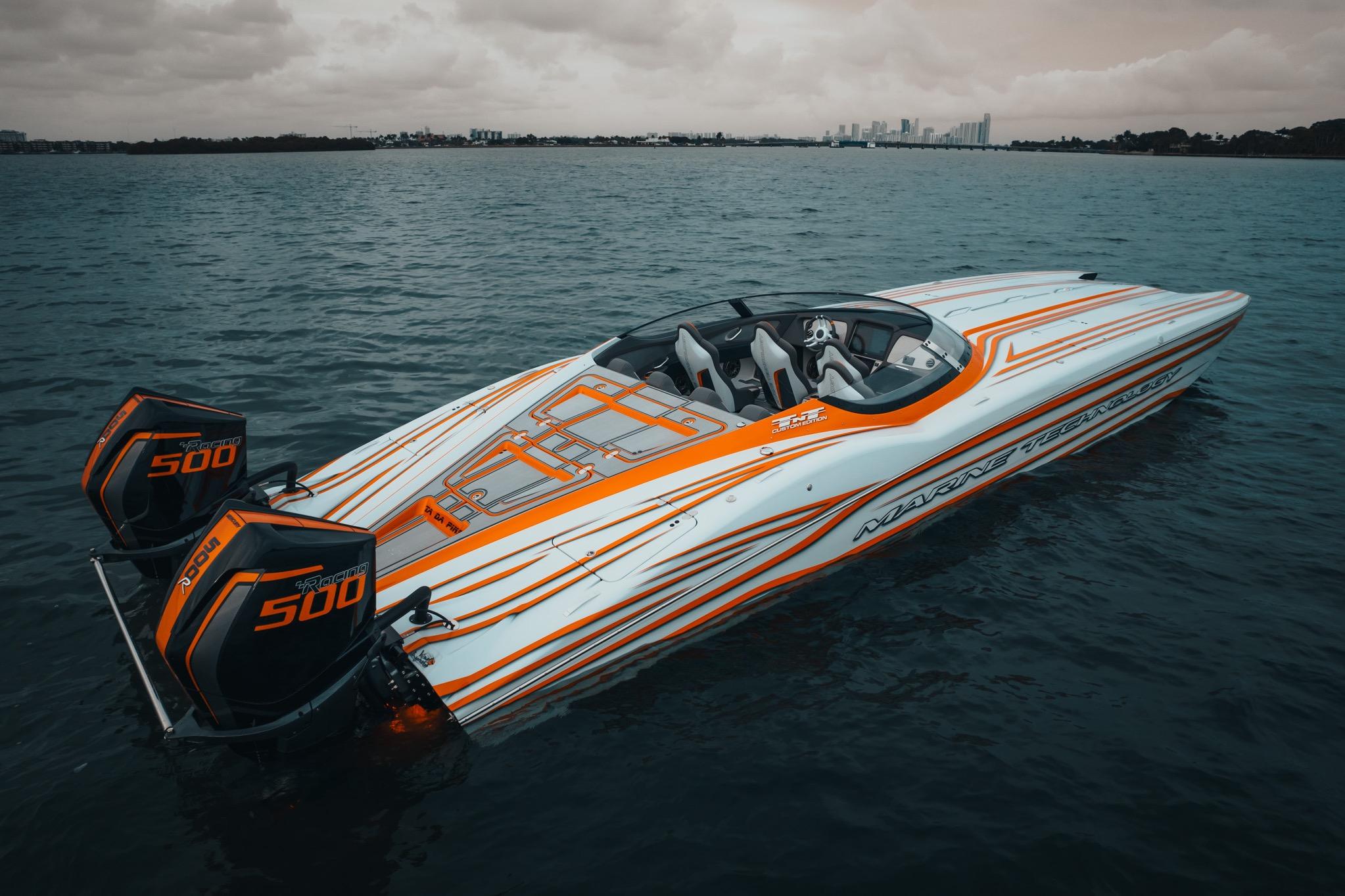 2024 MTI 390X powered by twin Mercury Racing 500R outboards with approximately 195 hours. Finished in striking Candy Orange Stage 3 paint with a colored gelcoat bottom.