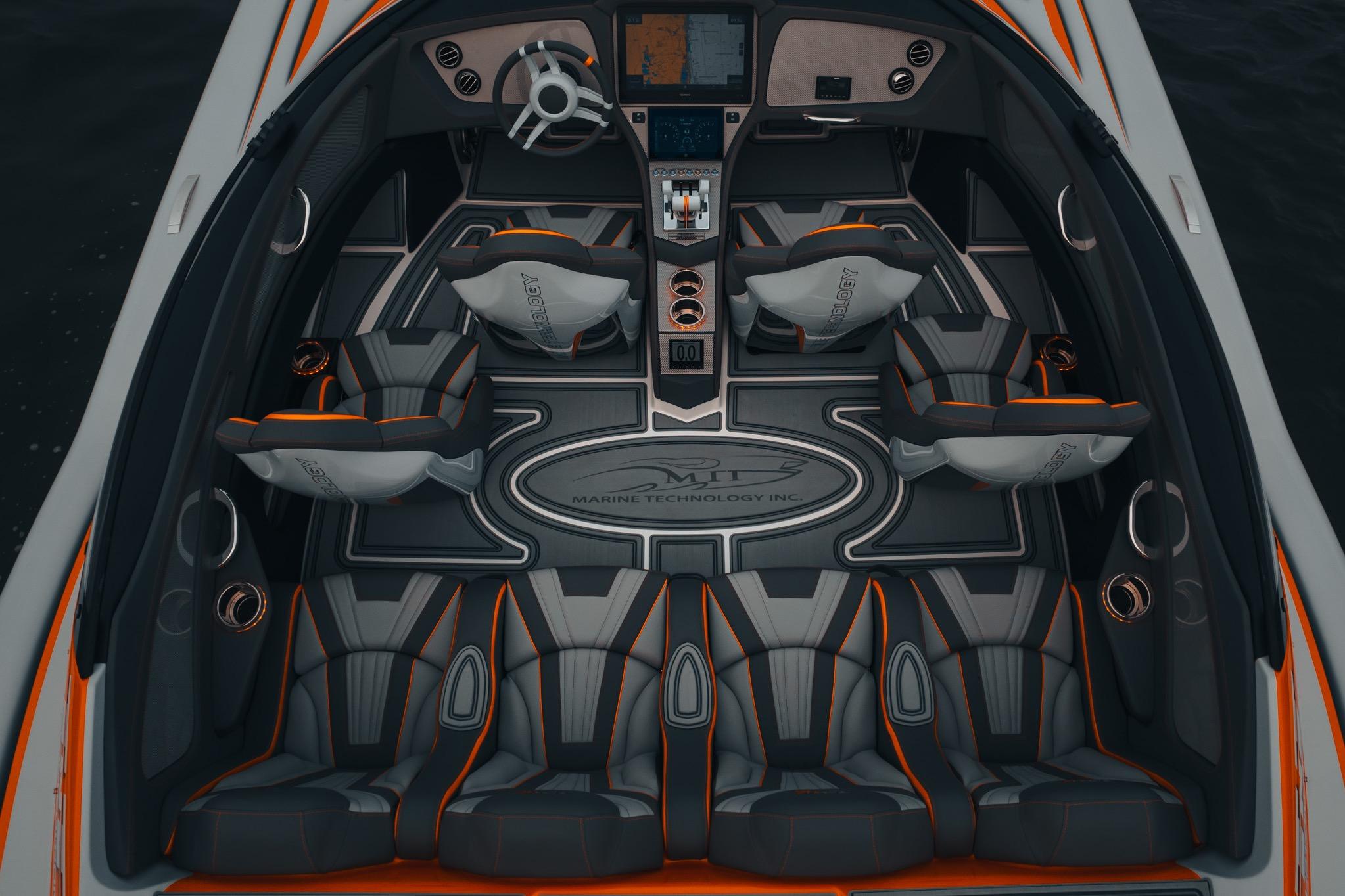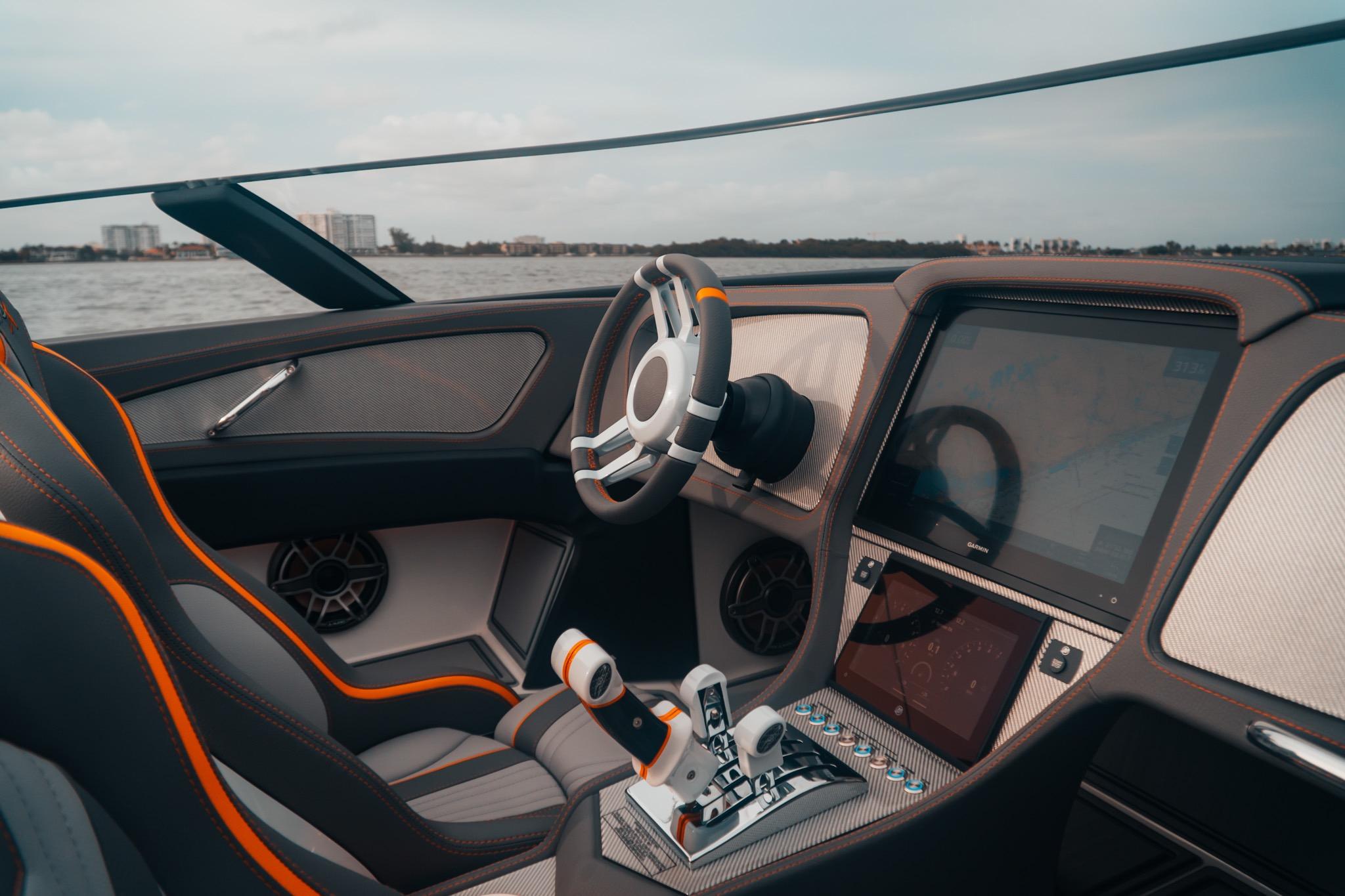 The cockpit features Cool Touch interior with seating for eight, wrapped dash with carbon fiber inserts, a Garmin 17” display, and Mercury GMI-20 instrumentation.