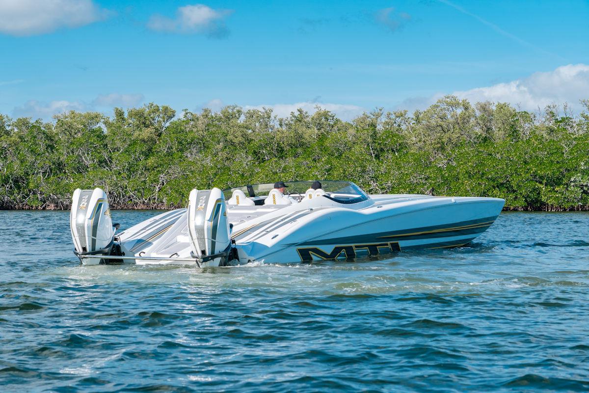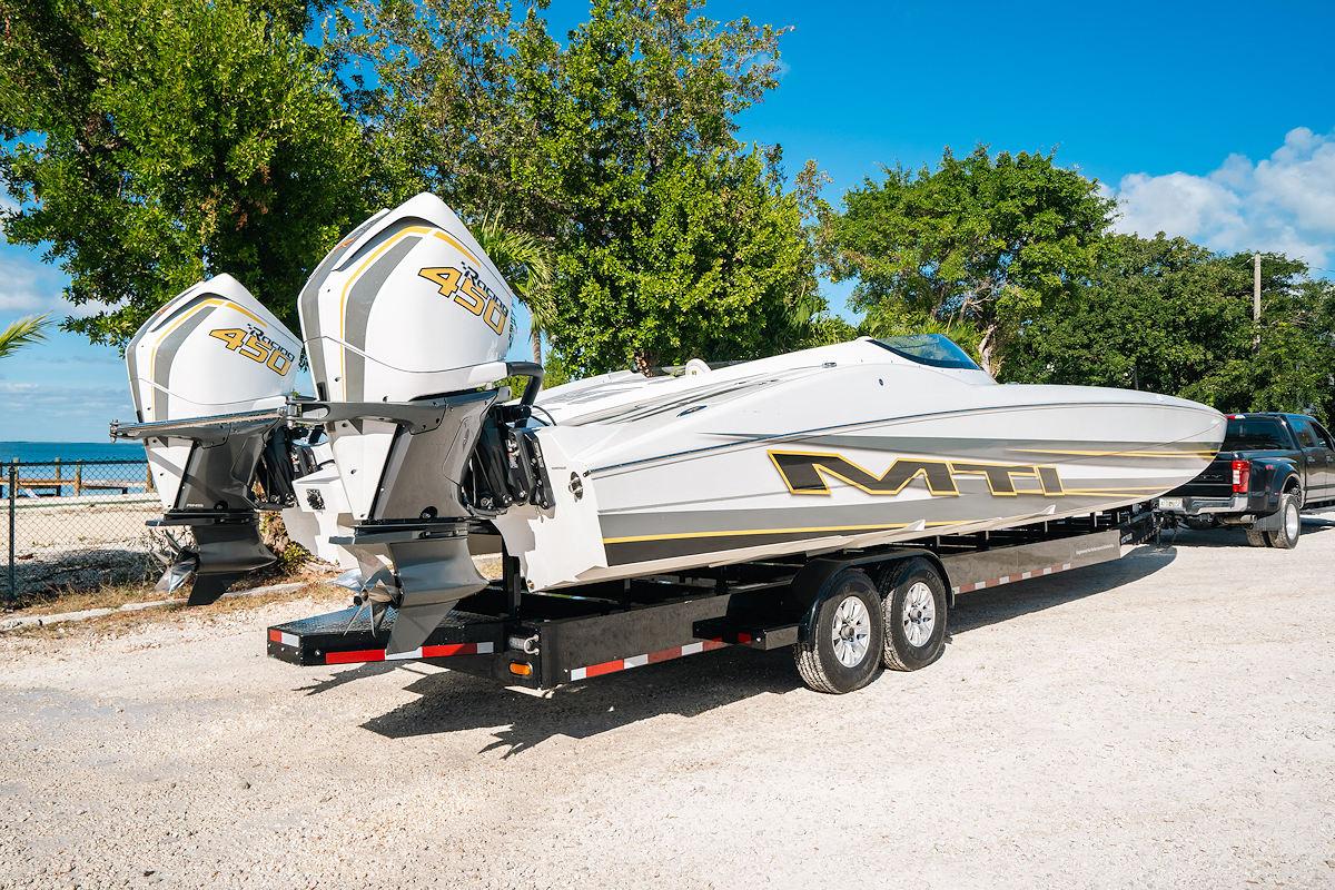 Now available: a 2022 MTI 390X powered by twin Mercury Racing 450R outboards, built with a full carbon fiber layup and loaded with premium performance and technology upgrades. This 39-foot catamaran delivers top-tier engineering, power, and style.