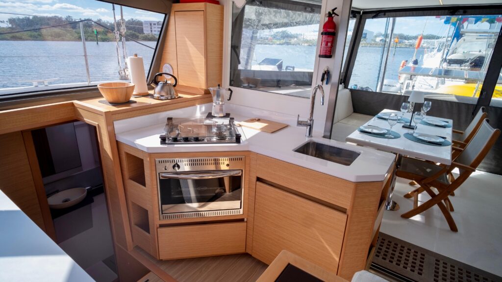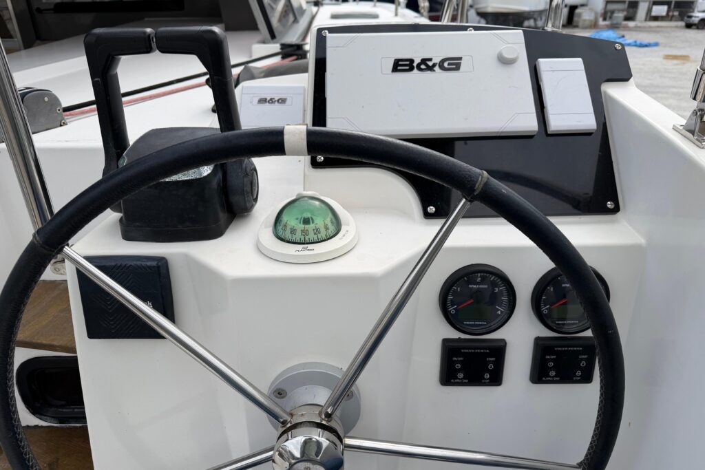 The Nautitech Open 40 is renowned for is unique layout with deck, cockpit, and salon all on one level resulting in a very comfortable live space which incorporates numerous smart design features that result in the feel of a much larger catamaran. Its lightweight construction and streamline design ensure nimble handling and a sporty sailing experience. The twin outboard helm stations provided exceptional visibility and add further to the thrill of sailing this fantastic catamaran.
