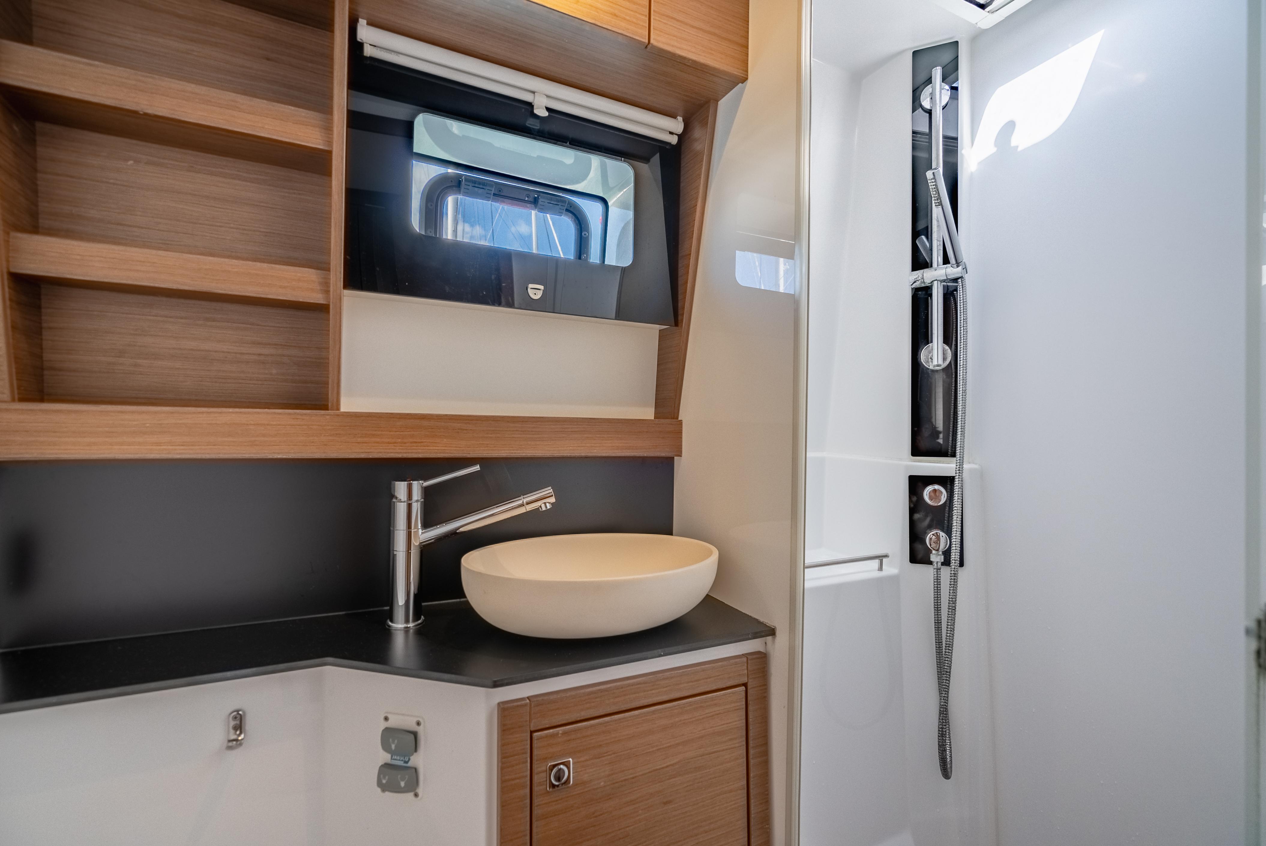 Below, Seas’d Up is luxuriously appointed with light oak joinery, a durable synthetic walnut cabin sole, and Nautitech’s signature Open cockpit concept, seamlessly merging cockpit and saloon into one vast, single-level living space. Interior design is by Stéphane Roséo, delivering a refined yet contemporary atmosphere throughout.