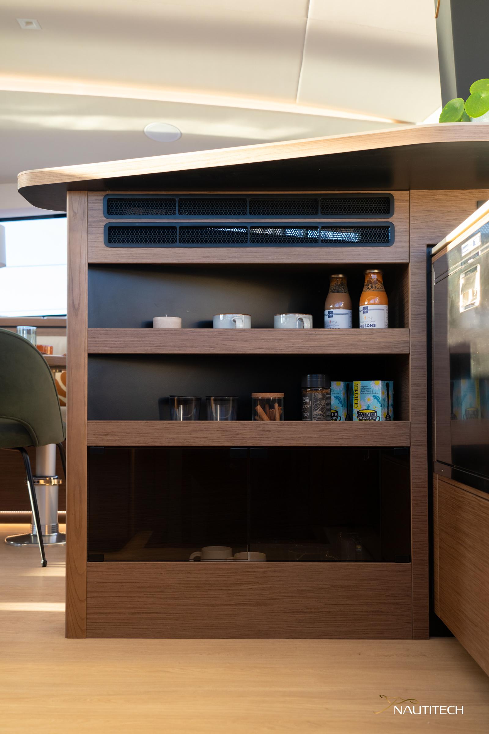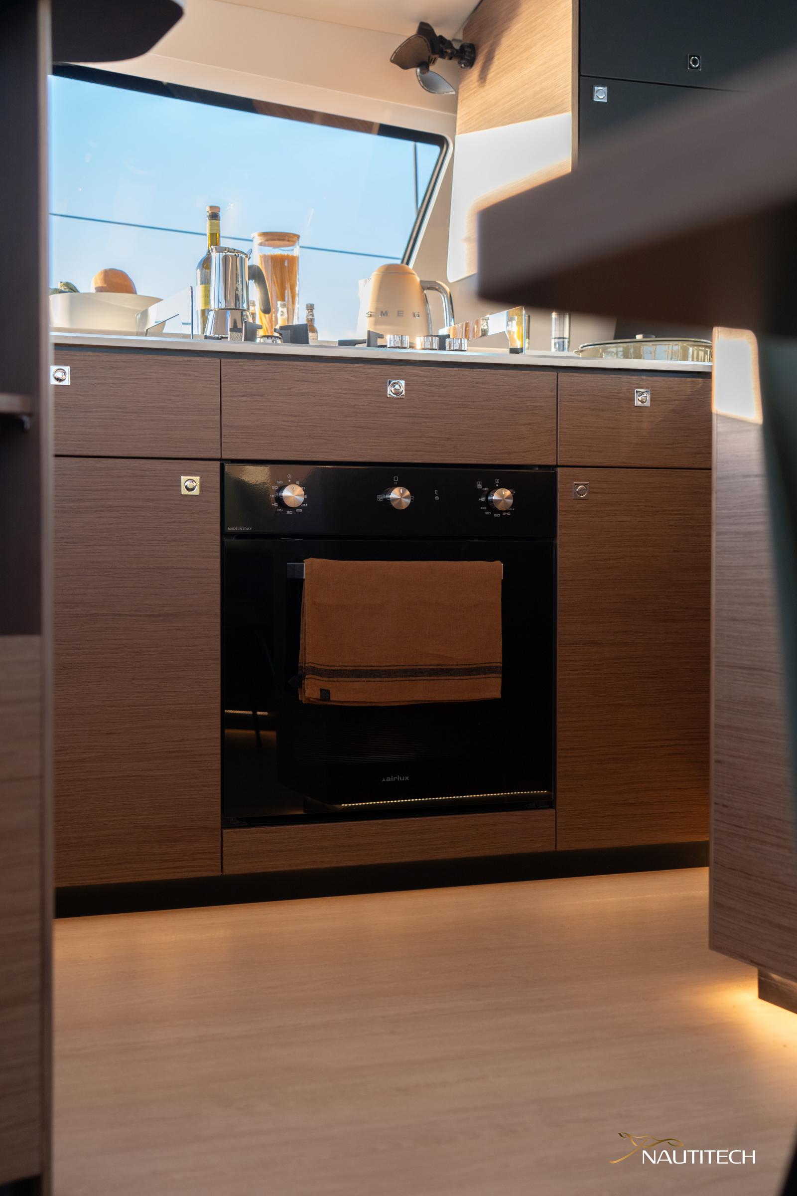 A modern and elegant atmosphere created in collaboration with the designer Christophe Chedal-Anglay. The 48 Open is available in standard light walnut and optional oak finishing to match with all tastes. Enjoy the spacious kitchen with all the appliances at your fingertips.