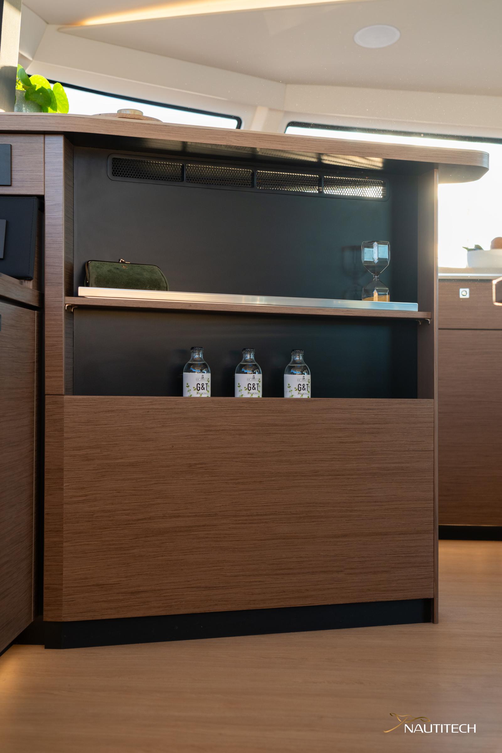 Benefit also from the iconic bar in the heart of the living area. Close to the mast and located at the center of gravity of the boat, it is where people will join together, discuss the route, and probably "elevate their dream" with enthusiasm. The place that naturally attracts everyone on board. Benefit from the large lounge area and a large chart table.