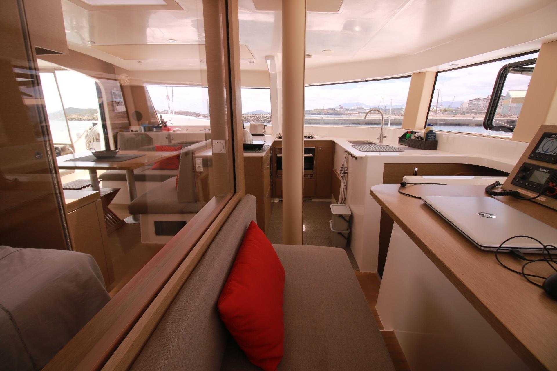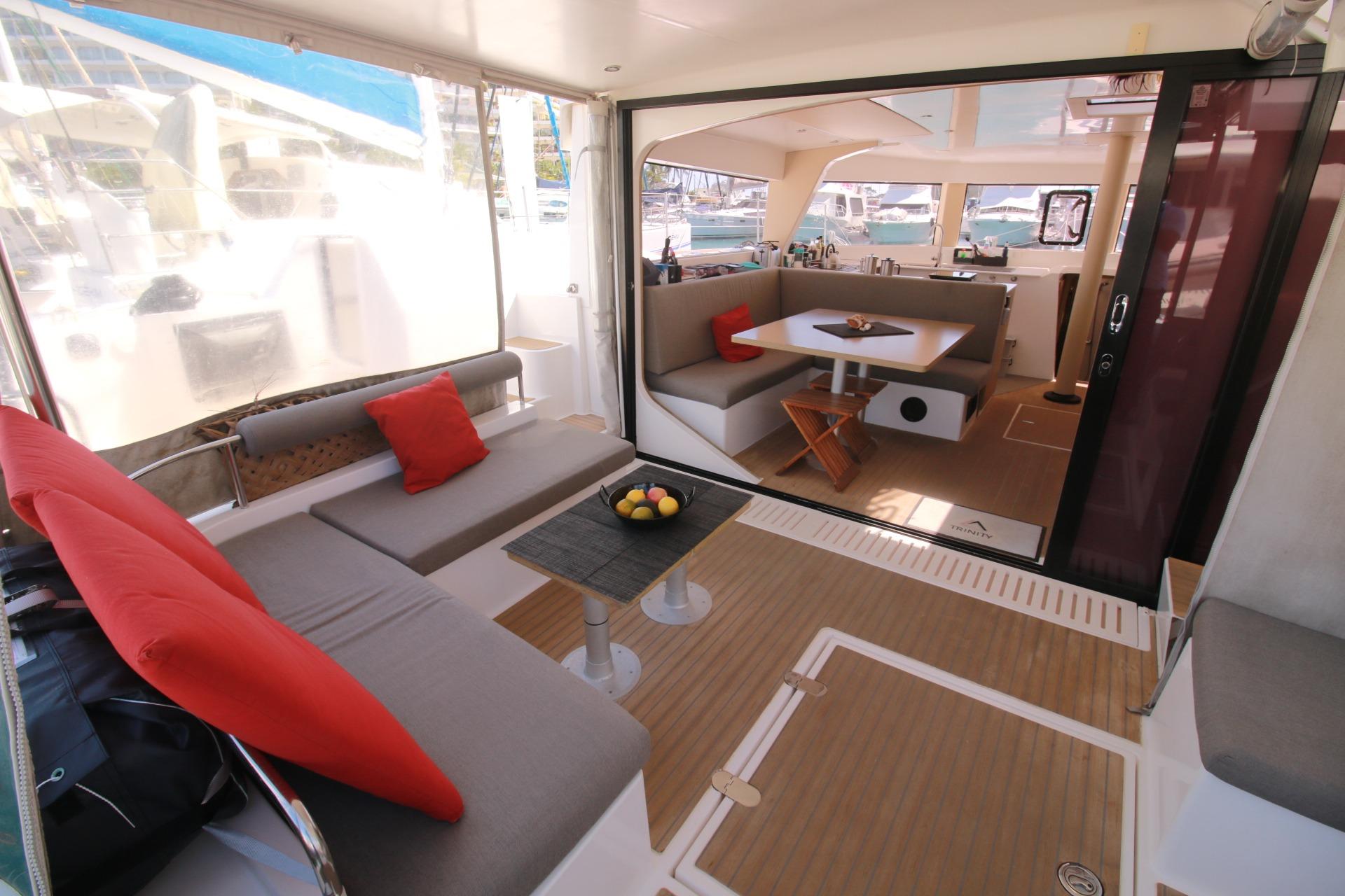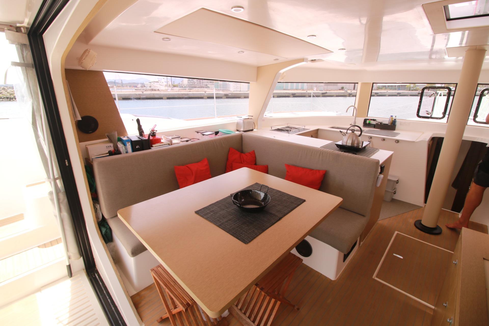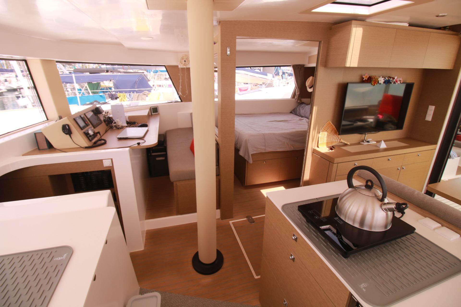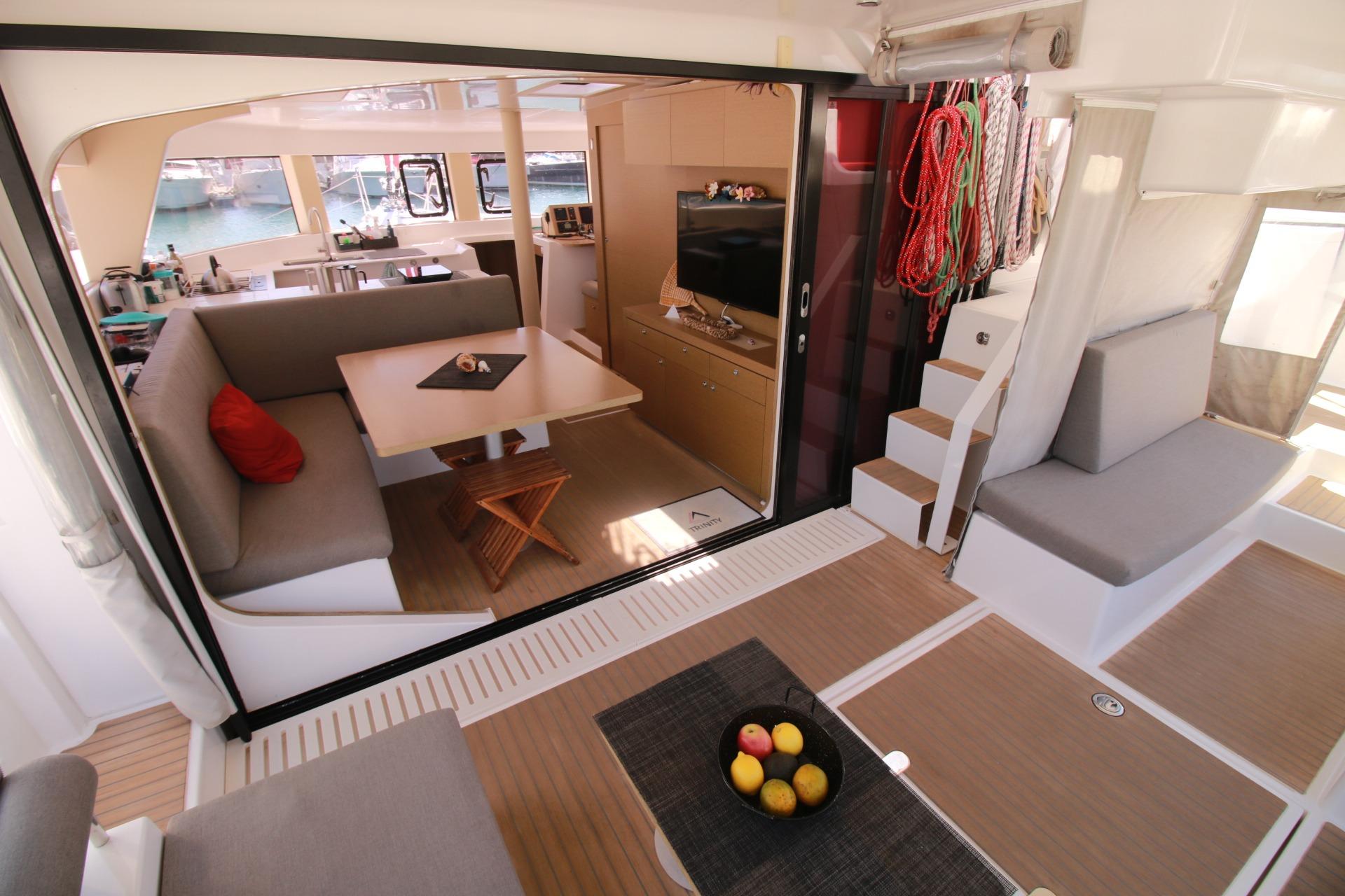 La vie à bord est particulièrement confortable : une cabine propriétaire luxueuse avec un matelas Tempur neuf, un carré lumineux et spacieux avec une grande télévision, une circulation de plain-pied vers le cockpit entièrement protégé par des bâches transparentes, une machine à laver neuve et un dessalinisateur fiable garantissant une autonomie totale en eau douce.
