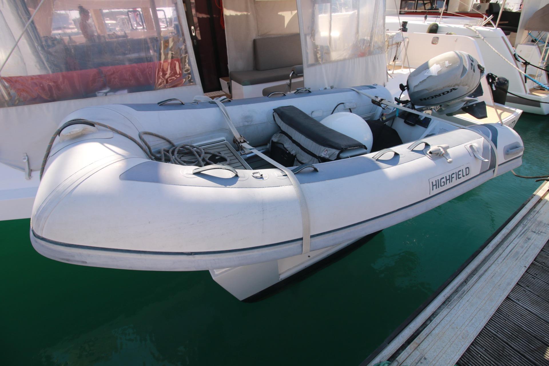 Côté navigation et communication, le trimaran est équipé de l’électronique B&G la plus récente, de deux pilotes automatiques totalement indépendants, d’un radar, de l’AIS, de deux systèmes Starlink (V2 et Mini), d’un Iridium Go et d’un Garmin Reach. L’annexe principale en Hypalon, motorisée par un hors-bord Honda 20 ch, est idéale pour la plongée et les explorations lointaines, tandis qu’une seconde annexe avec moteur électrique est parfaite pour de courts trajets ou pour des stockages à terre.