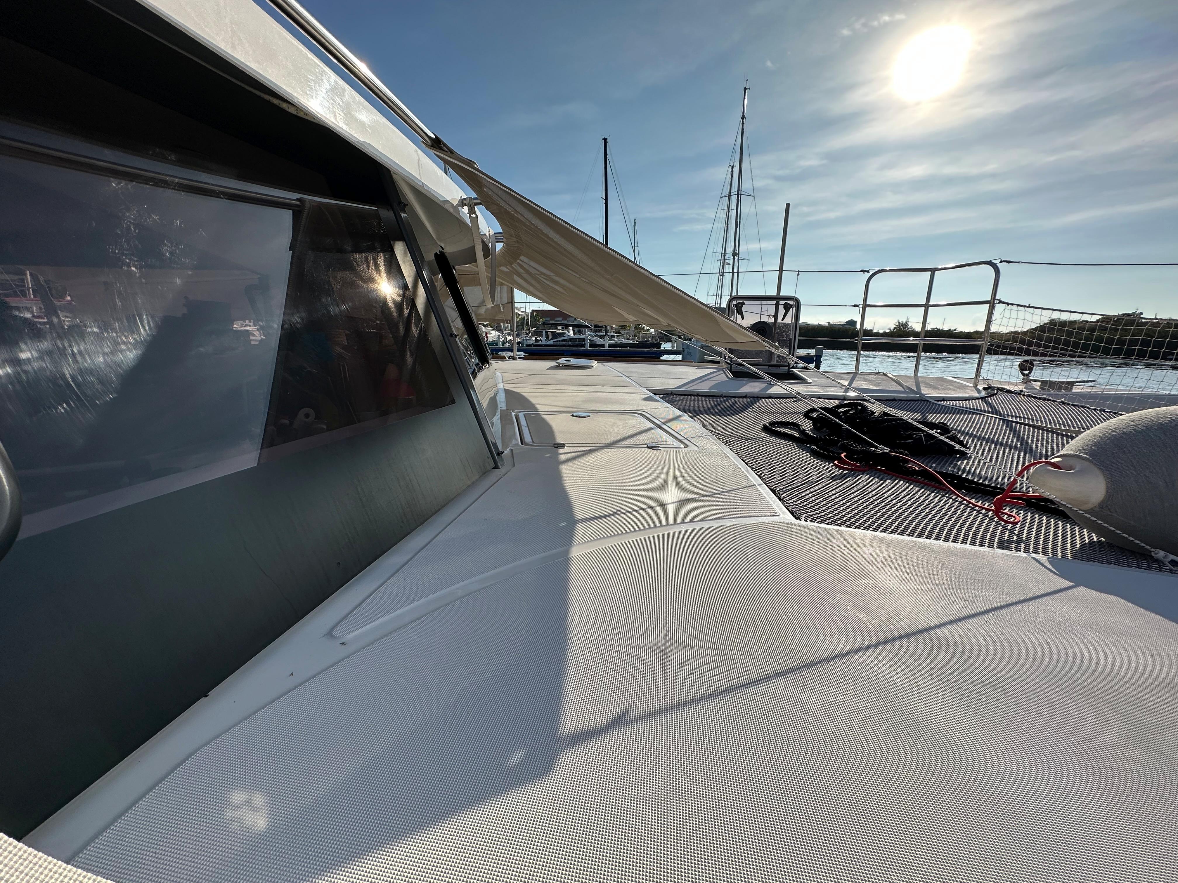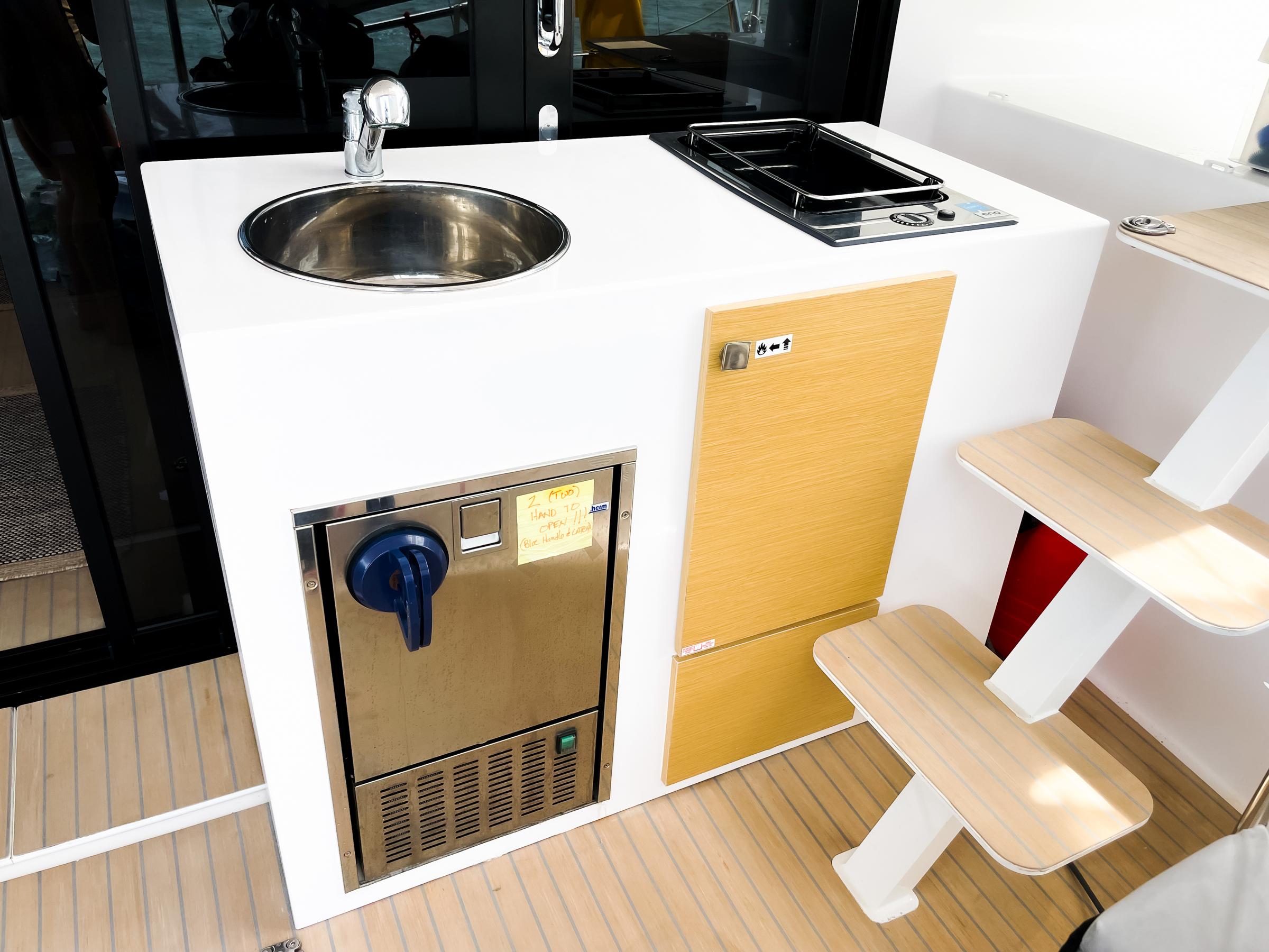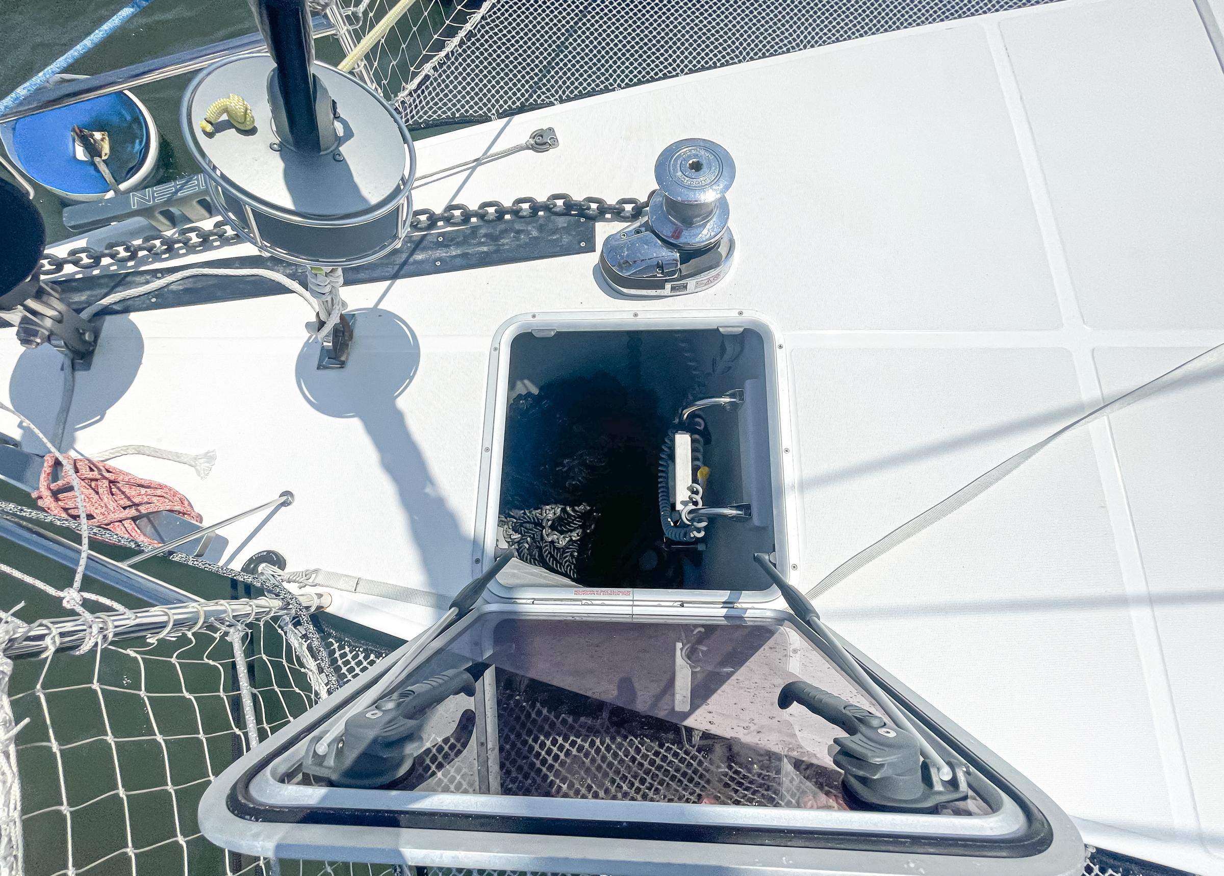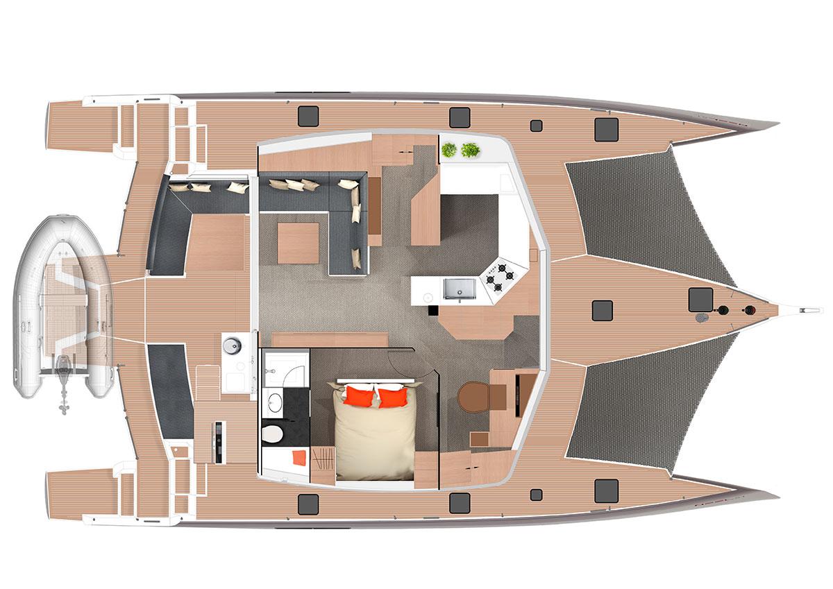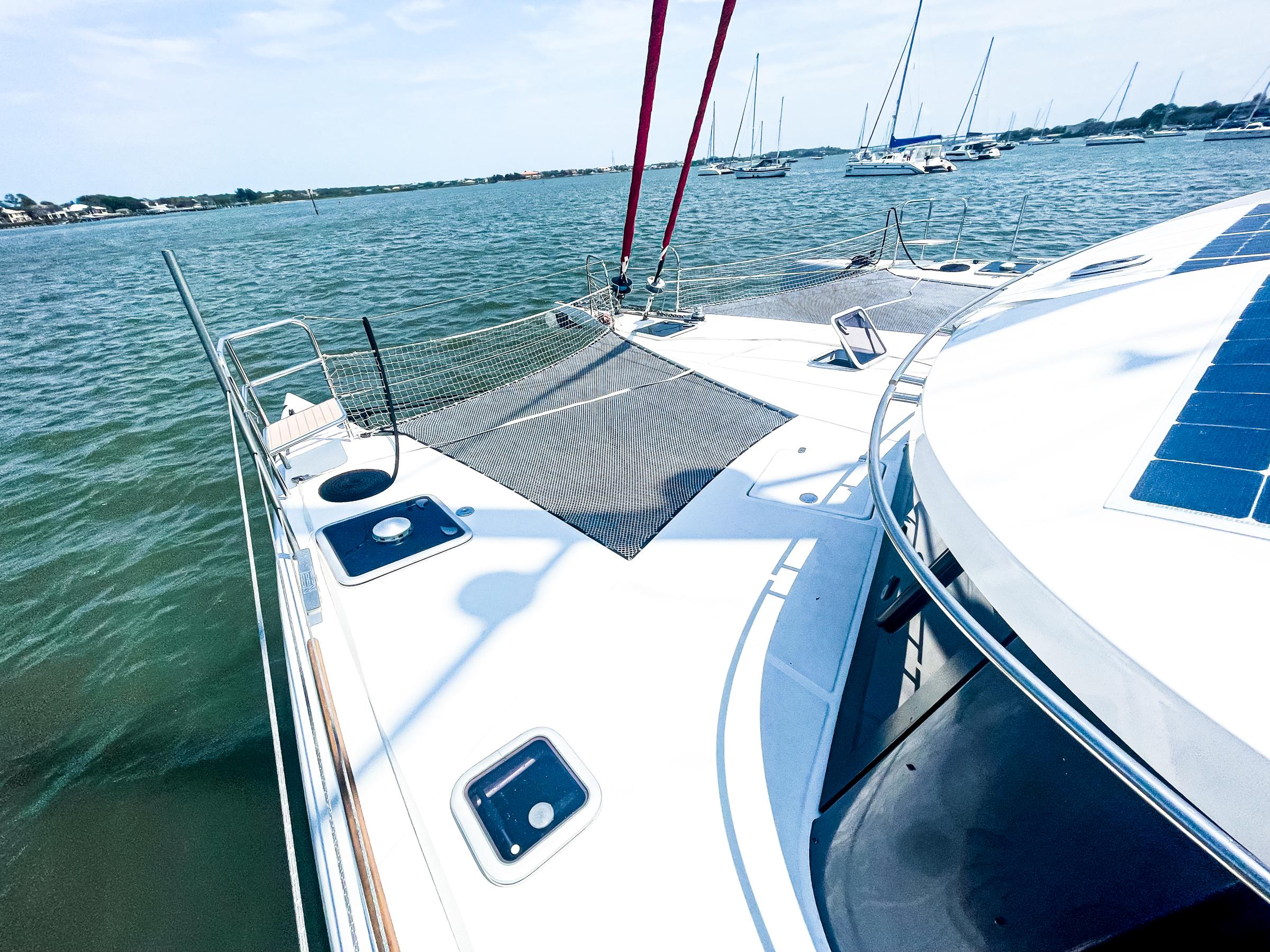 The expansive flush deck areas provide ample space for outdoor activities, whether it’s working the deck under sail or sunbathing on the roof top lounge. There are huge storage lockers in both amas that can be accessed from the cockpit and the dinghy is stored on fixed chokes for security at sea. There is a focus on safety with extra tall stanchions, dyneema lifelines, side netting, and numerous handholds.