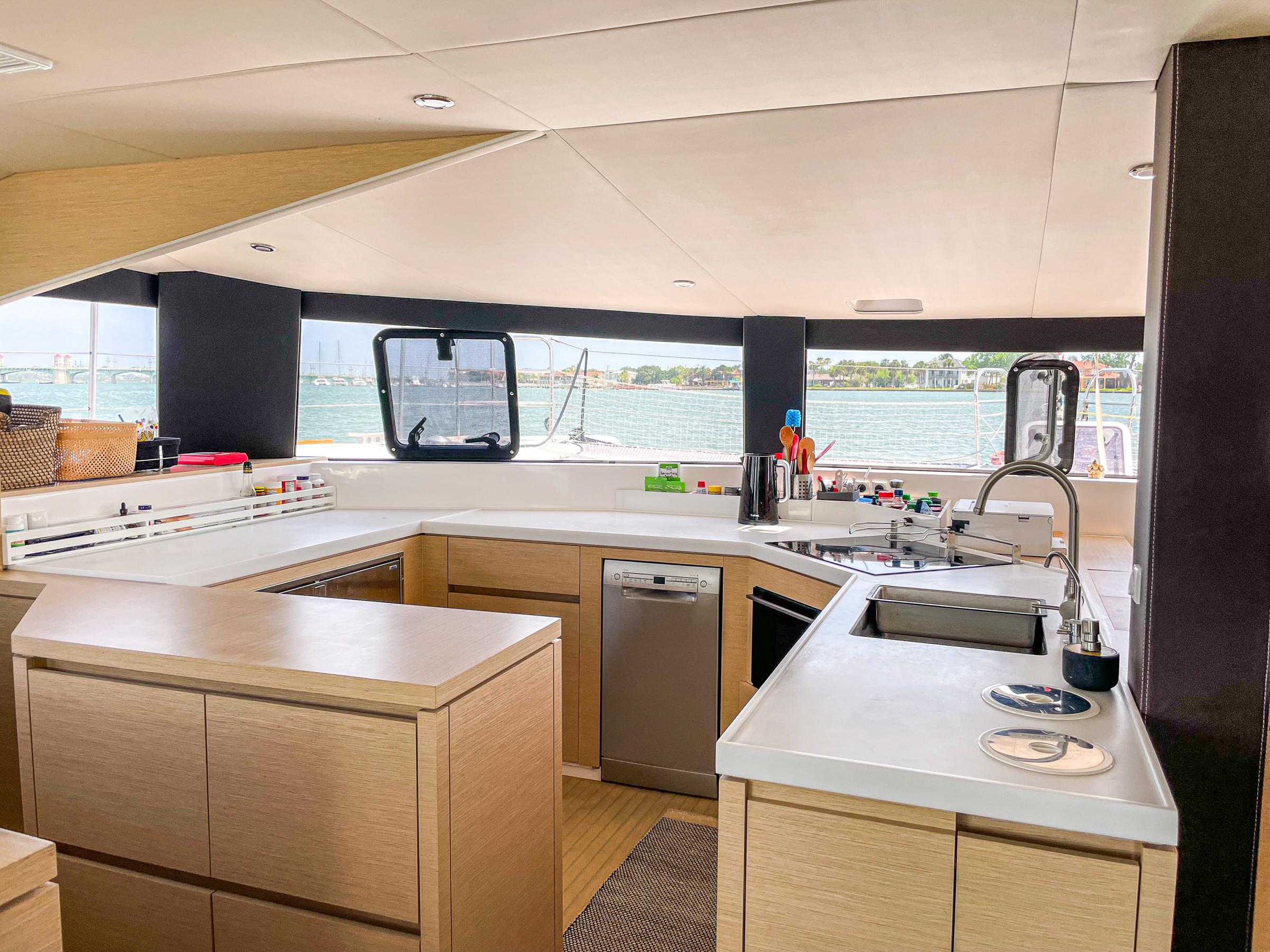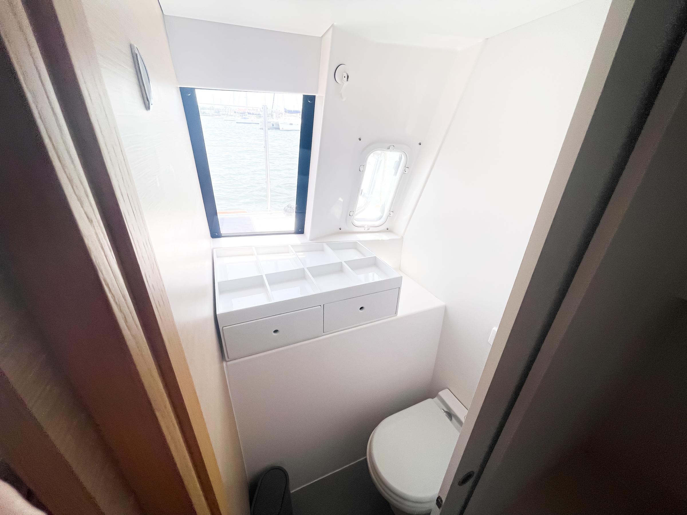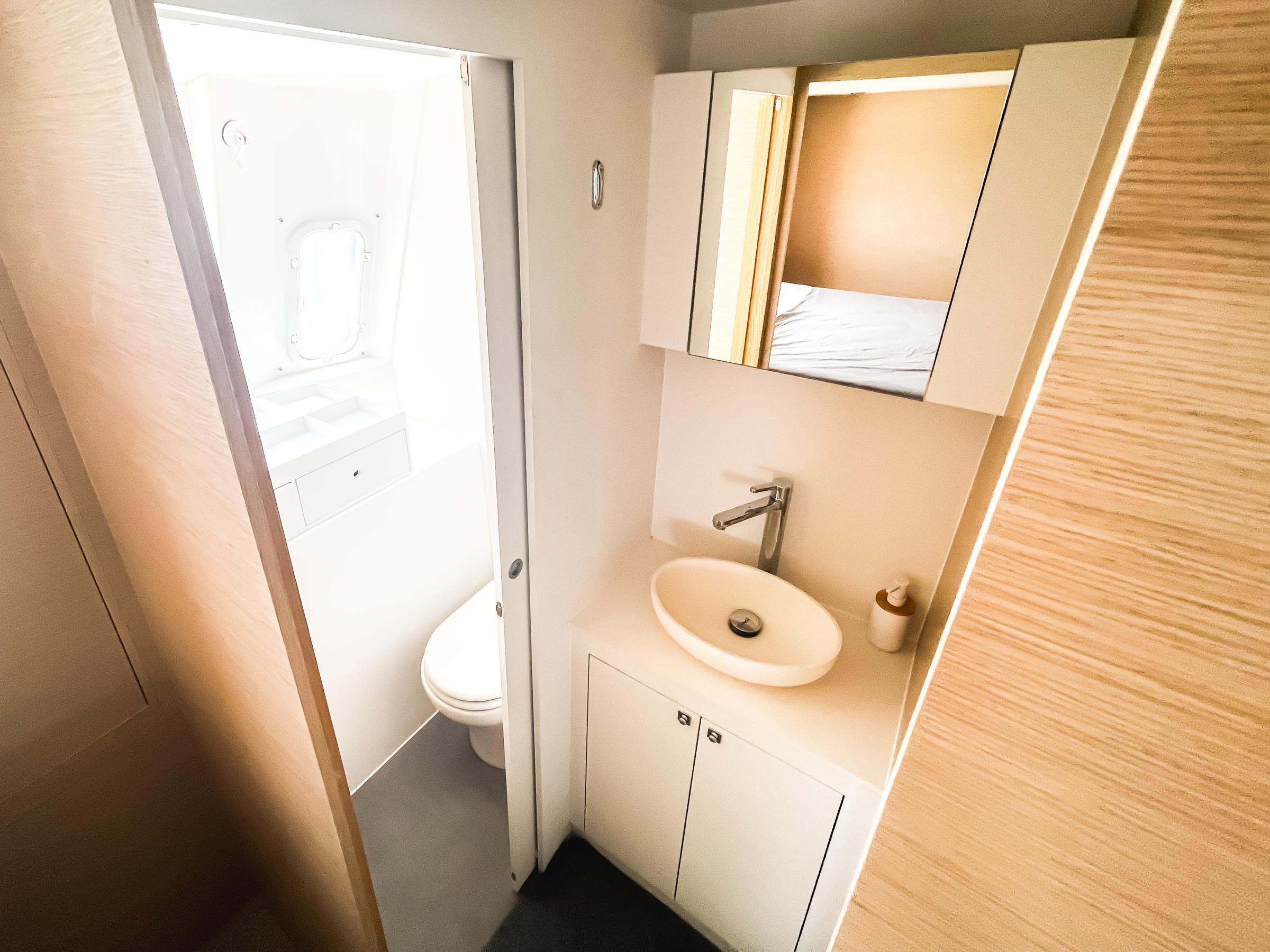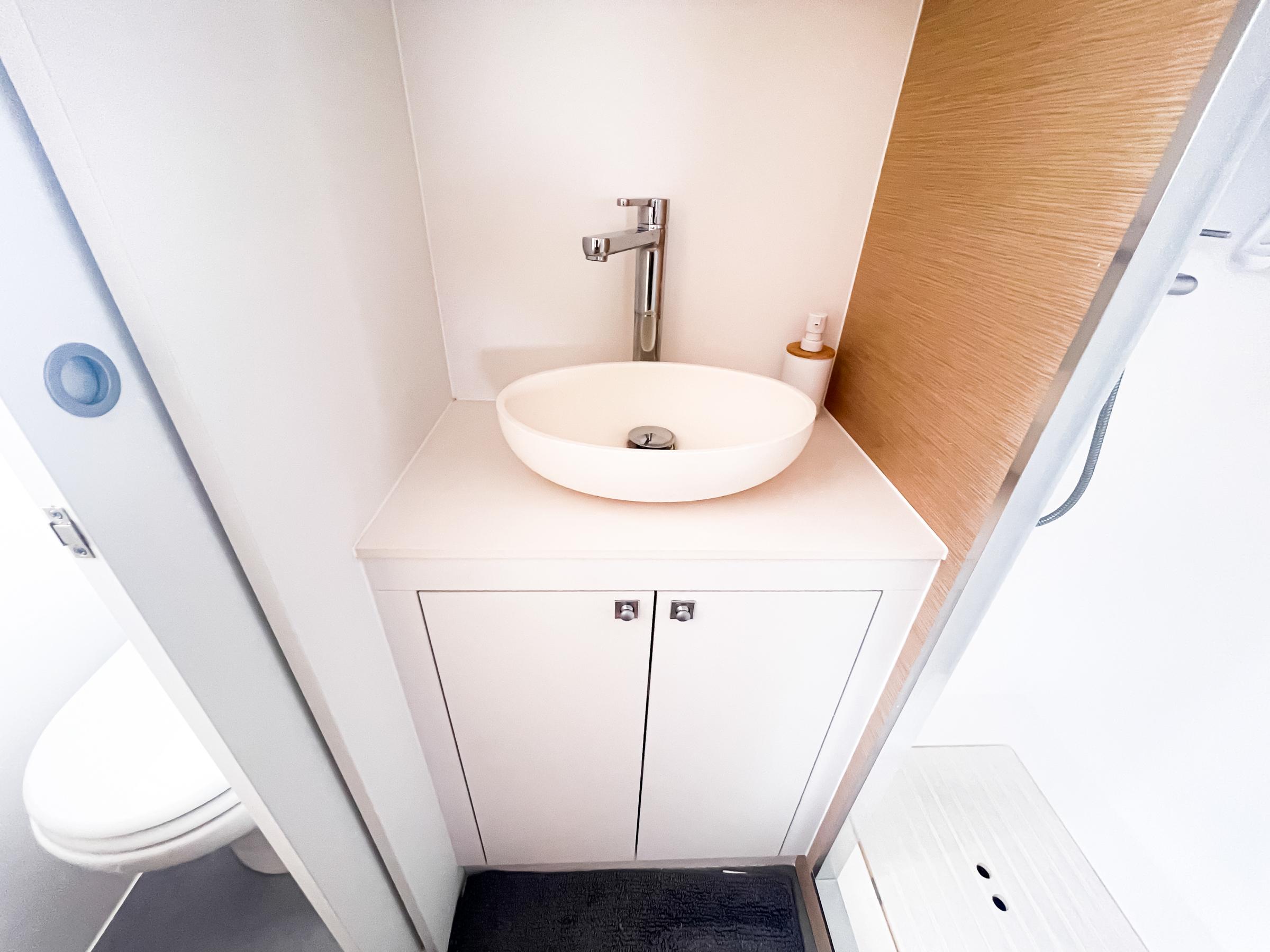 Out Of The Woods features the desirable 4-cabin layout with a deck level master cabin. The deck level master cabin is one of the defining features of the Neel 51 design that offers convenient access, reduced noise, and stunning views which just cant be achieved on other multihulls. It has a large en suite head with separate shower stall. The 3 guest cabins are situated in the bow and both amas – they all include queen bunks and en suite heads and showers elegantly designed with modern fixtures and finishes.
