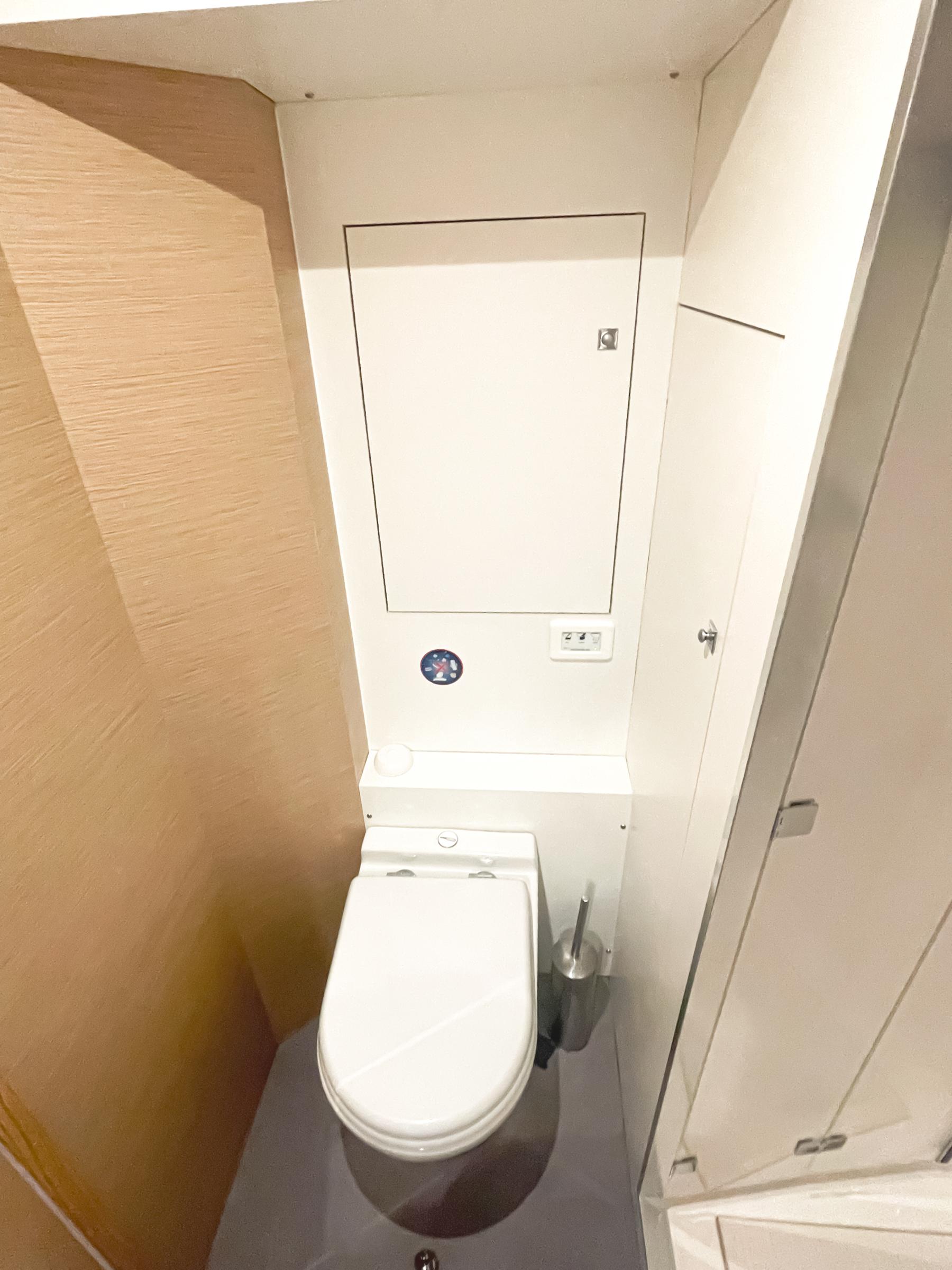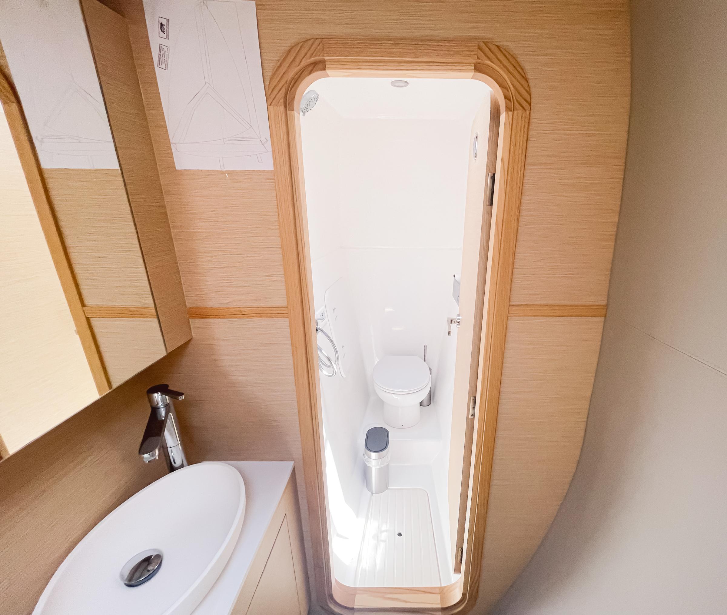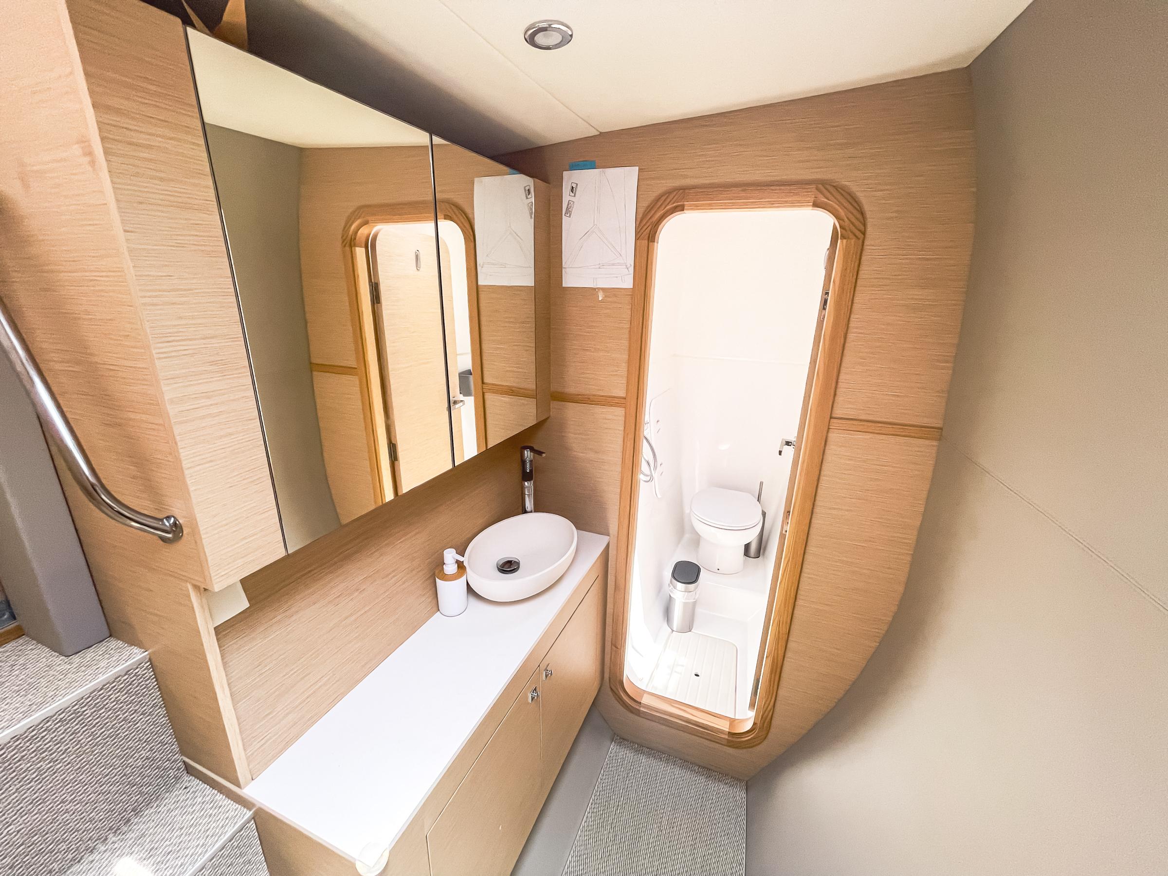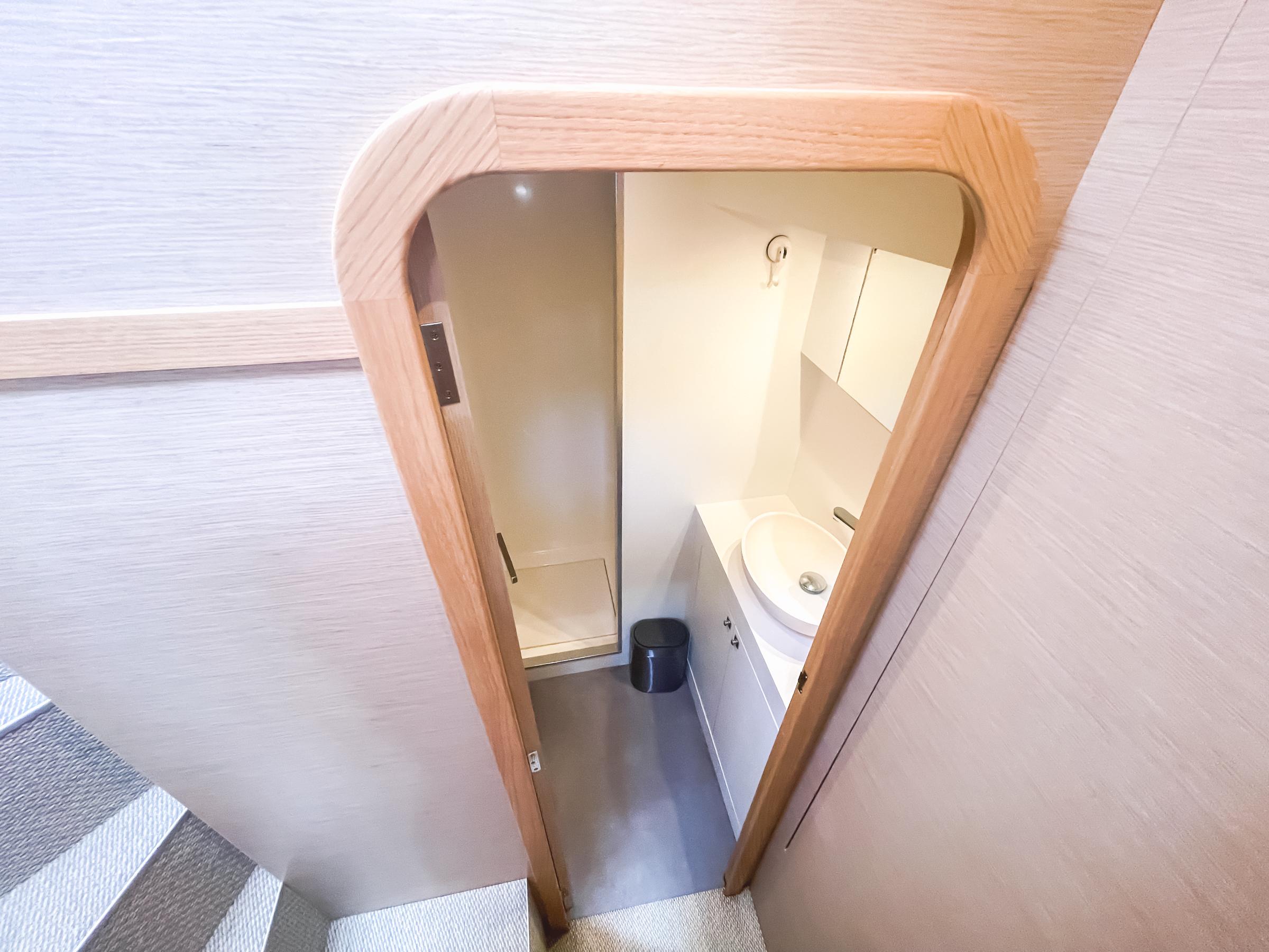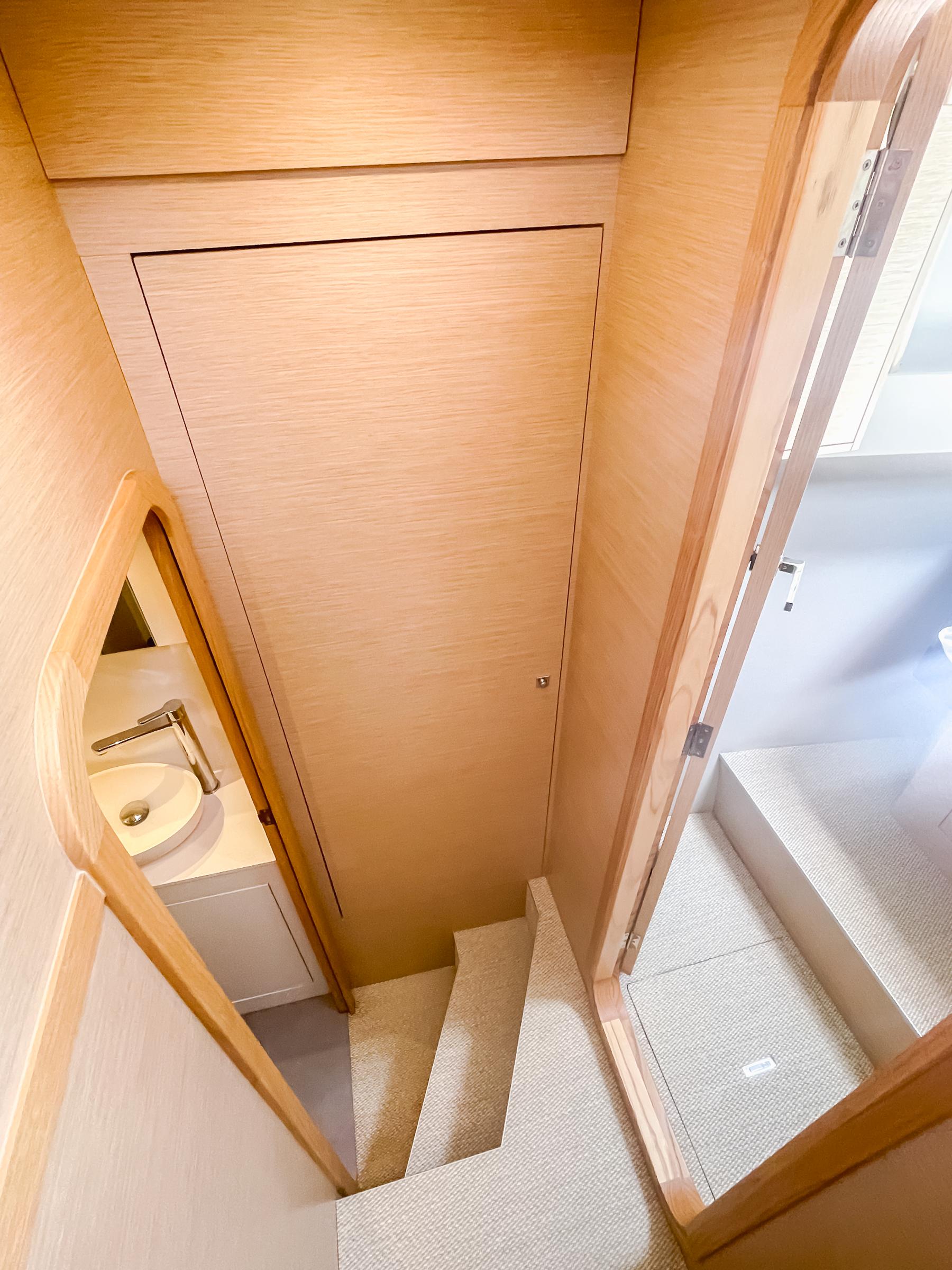 The galley is a chef’s dream, fully equipped with modern appliances such as the induction cooktop, convention oven, dishwasher, and abundant refrigeration. The circular galley offers unmatched countertop space and storage for all your culinary needs. Plenty of overhead and forward opening hatches ensure wonderful ventilation. It’s a versatile and functional space where you can create gourmet meals even while offshore sailing.