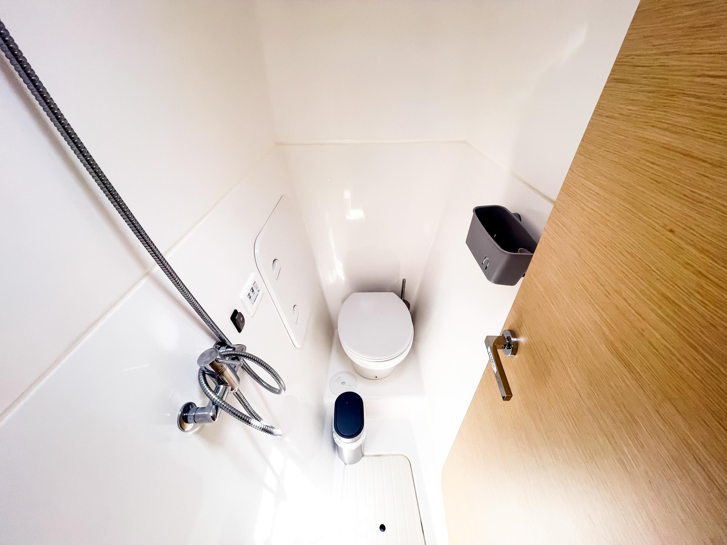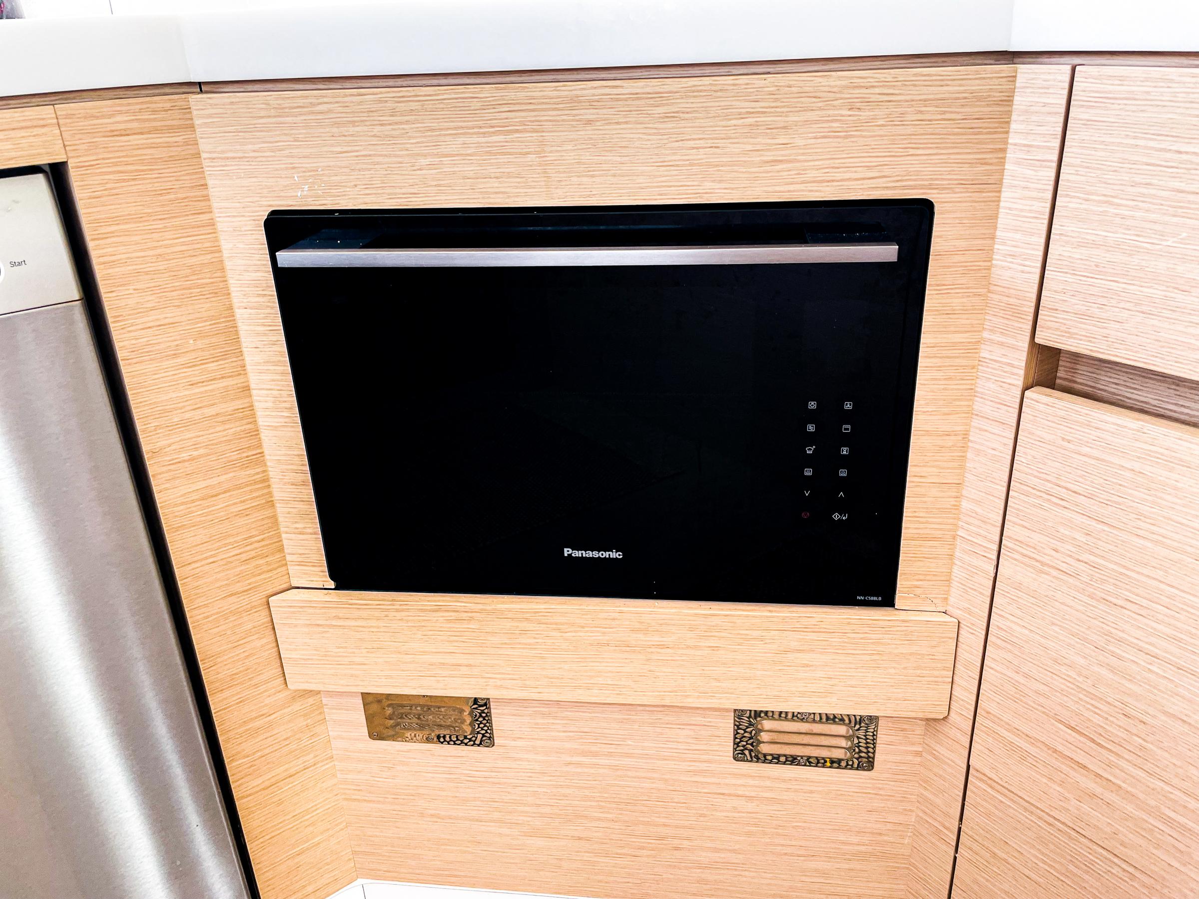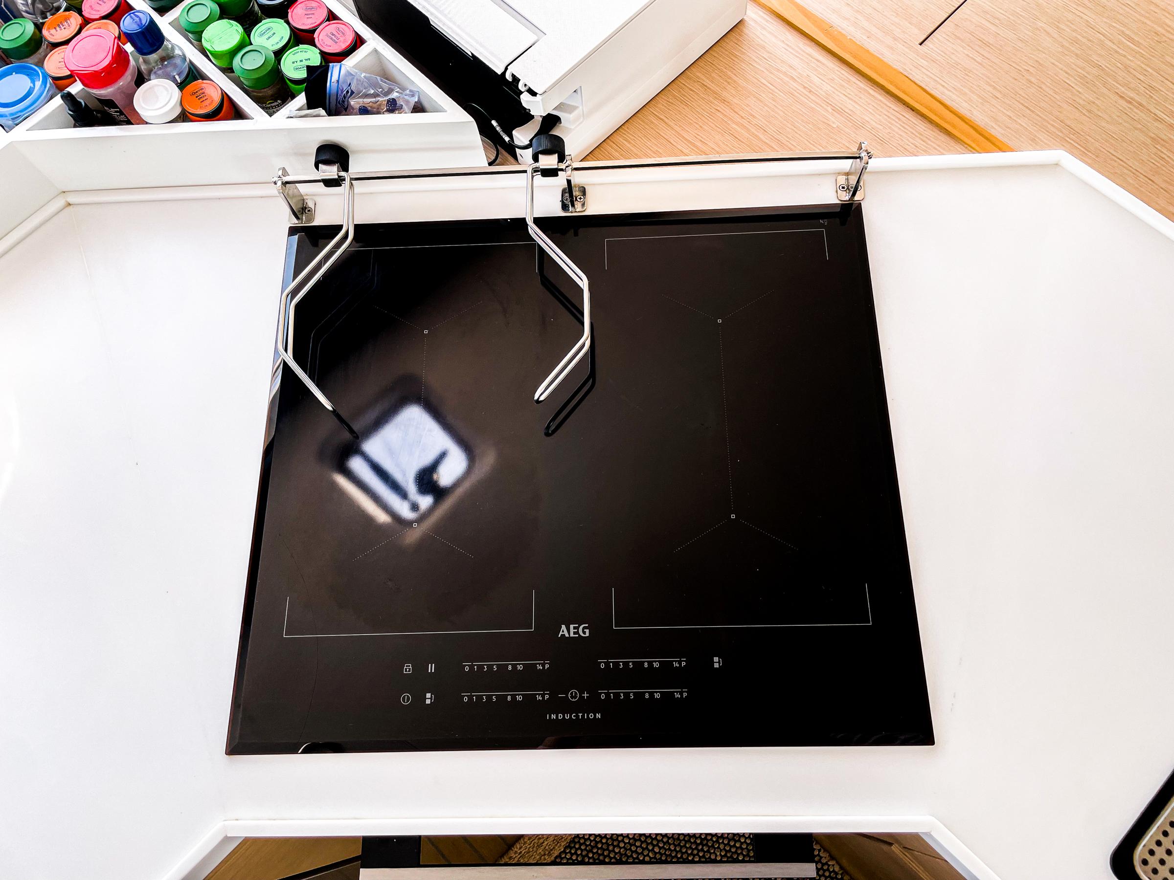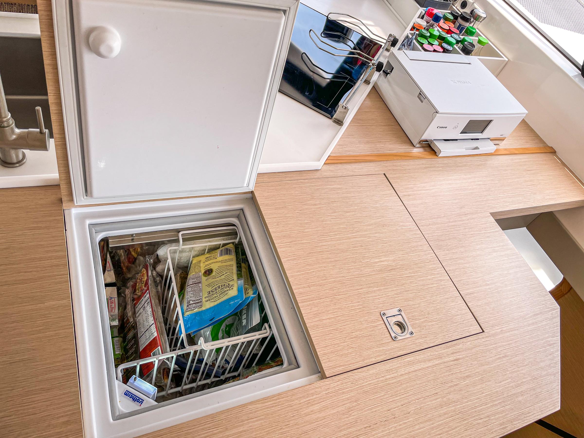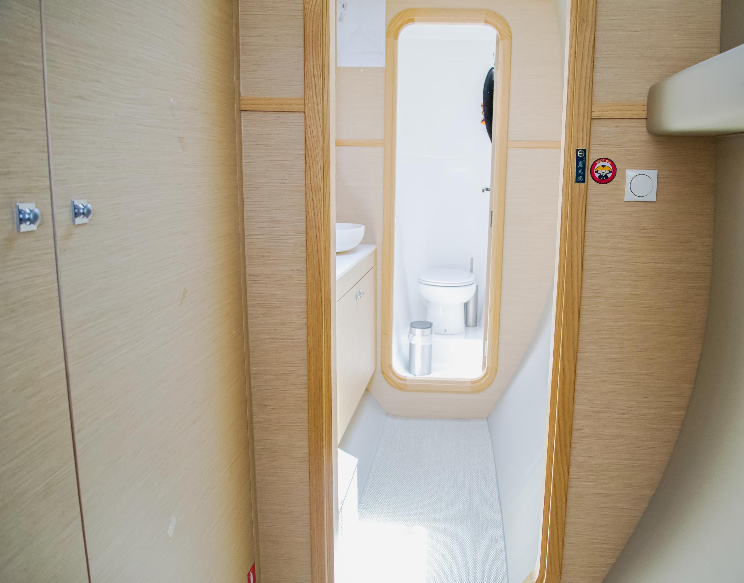 The galley is a chef’s dream, fully equipped with modern appliances such as the induction cooktop, convention oven, dishwasher, and abundant refrigeration. The circular galley offers unmatched countertop space and storage for all your culinary needs. Plenty of overhead and forward opening hatches ensure wonderful ventilation. It’s a versatile and functional space where you can create gourmet meals even while offshore sailing.
