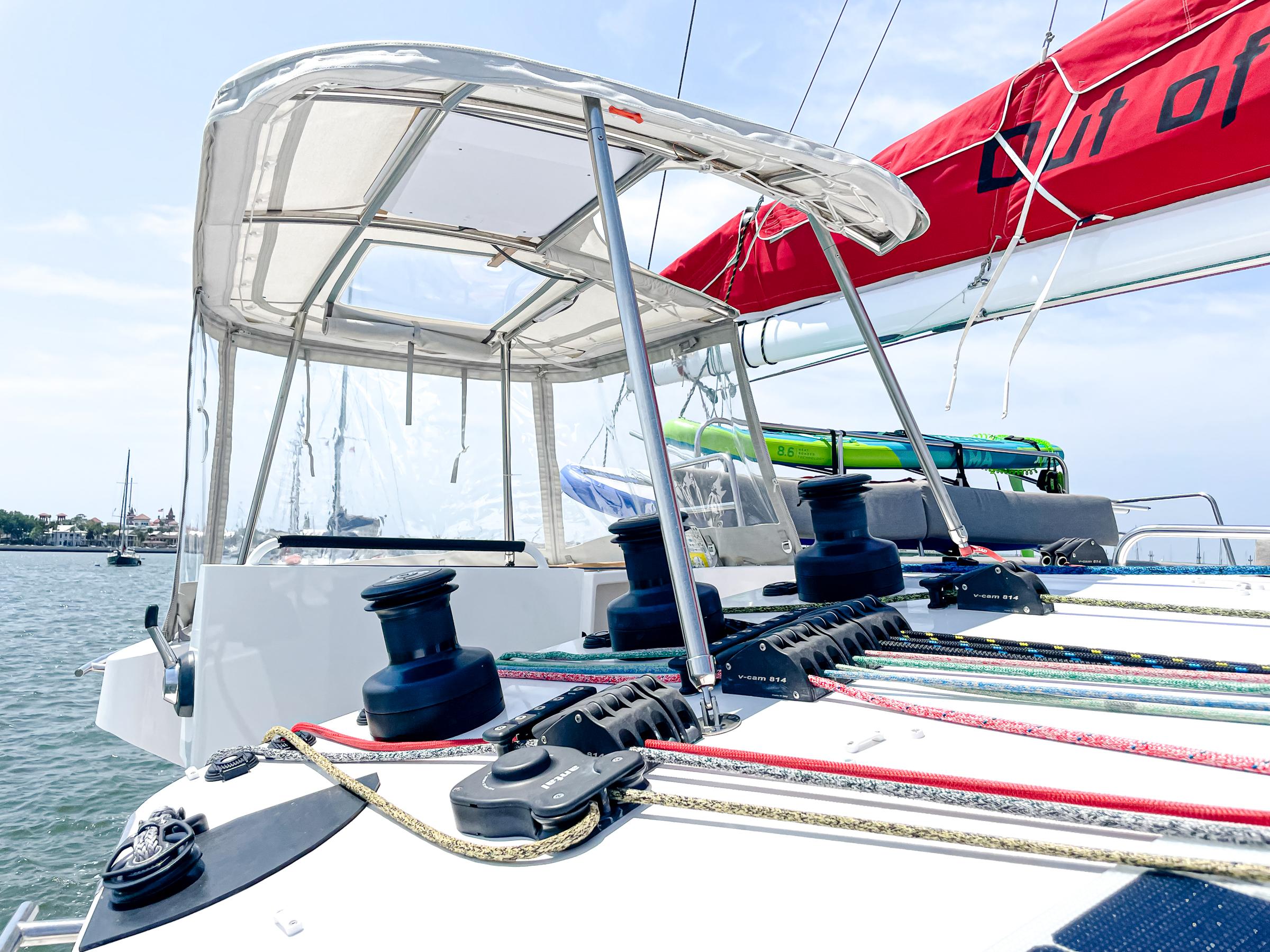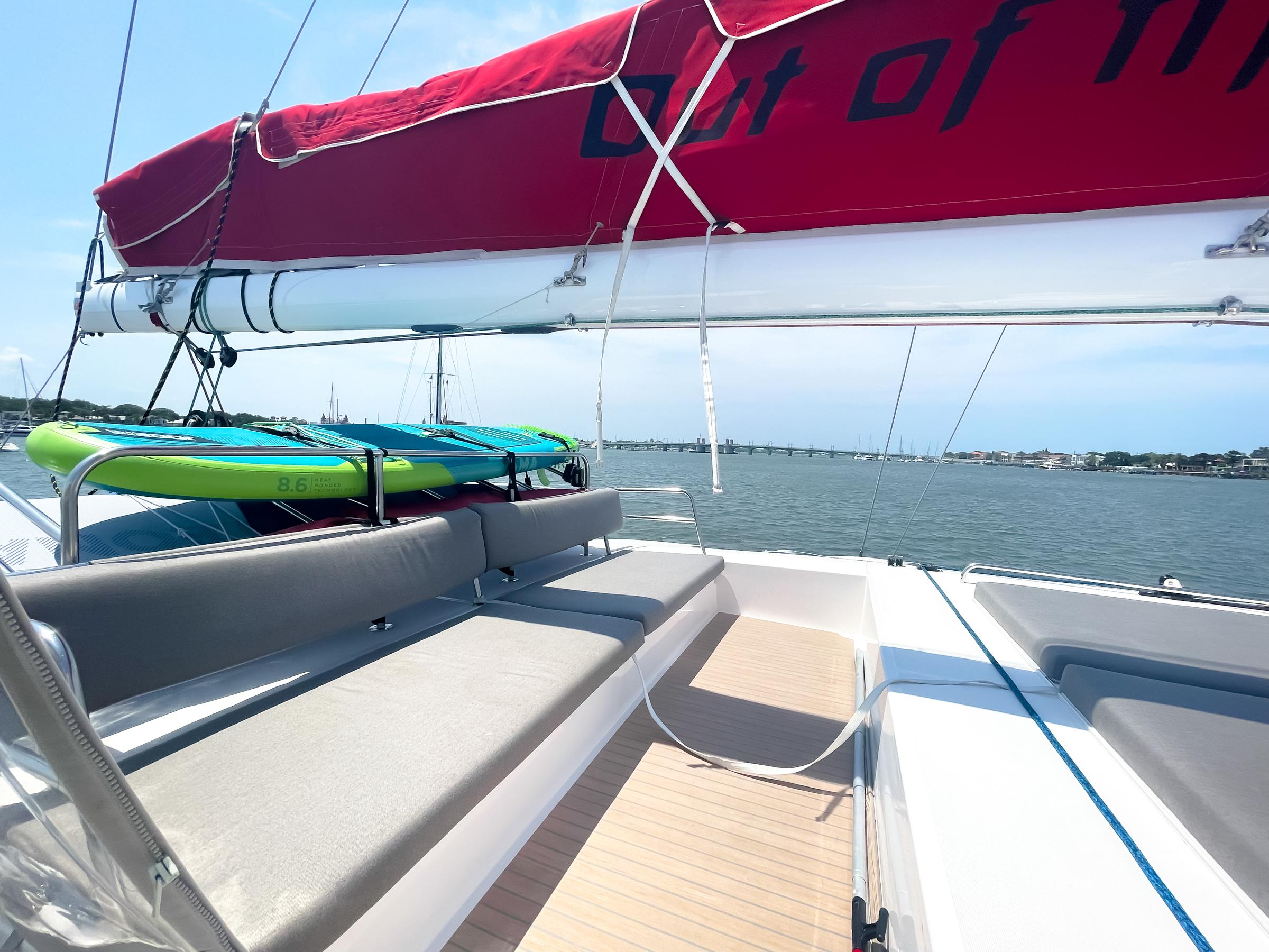 Out Of The Woods is equipped with the Performance Sailing package from the Neel factory which includes a carbon mast, Hyrdanet sails, composite standing rigging, and dyneema running rigging. The owner has further supplemented this amazing kit with a parasailer spinnaker, assymetrical spinnaker, and professional rig tuning that optimized sailing performance.