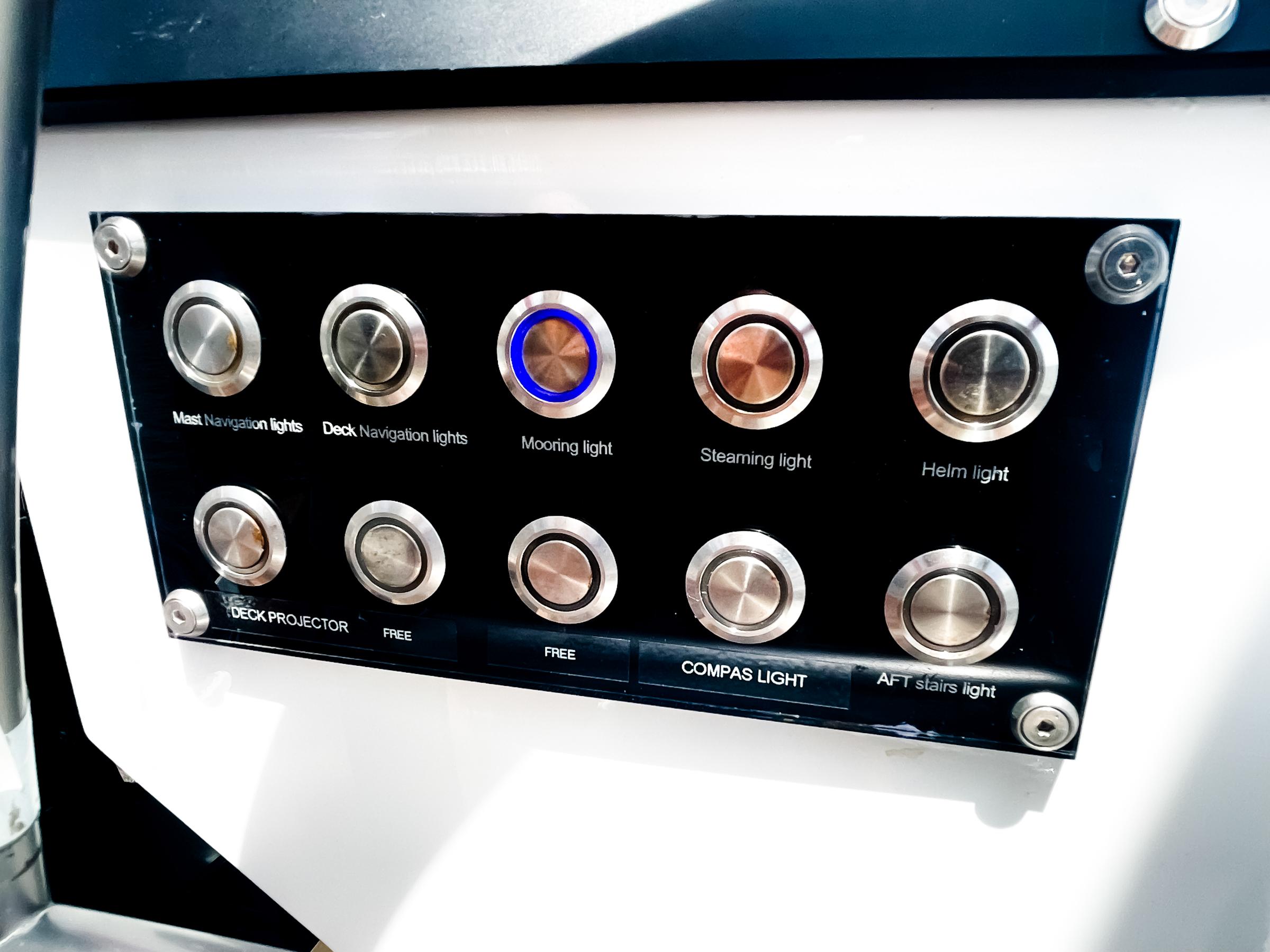 The functionally designed helm features fantastic access from the cockpit or the side deck. It incorporates a comfortable helm seat that easily accommodates two adults. All lines are run through a custom deck organizer to the 3 electric winches with a full set of Antal clutches. The steering position is similar to a bulkhead oriented helm on a catamaran which offers great visibility and sight lines. It is protected by a built in dodger with removable enclosure. The helm station sports a full set of electronics and vessel controls.