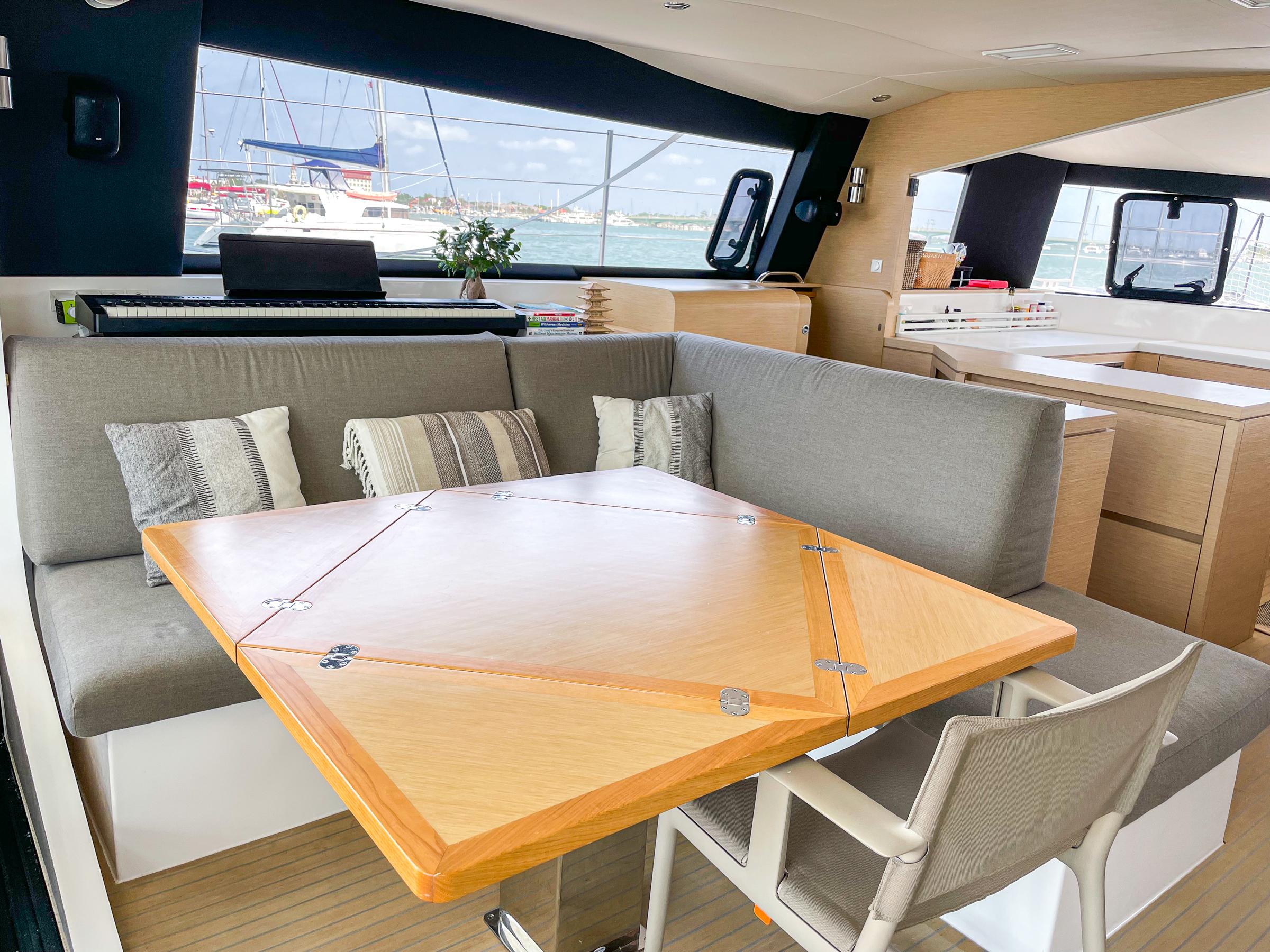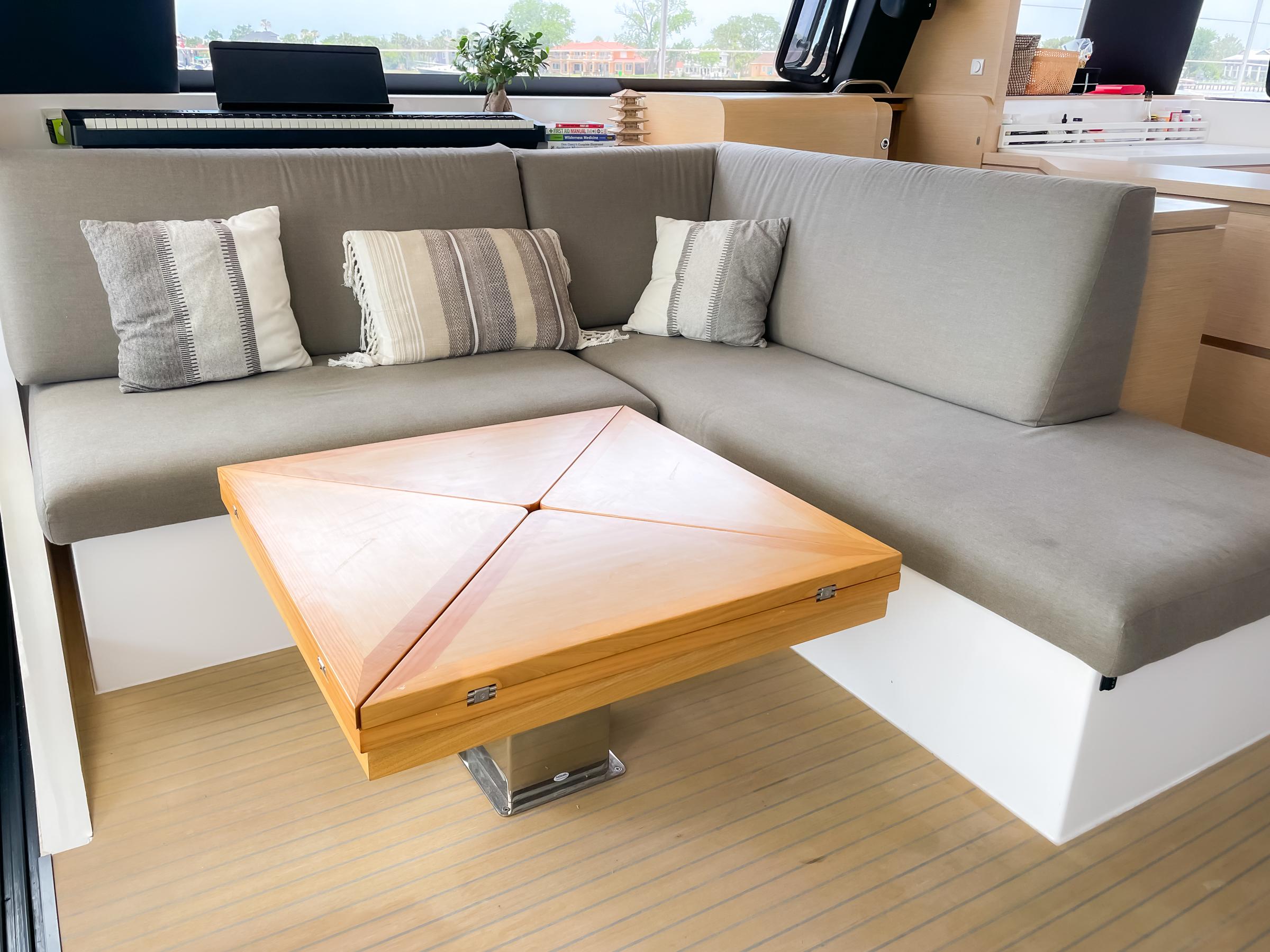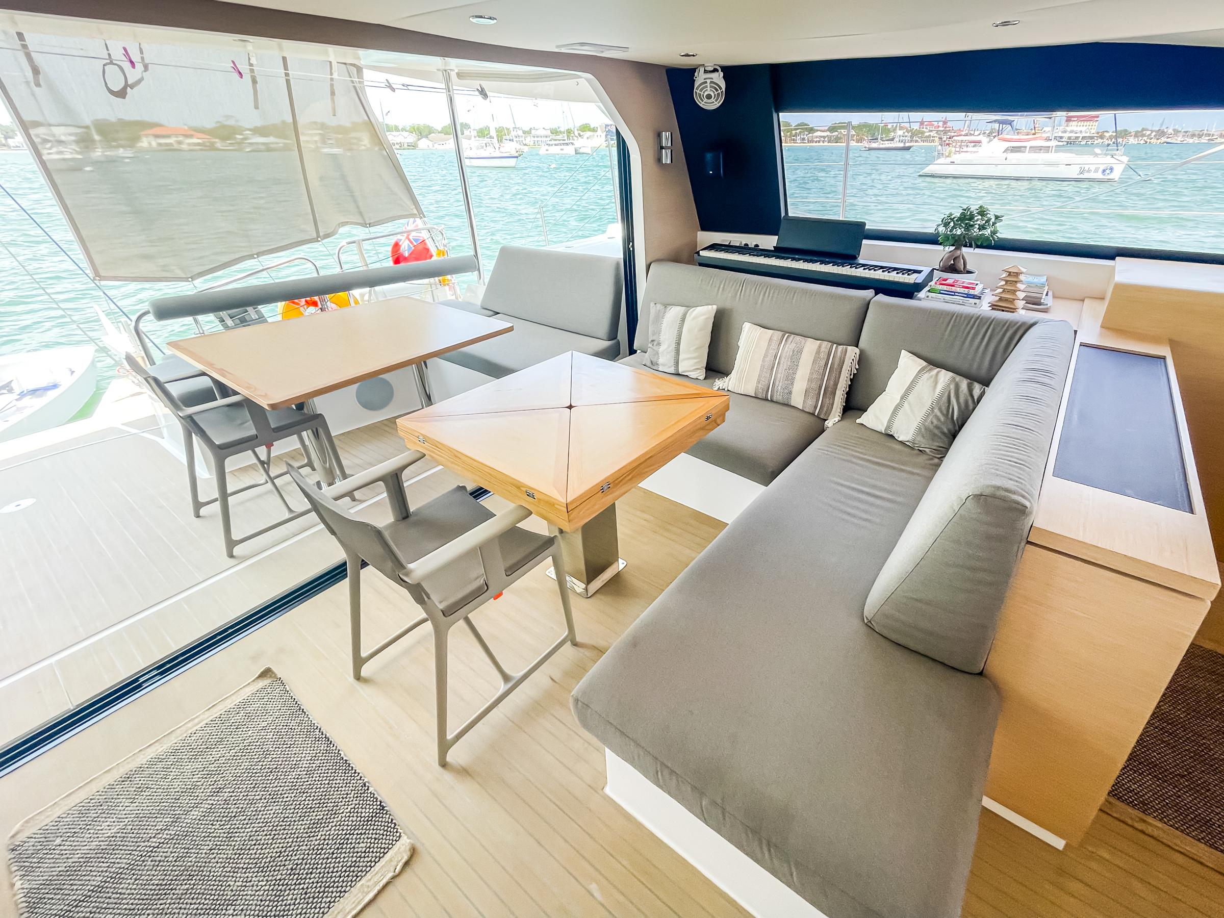 The spacious salon seamlessly integrates with the galley and cockpit area thanks to the 12ft wide sliding doors, creating a perfect open-concept space for relaxation and entertainment. Your guests will have easy access to a cold drink from the ice maker in the cockpit wet bar. The grill master will also be all smiles with the built in Eno gas Plancha. The cockpit table or the large convertible salon table can seat six adults each with plenty of elbow room. The ample comfortable seating provides a delightful setting for enjoying meals or entertaining guests.