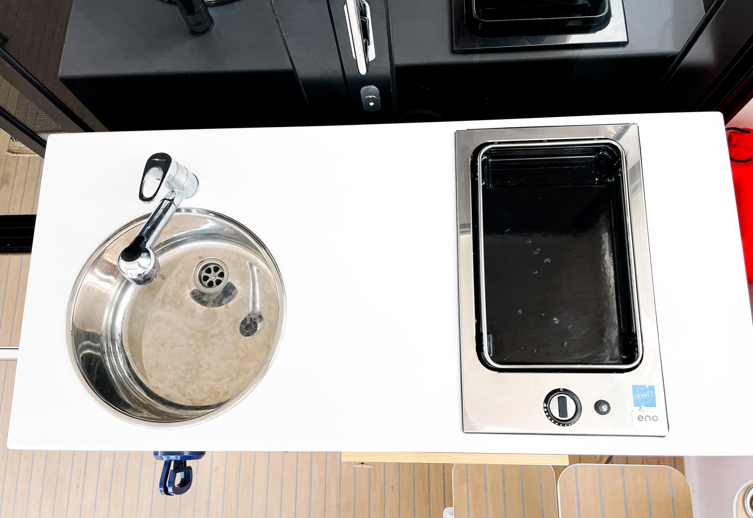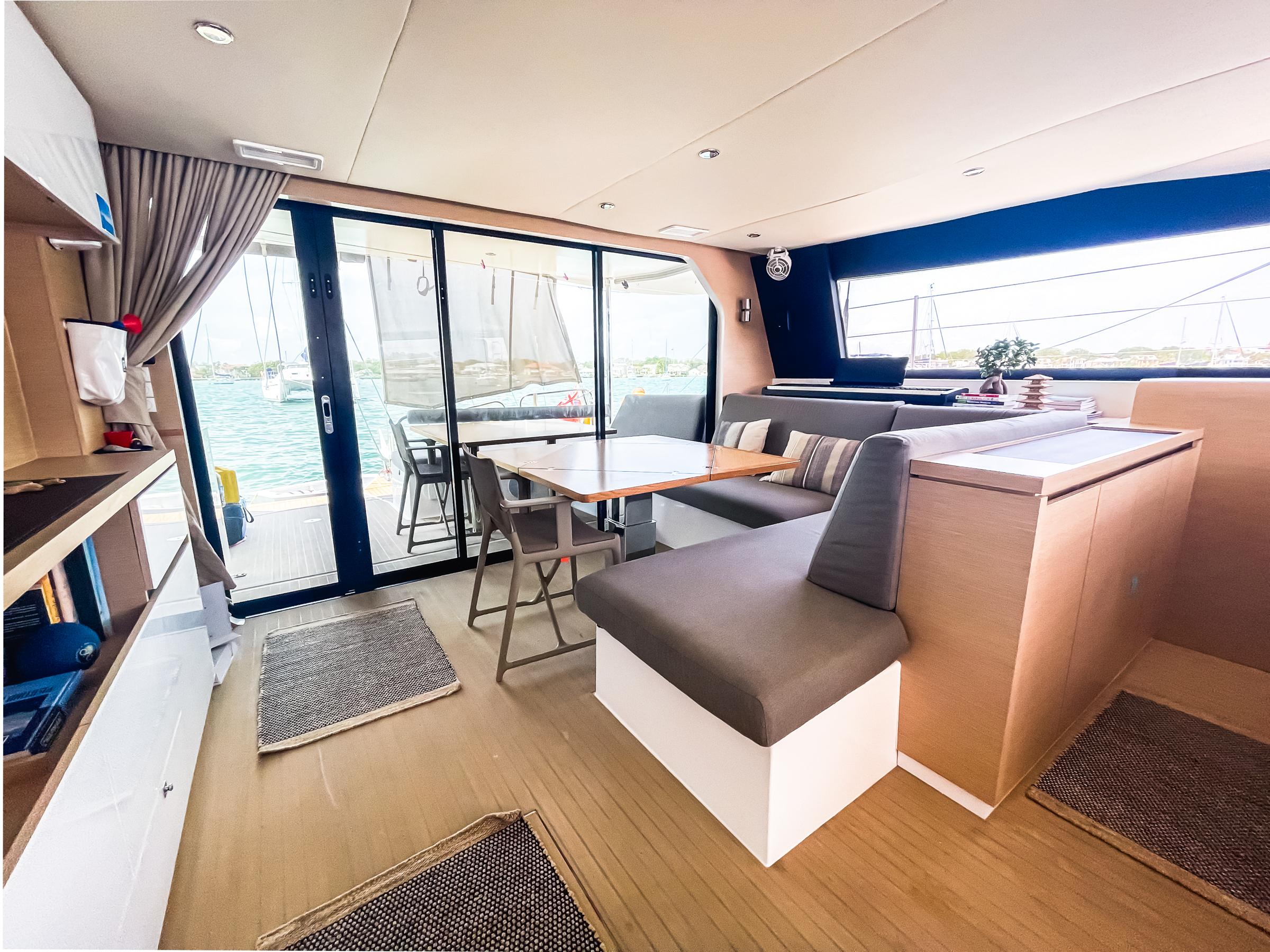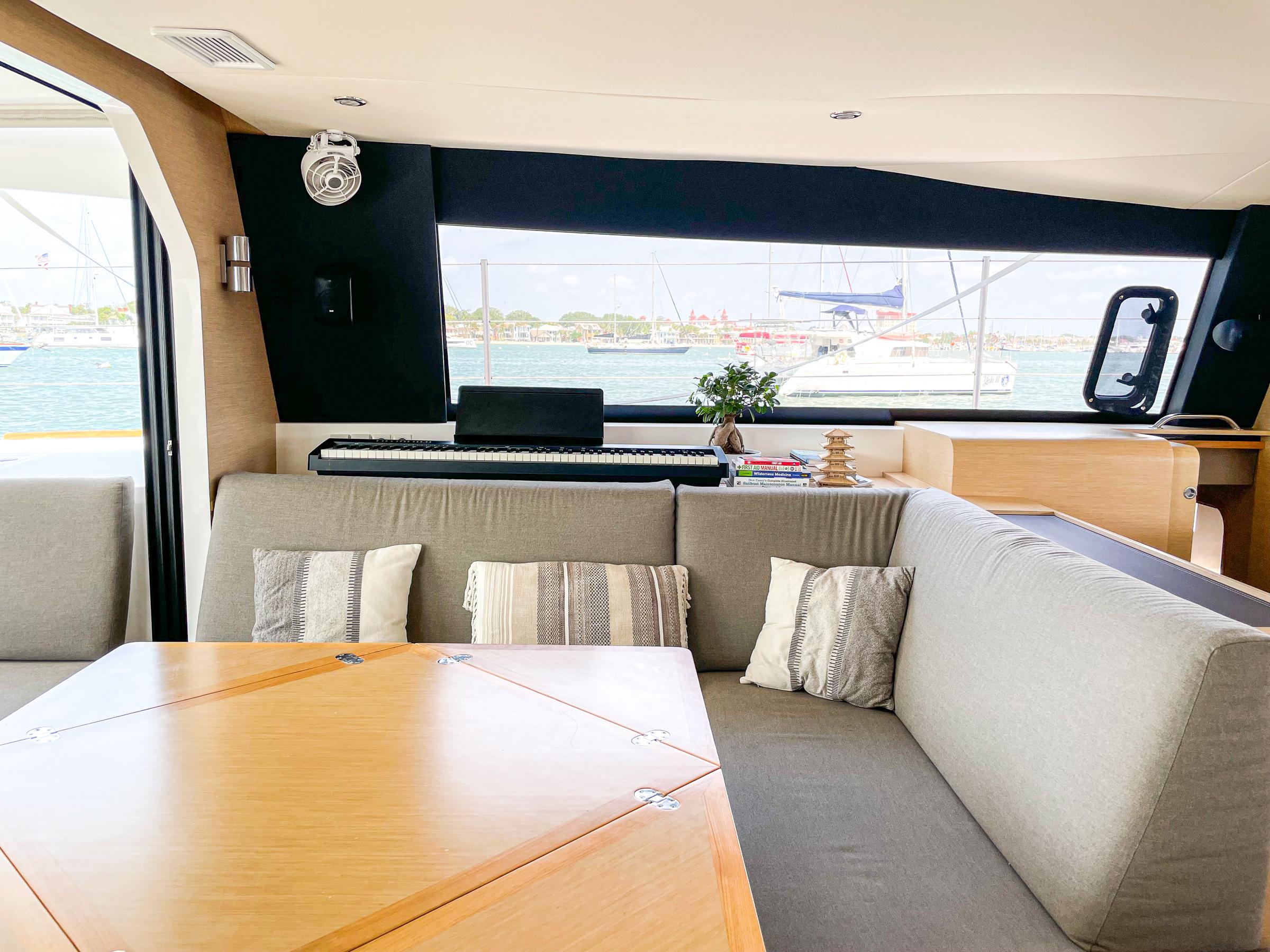 The spacious salon seamlessly integrates with the galley and cockpit area thanks to the 12ft wide sliding doors, creating a perfect open-concept space for relaxation and entertainment. Your guests will have easy access to a cold drink from the ice maker in the cockpit wet bar. The grill master will also be all smiles with the built in Eno gas Plancha. The cockpit table or the large convertible salon table can seat six adults each with plenty of elbow room. The ample comfortable seating provides a delightful setting for enjoying meals or entertaining guests.