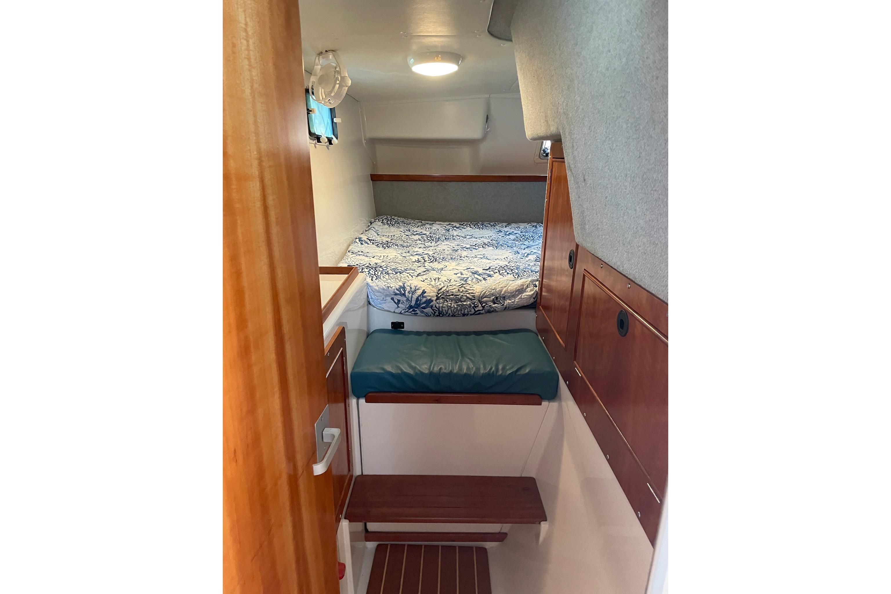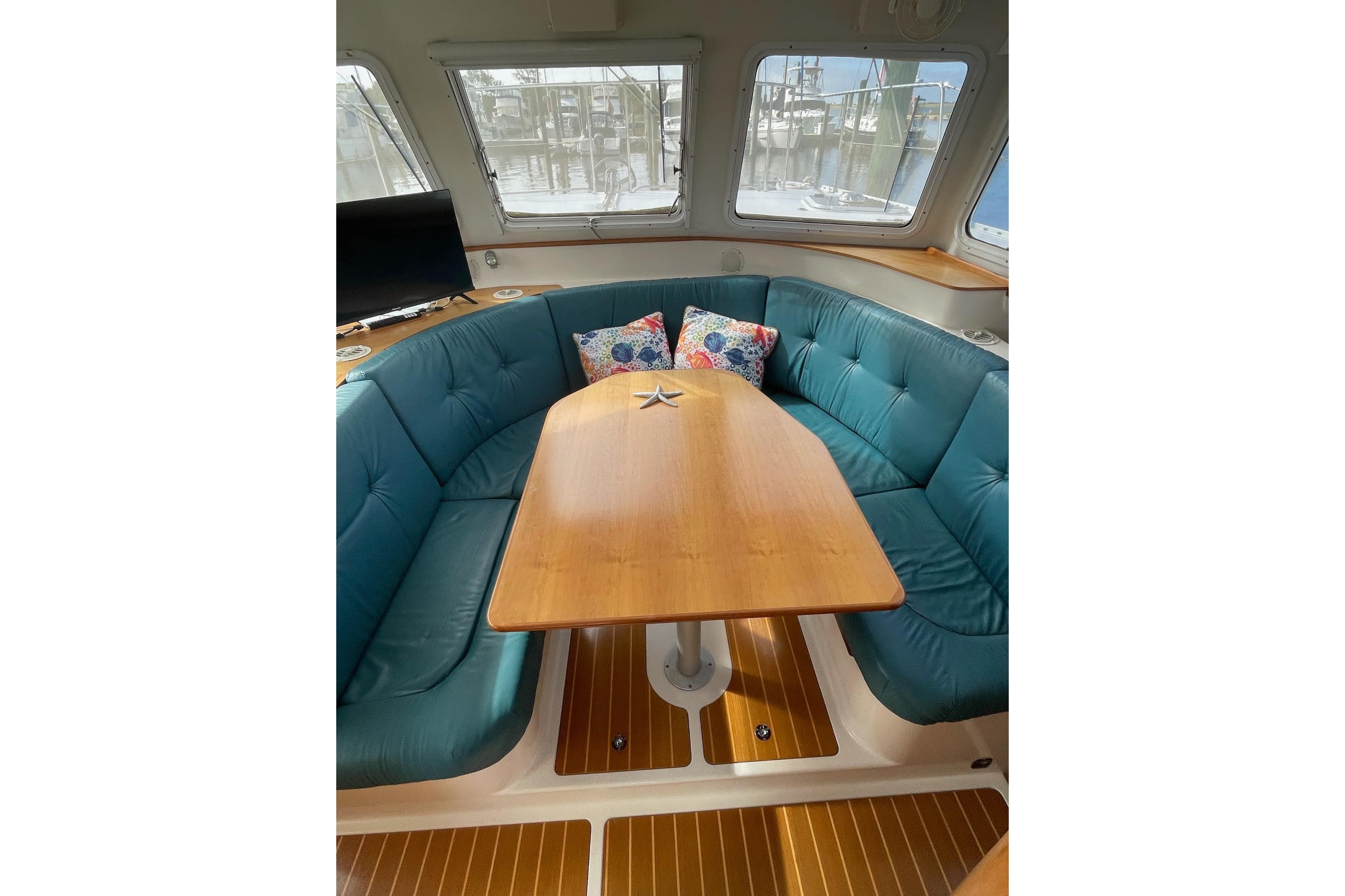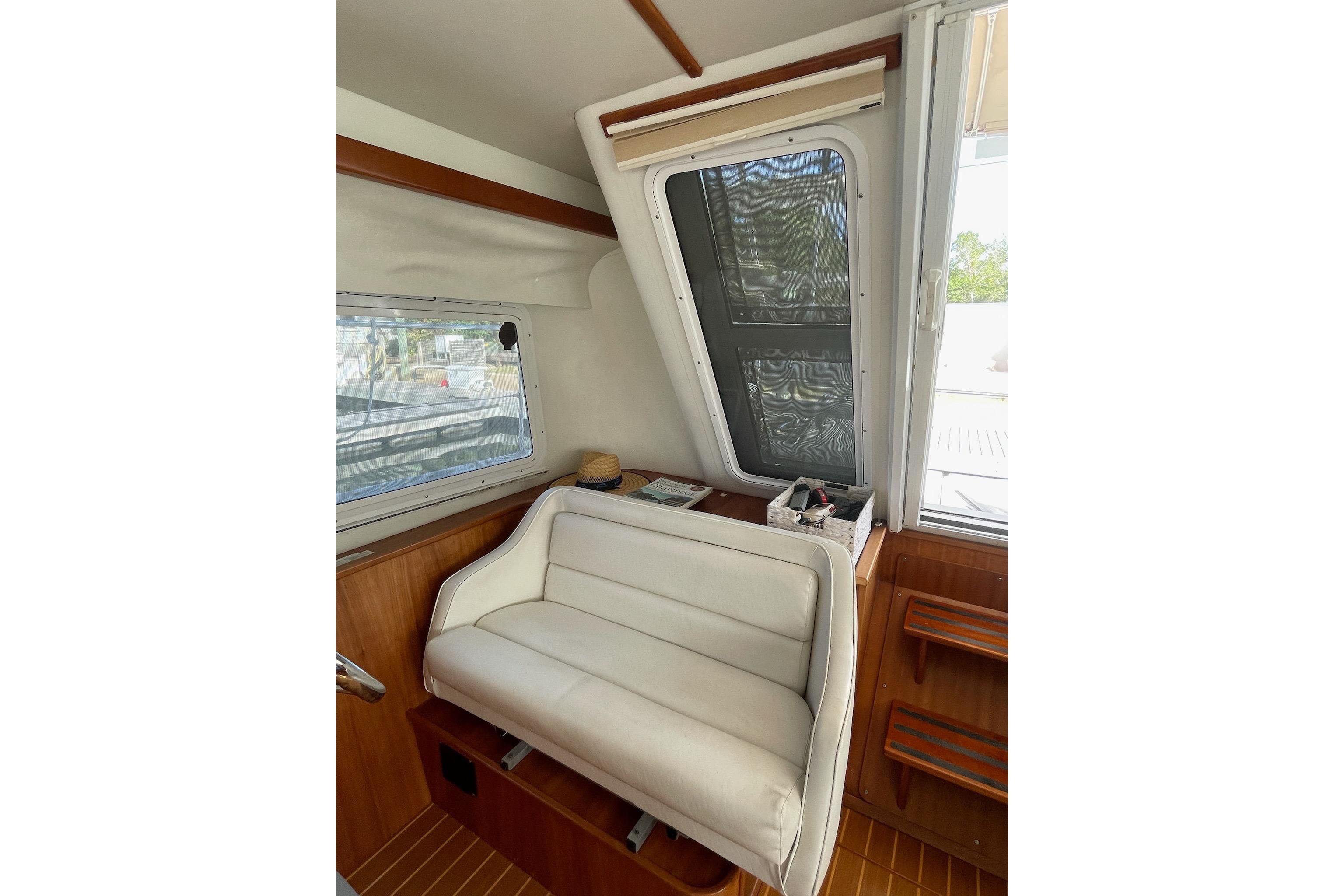 The Salon area of the MV/34 is one of her most appreciated features…With lots of large windows, excellent ventilation and comfortable seating, she is hard to beat…The Dinette Table can drop down to make a large, almost king size berth…The seating back in front of galley can be removed to provide a nice pass through and more visibility into the galley…The floors feature teak and holley. These owners have added area rugs.