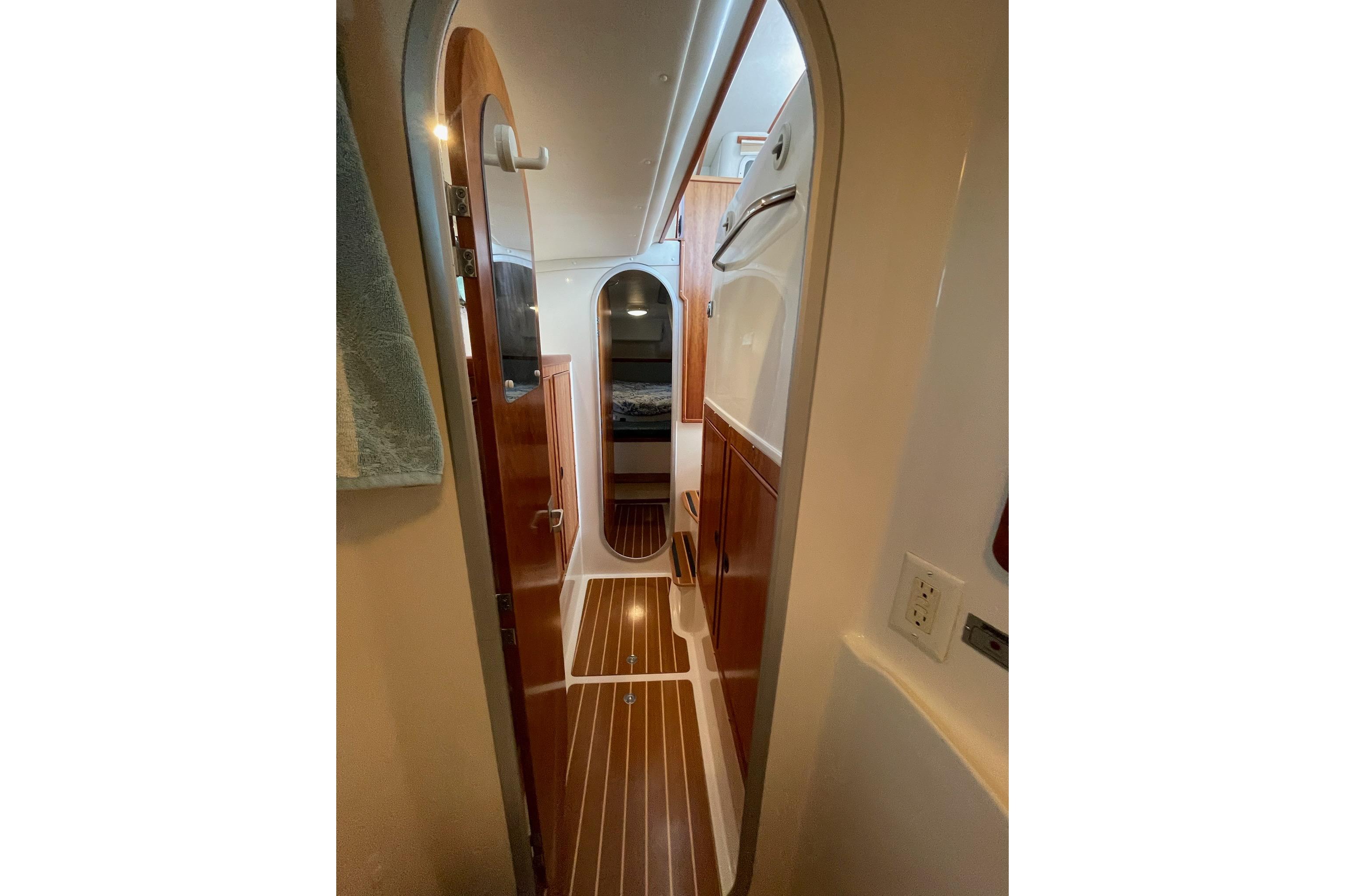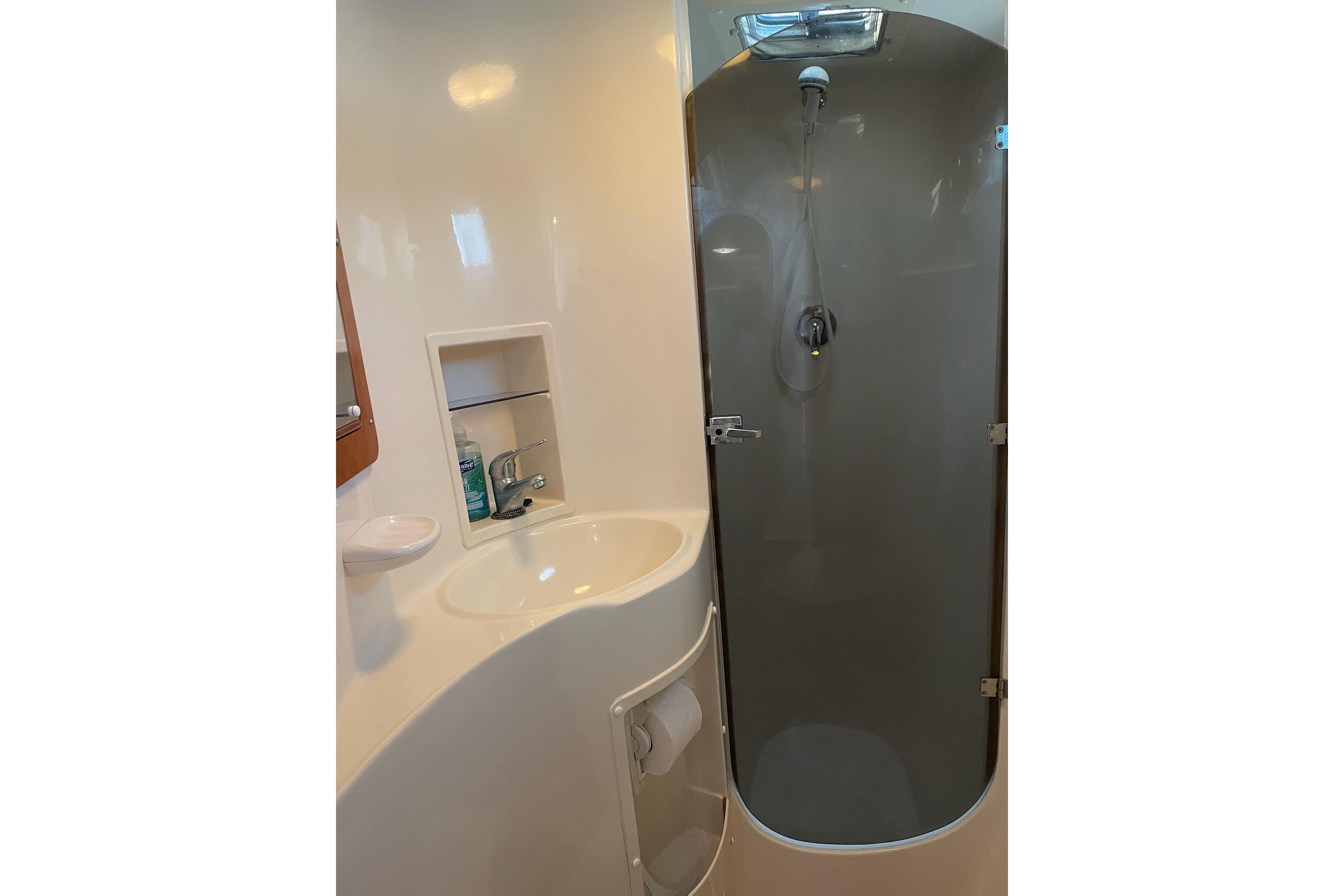 The Head is located on the Starboard Side forward…It contains convenient storage spaces, electric toilet and the separate stall shower…