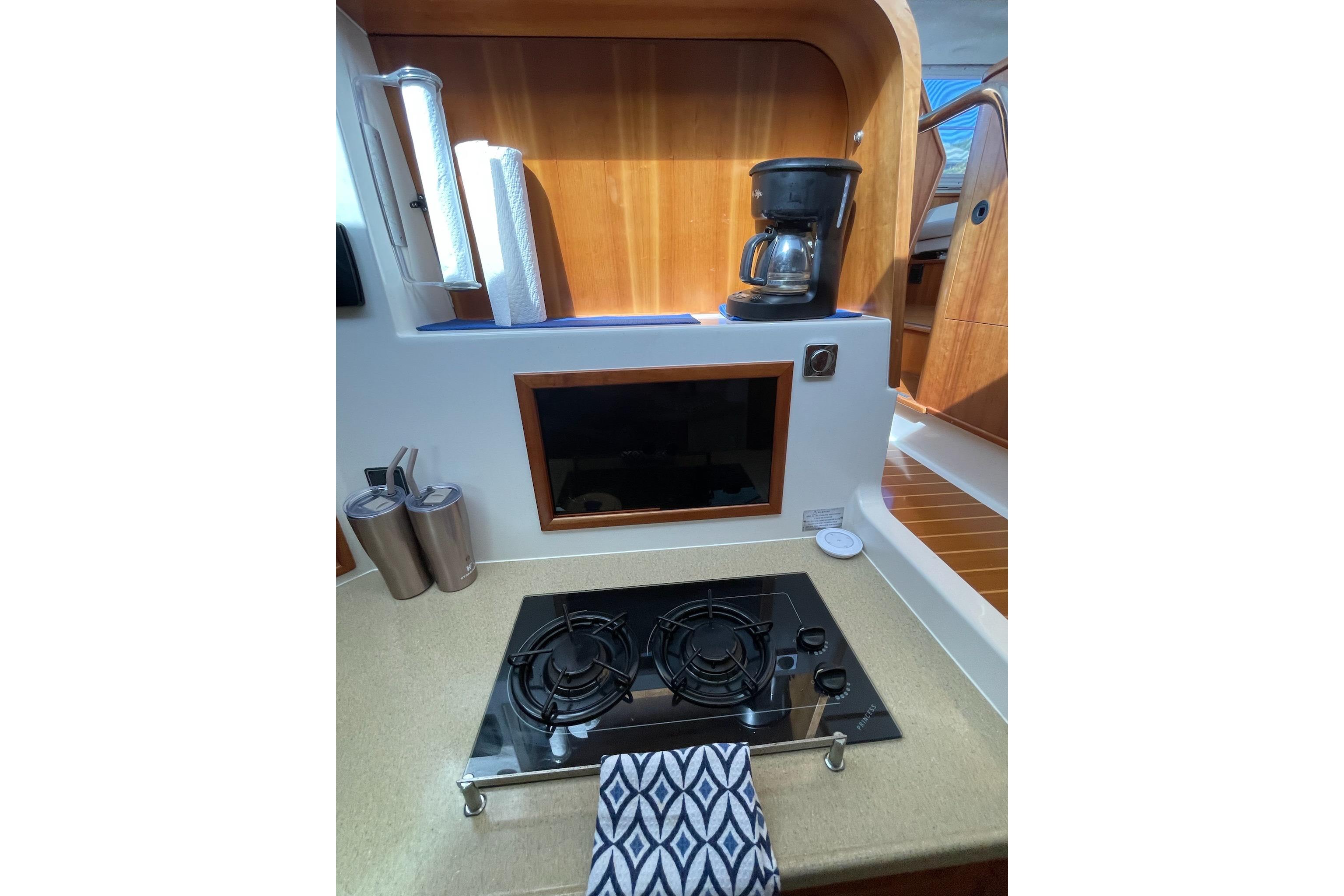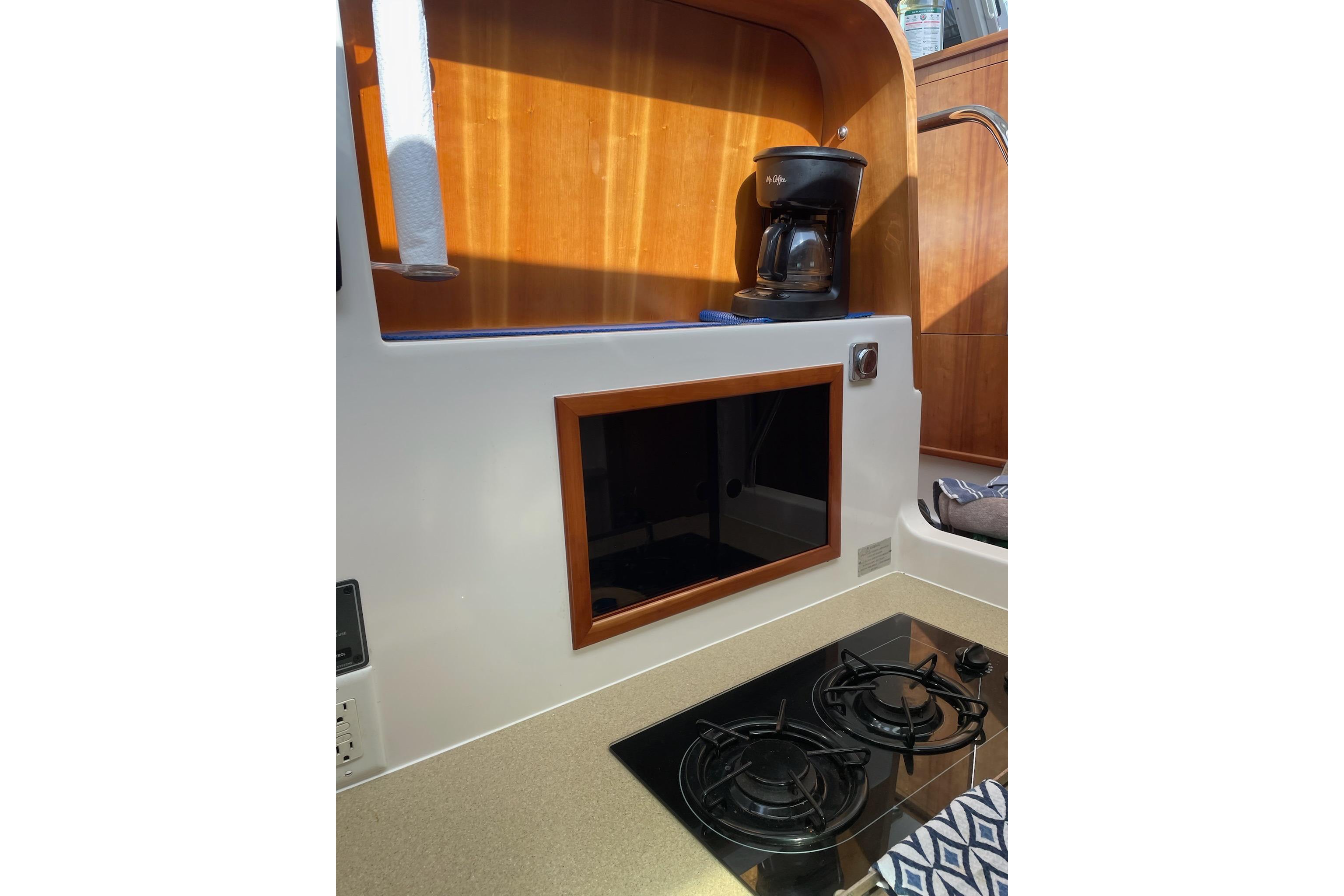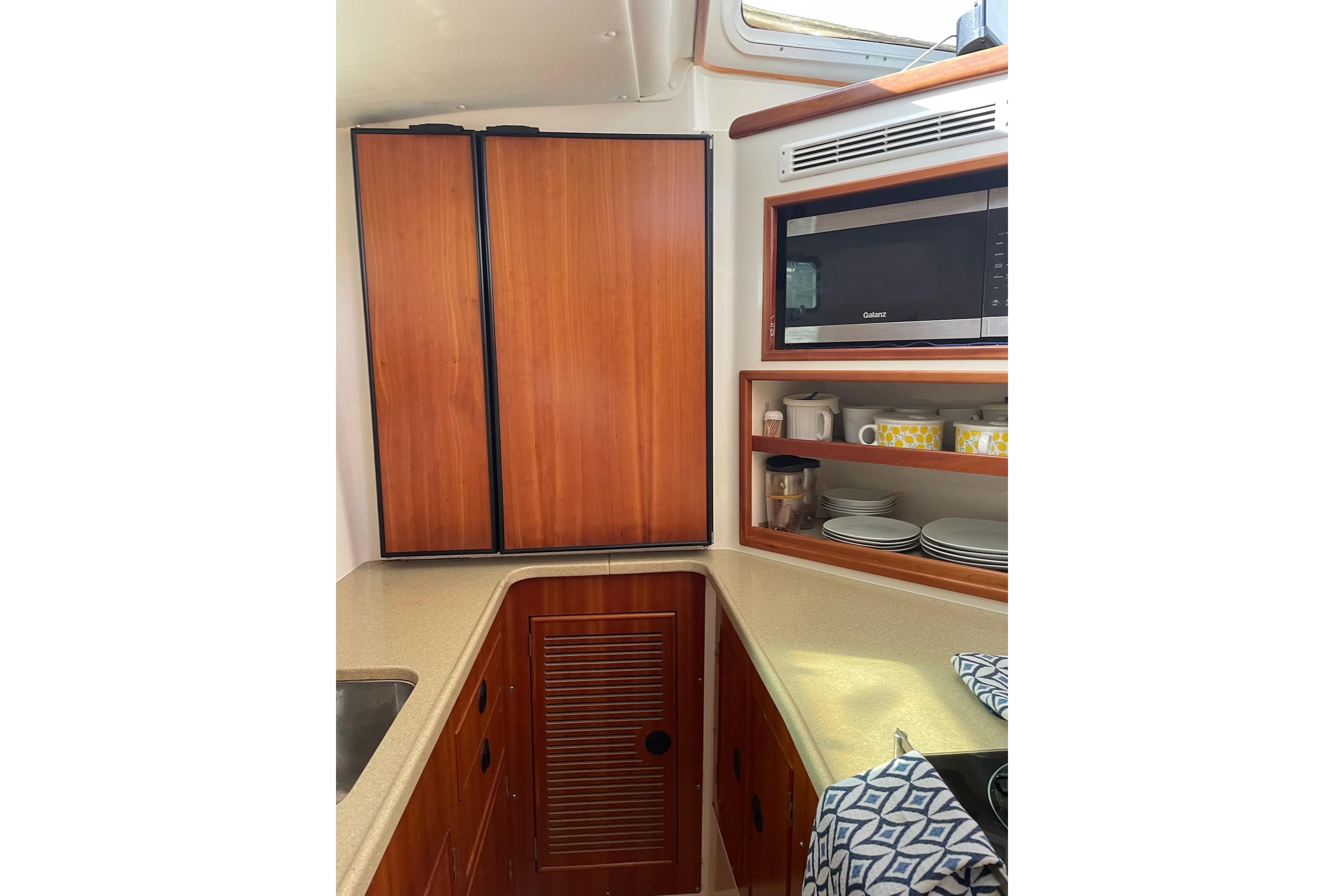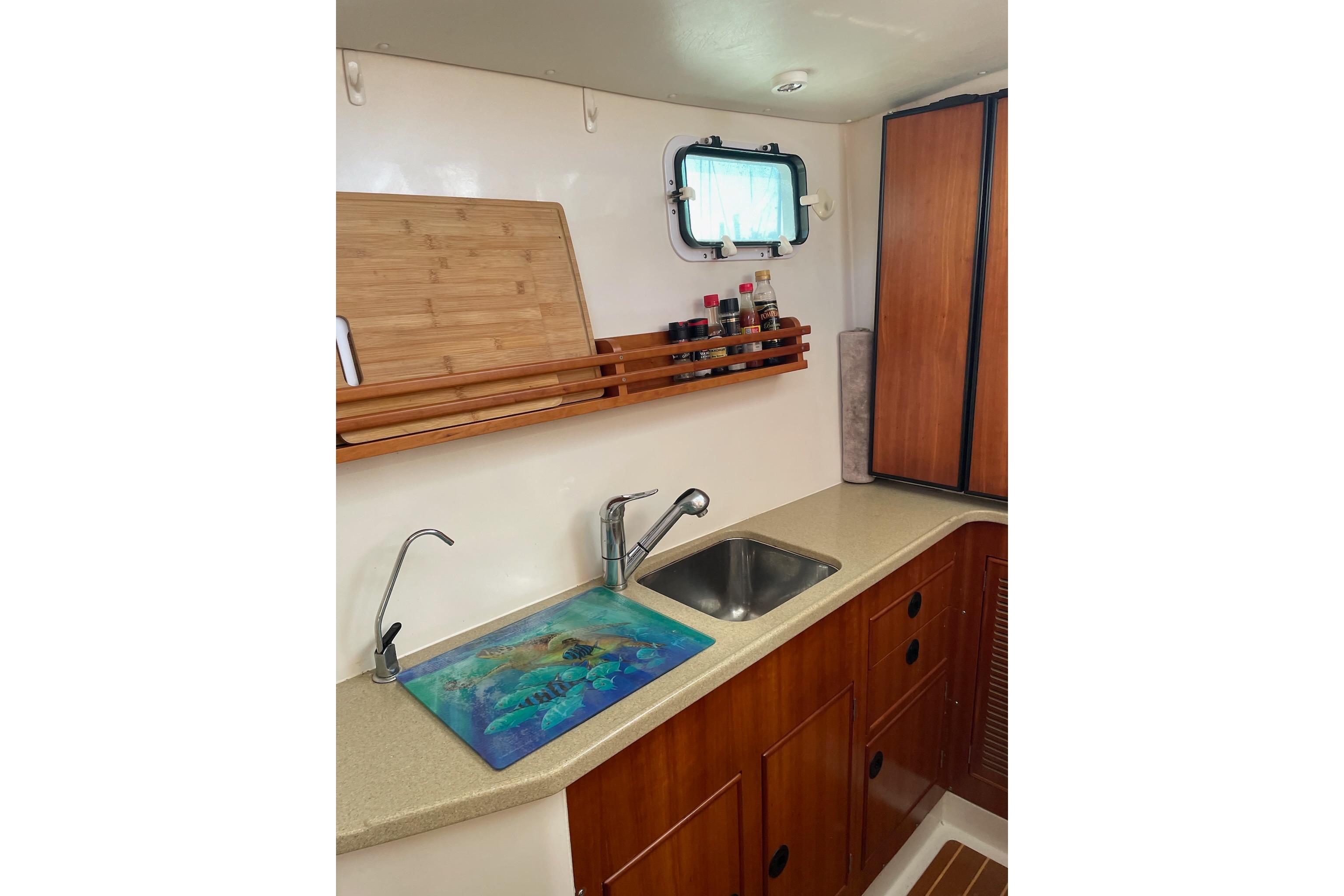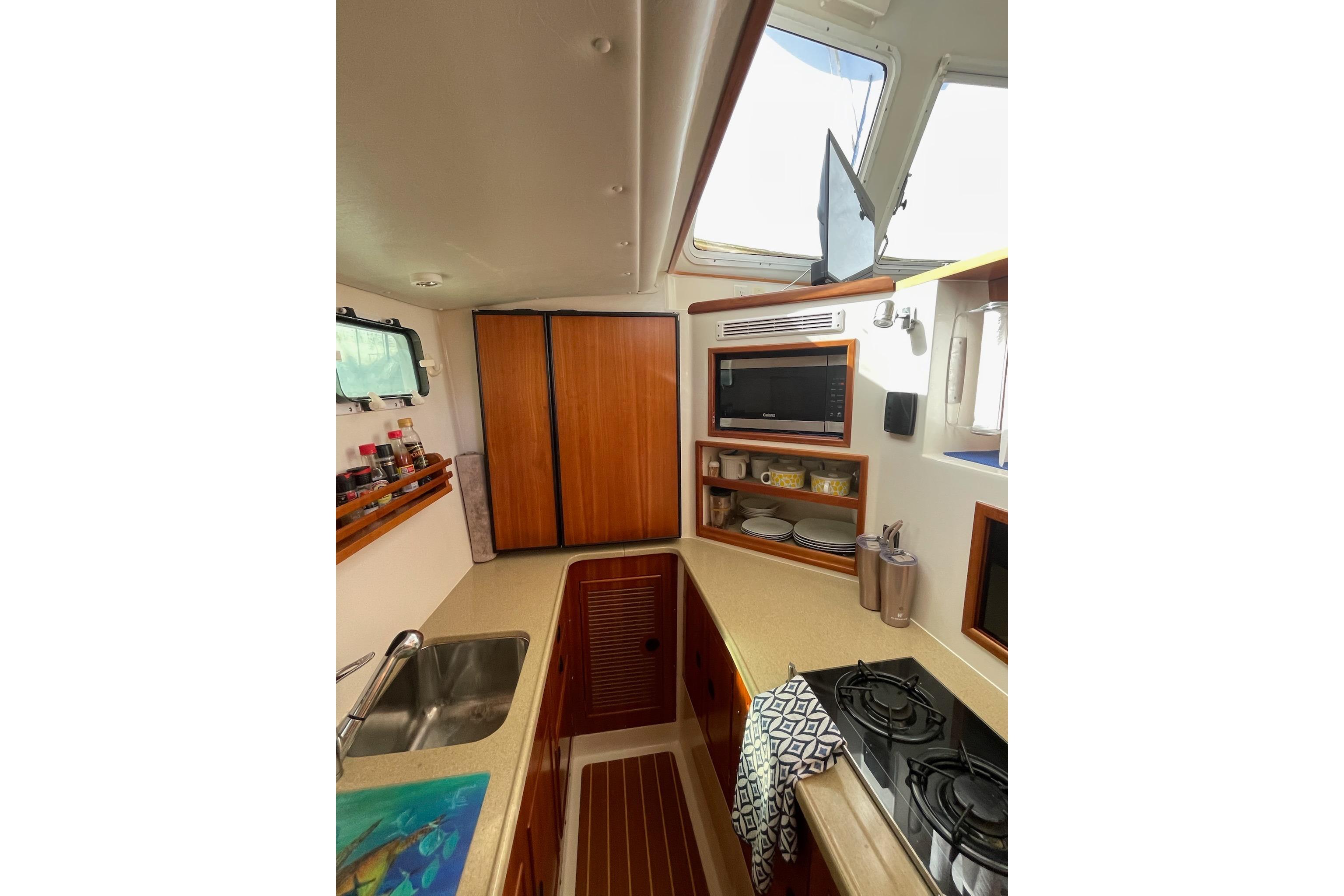 The Galley is well laid out and uses its space very efficiently…The 2005 galley provides almost twice as much usuable space as previous models…It is located midship in the port hull…The Galley is open to the Salon and Dinette area and provides good ventilation and ease in socializing with people in the Salon while performing Galley chores…